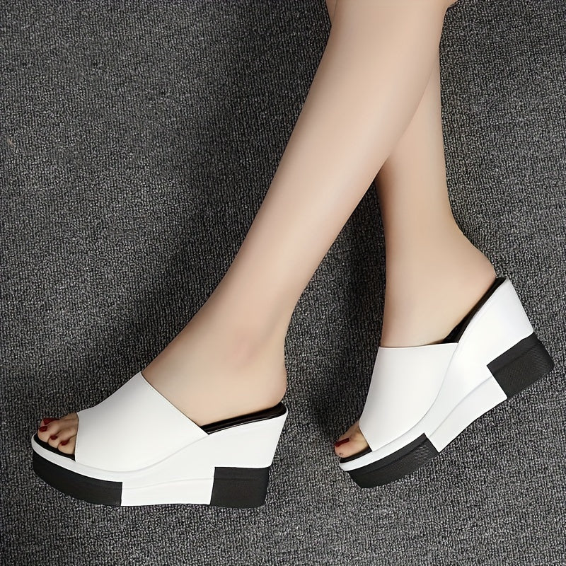 Yozgi qulaylik uchun qalin taglik va soxta qoplama tasmalari bilan qora va oq peep-toe wedge sandallar