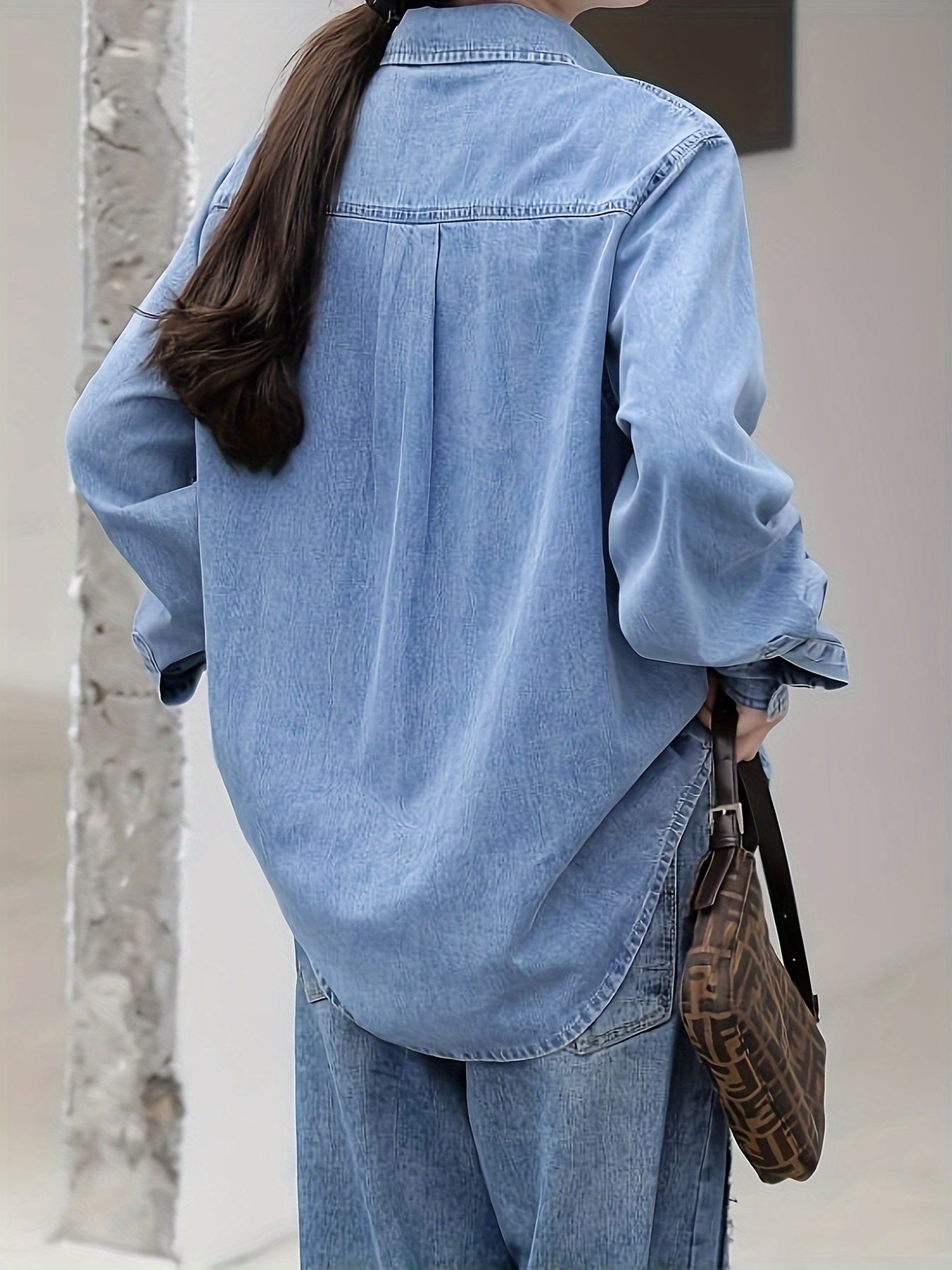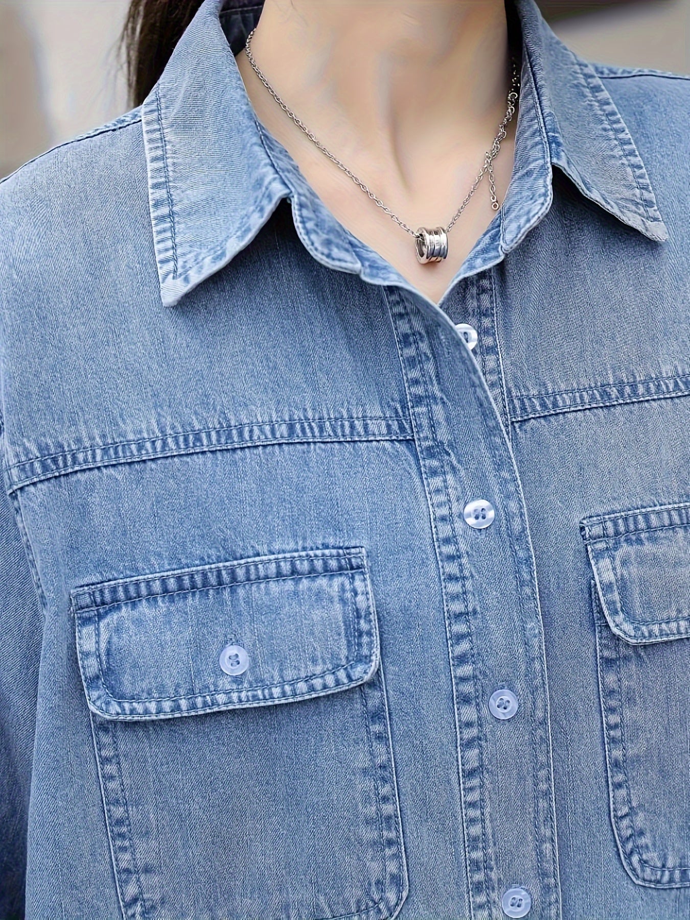 Klassik uslubdagi, yengil ko'k denim jakkasi, lapel yaka va cho'ntaklar bilan, ayollar uchun.
