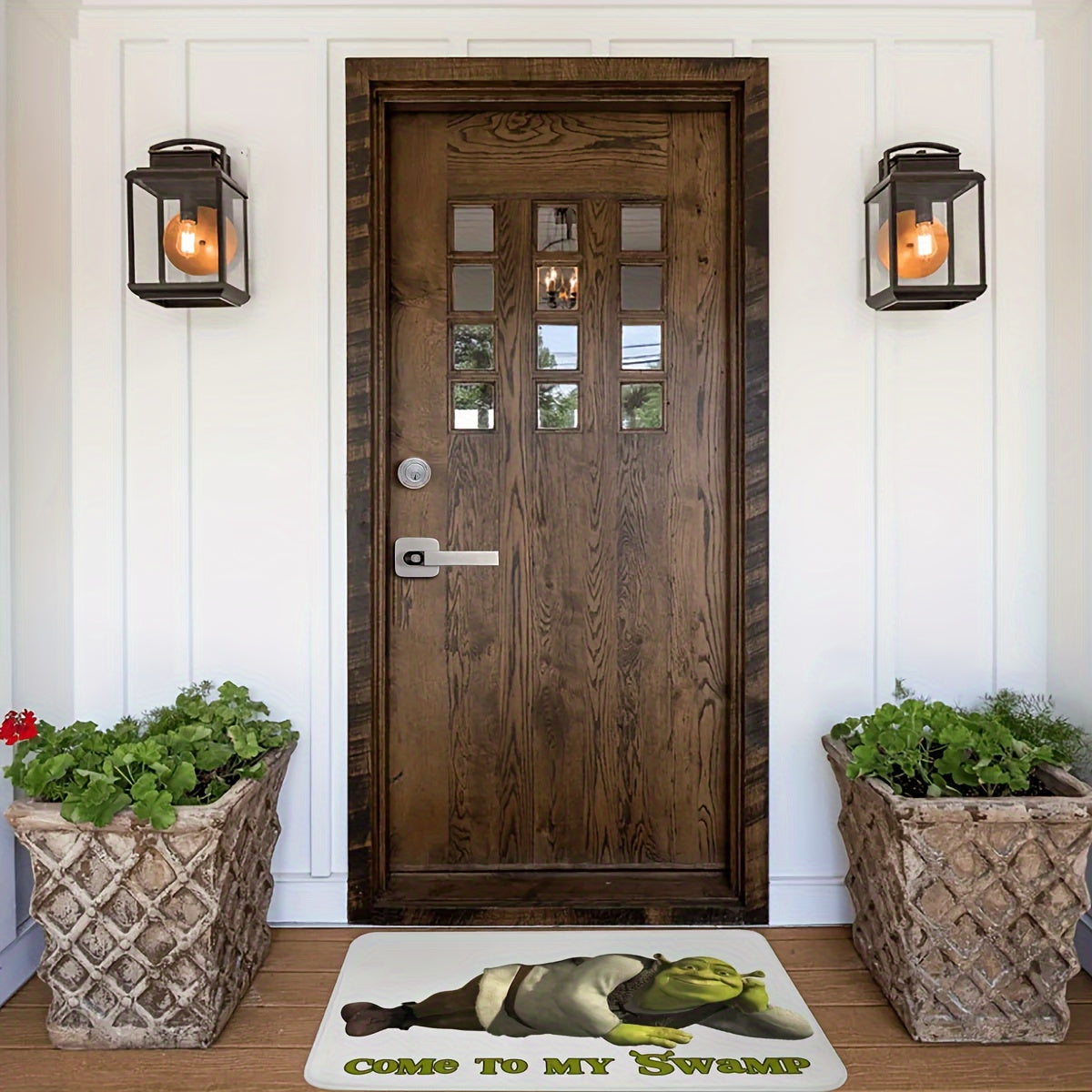 "Shrek ilhomlangan bu eshik to'sig'i bilan botqoqlikning bir bo'lagini uyga olib keling - Yuqori sifatli polyesterdan tayyorlangan, tozalash oson, kirish joylari, oshxonalar va yotoqxonalarda ichki va tashqi foydalanish uchun ideal"