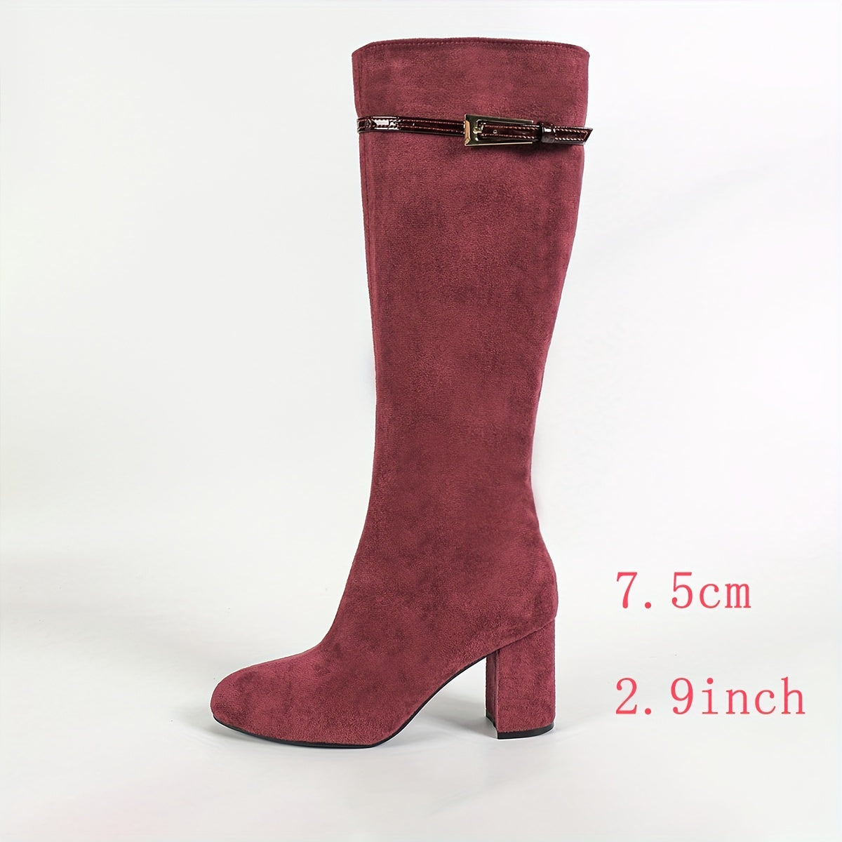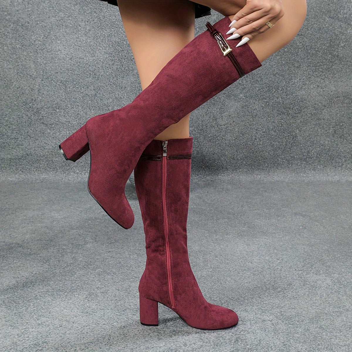 Qorqinchali qish uchun yumaloq burchakli tizzaga qadar bo'lgan Burgundy botinkalar, zippersi va blok poyabzal bilan