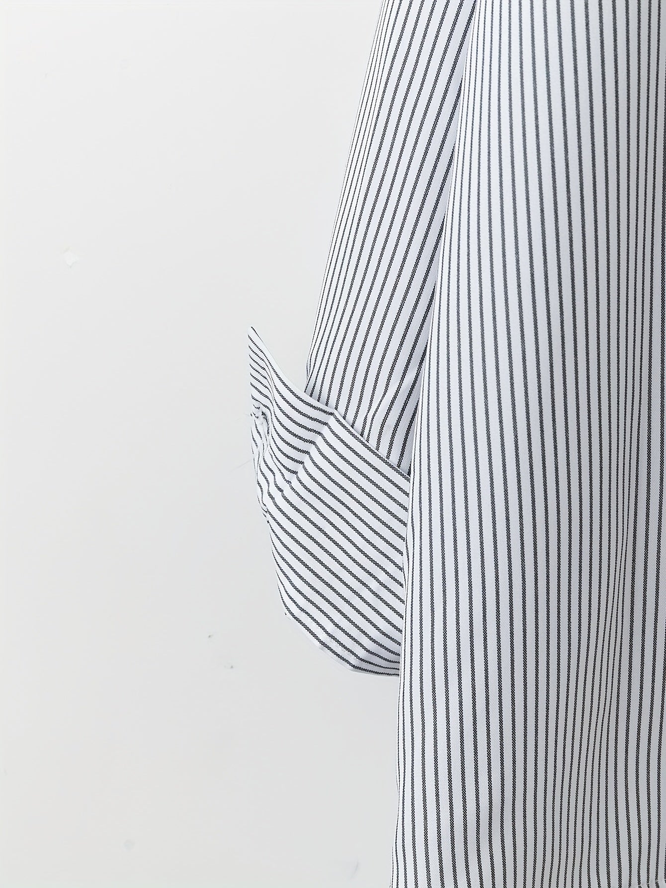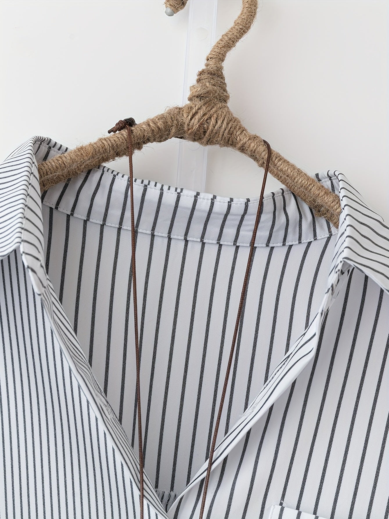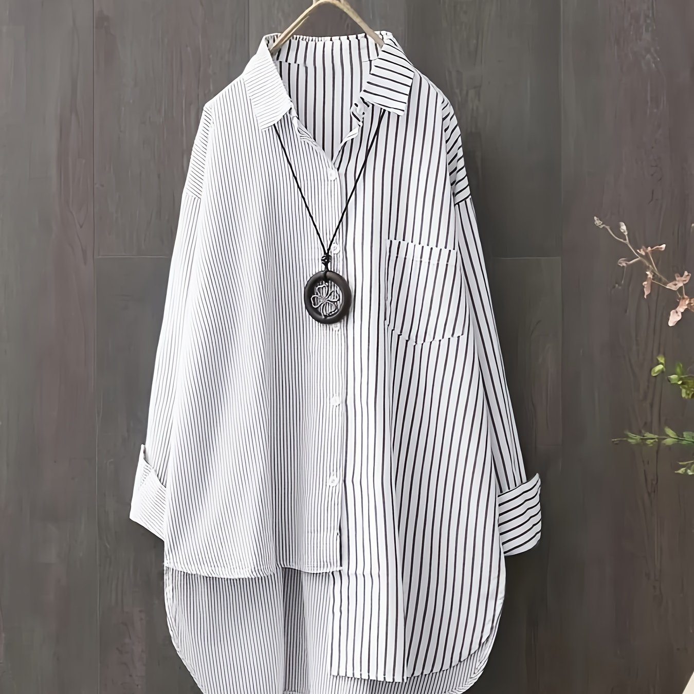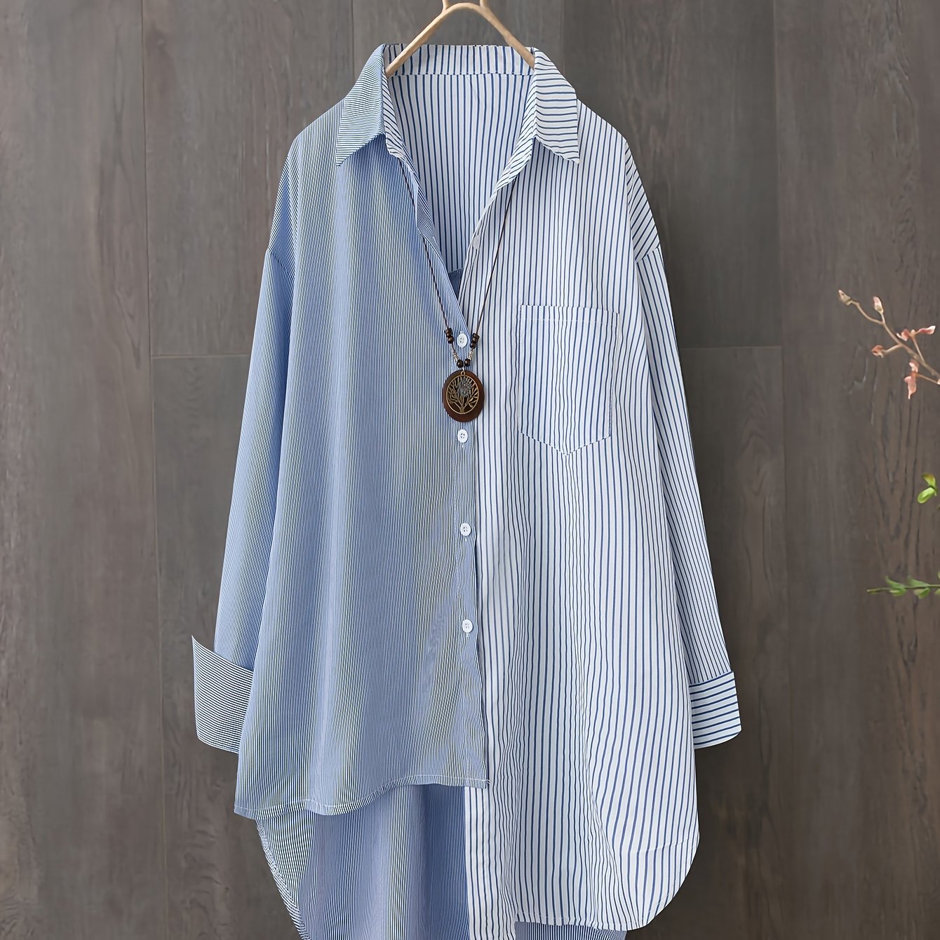 Tugmachali yaka ko'ylak, asimmetrik chiziqlar bilan, odatdagi uzunlikda, plussiz ayollar uchun cho'zilmaydigan matodan, barcha fasllar uchun mos.