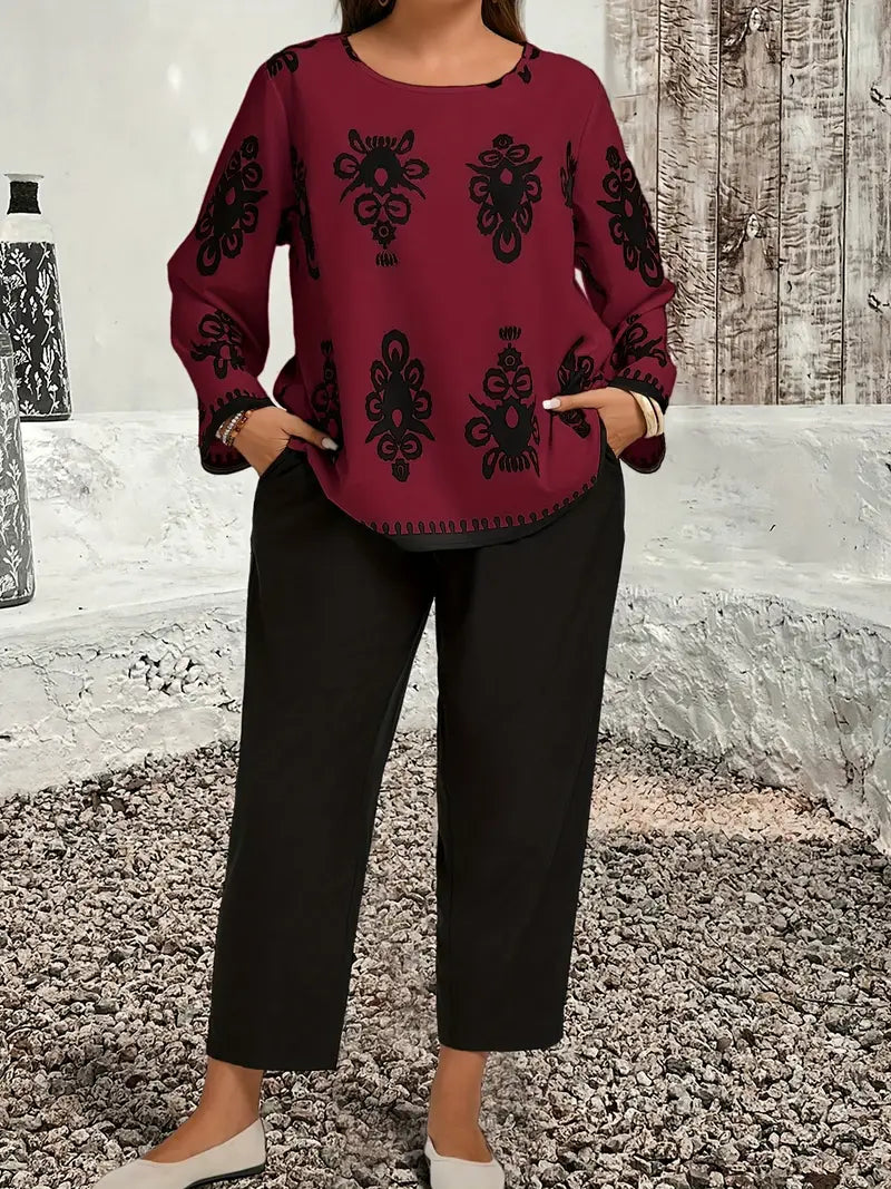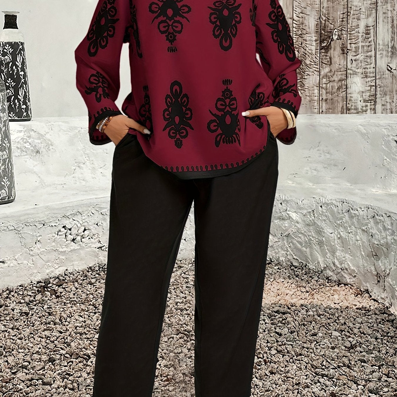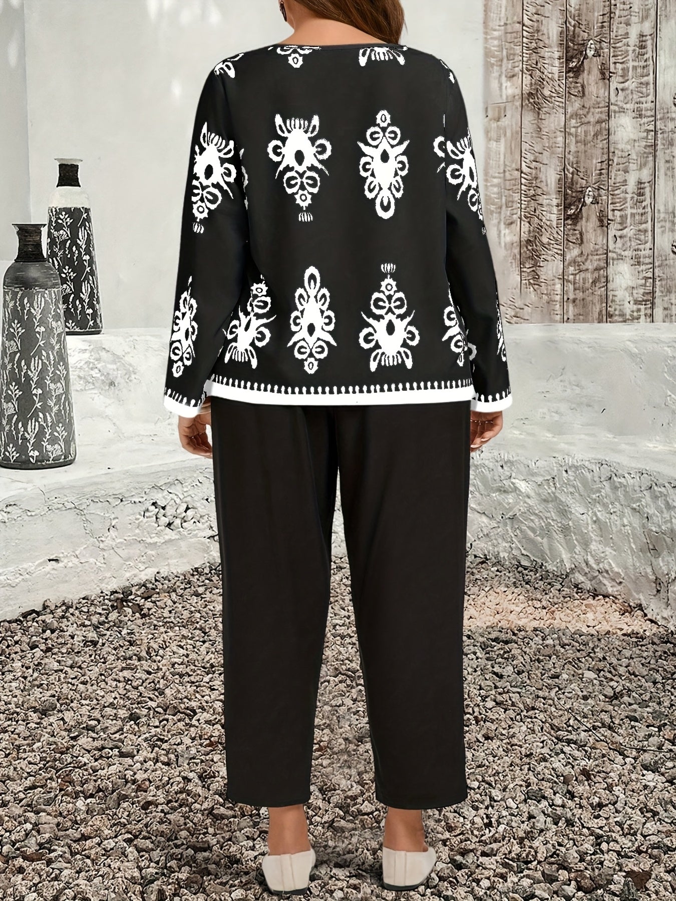 Kuchli geometrik bosma bilan kundalik kiyimlar to'plami, uzun qo'lqopli ko'ylak va shimlar, kuz uchun