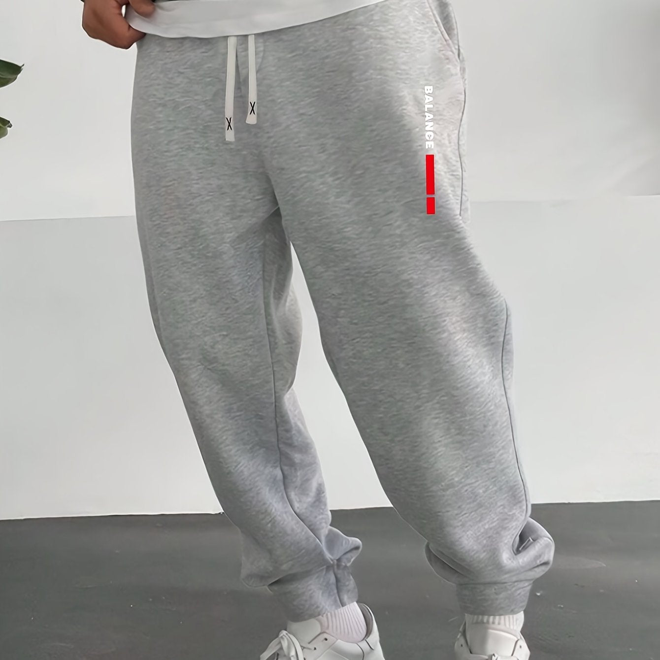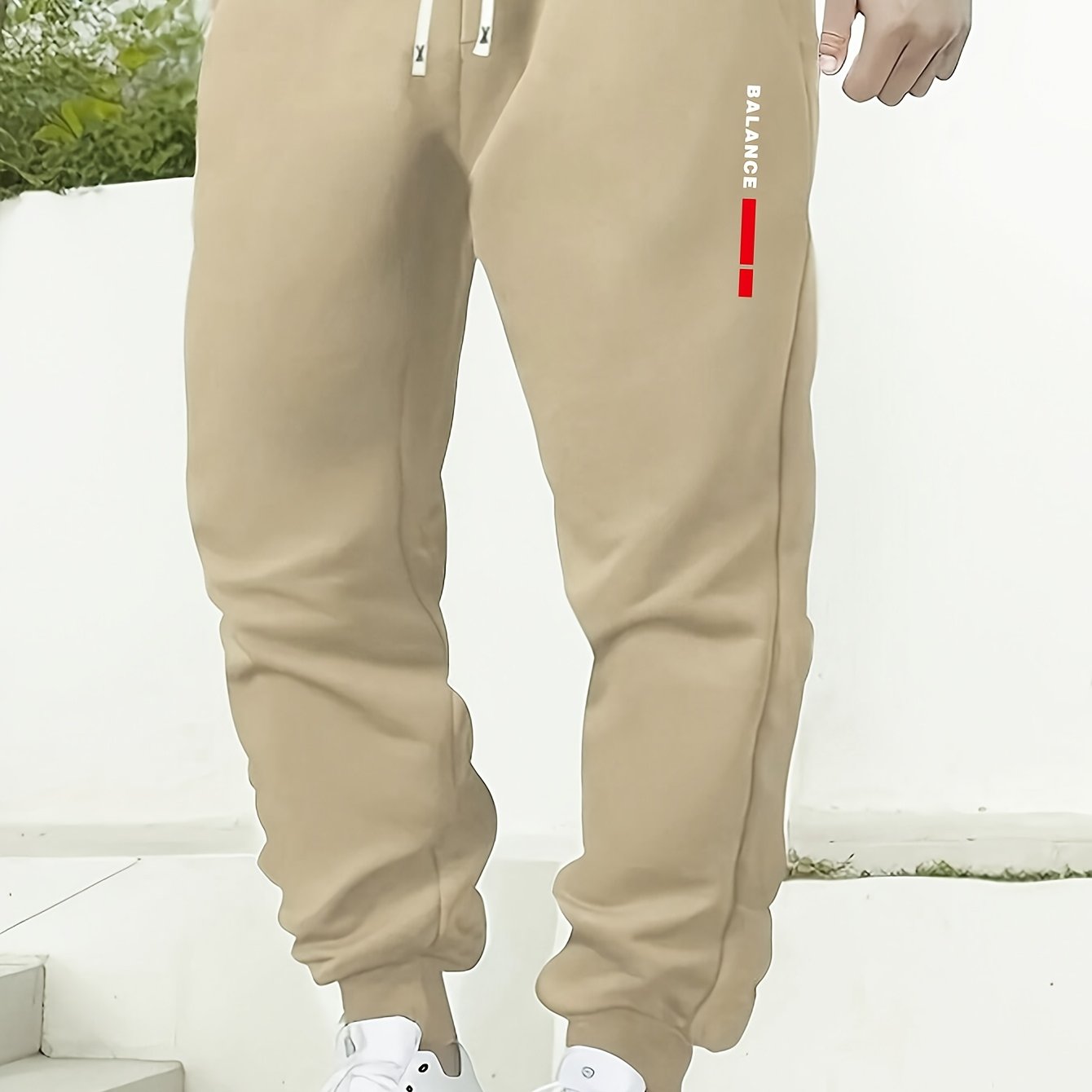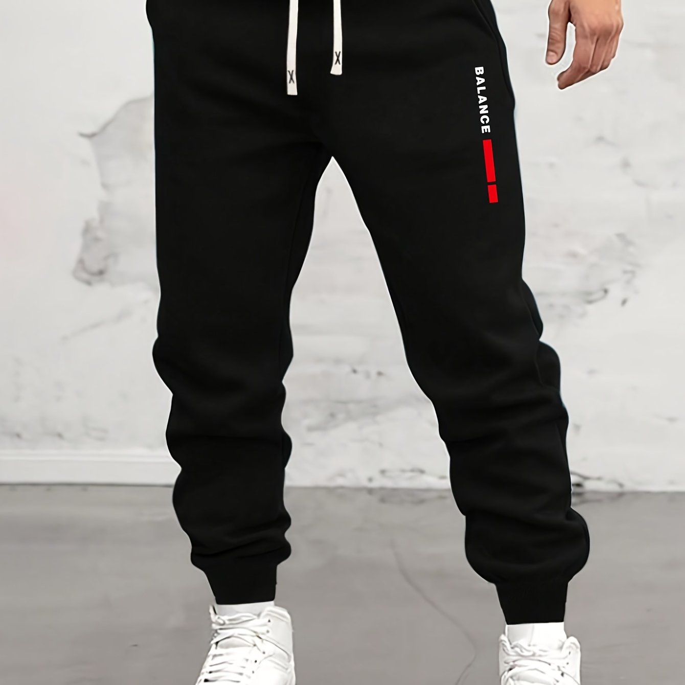 Erkaklar uchun tasodifiy sport shimlari, harflar bosma, polyester to'qima matodan tayyorlangan, cho'ziluvchan. Oddiy kesim, tortishqichli bel, kuz/qish mavsumi uchun qulay.