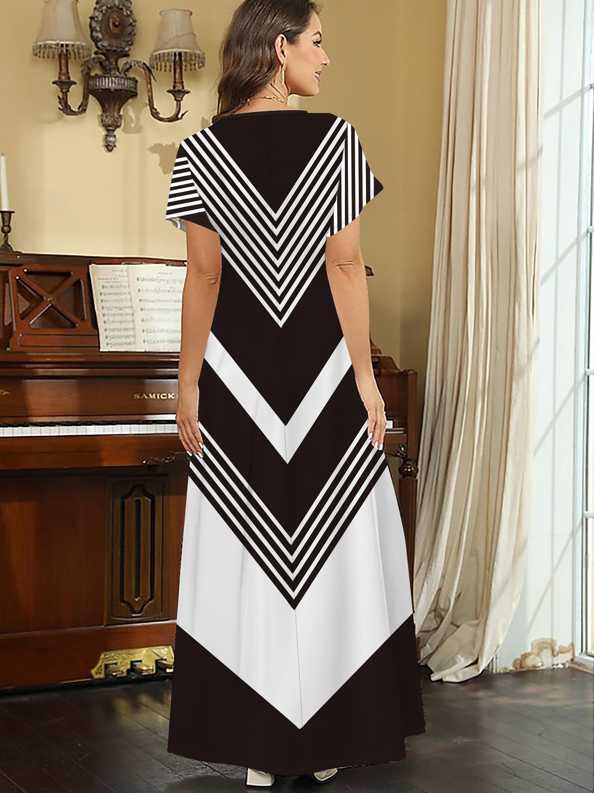 Geometrik naqshli, V-shaklida bo'ylama, yon yirtilishi bilan tasodifiy plussayz libos. Elastik polyester aralashmasidan tayyorlangan, mashinada yuvish mumkin.