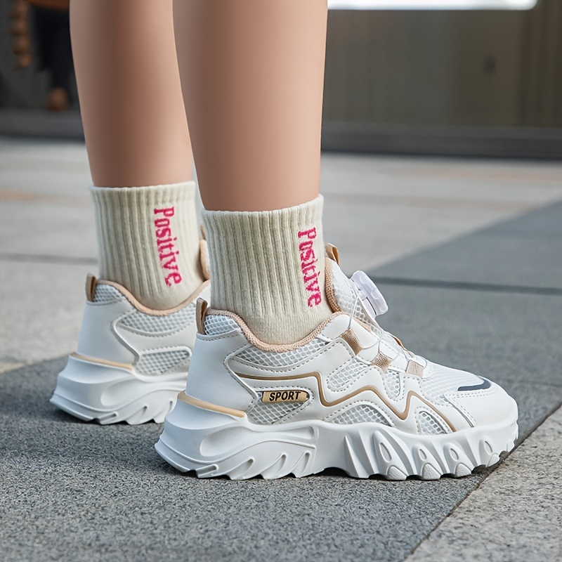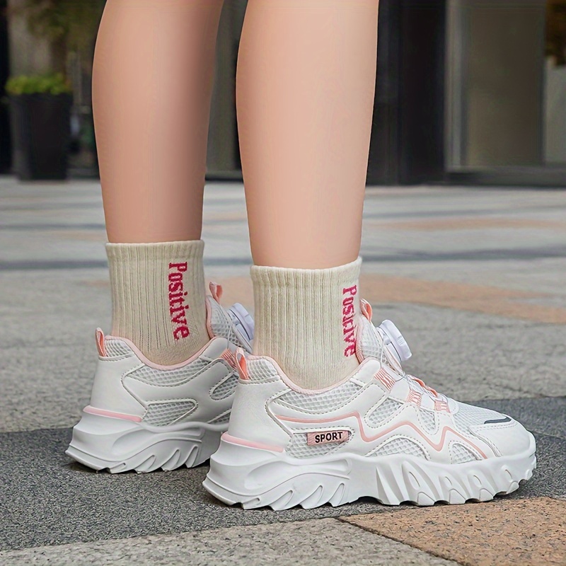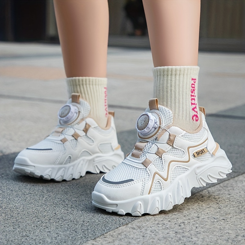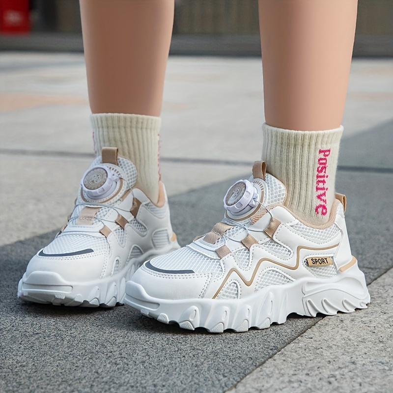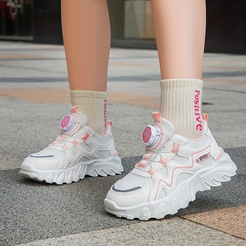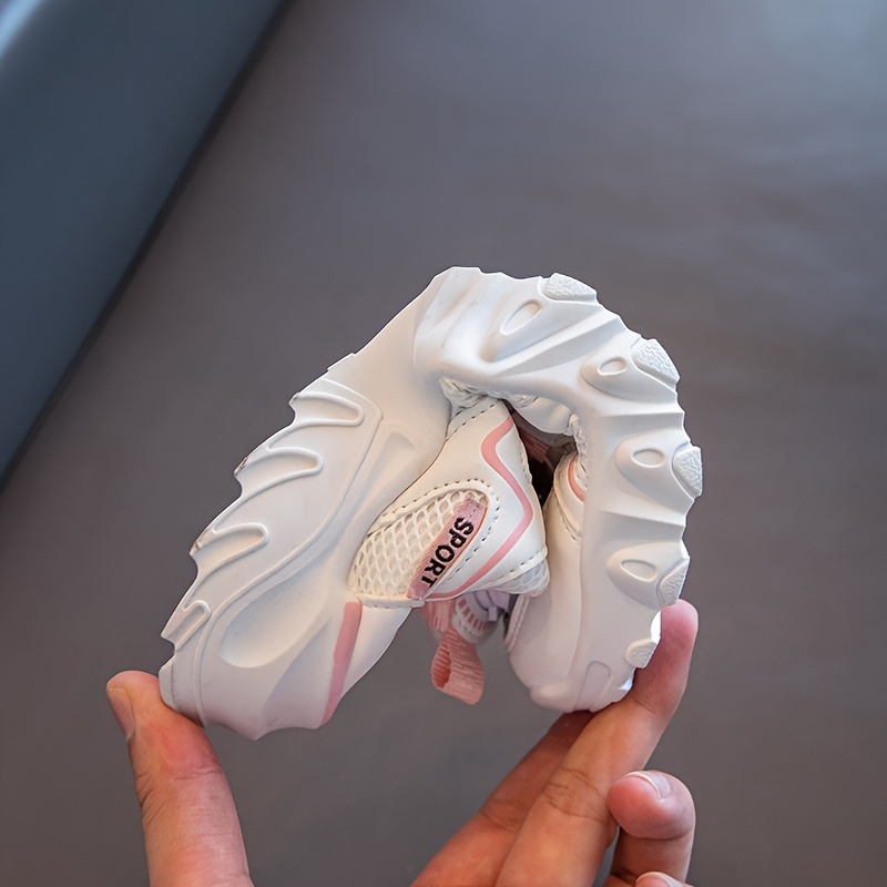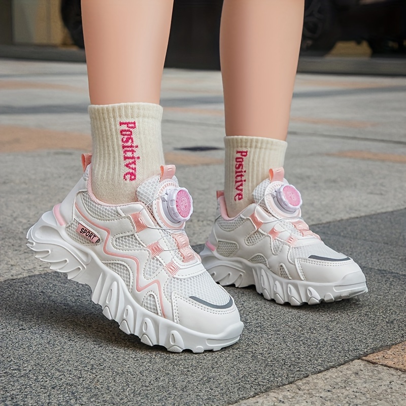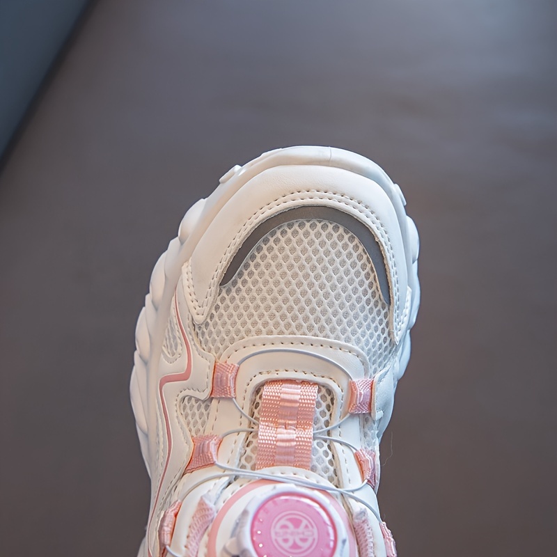 Oq rangda, pushti va qora aksentlar bilan erkaklar va ayollar uchun tasodifiy yugurish poyabzallari. Havo o'tkazuvchi to'r, dumaloq barmoq, past yuqori, aylanuvchi tugma yopilishi. Kundalik kiyish uchun sport uslubi. Mustahkam sport.