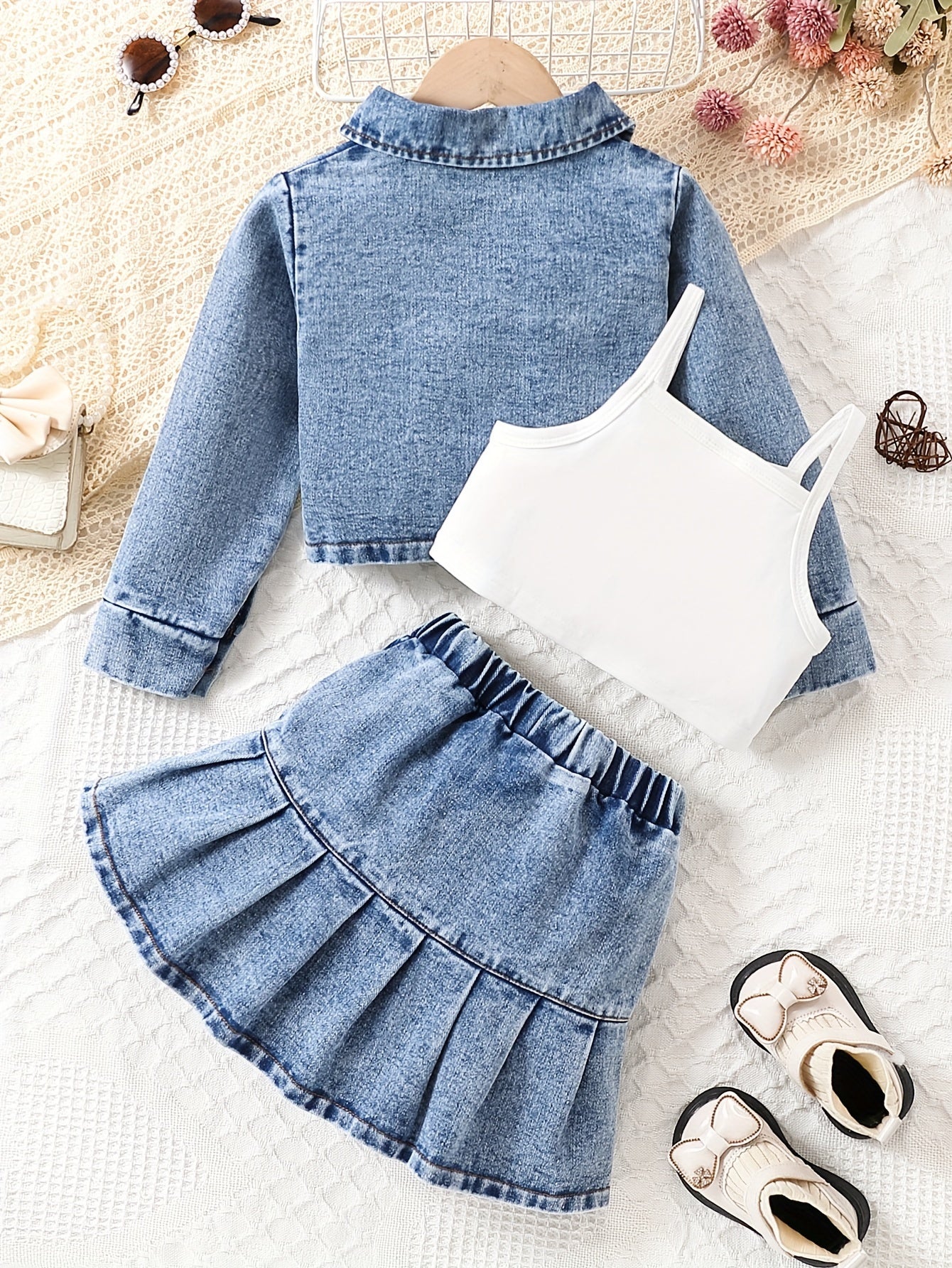 Chic Girls' 3-qismli denim to'plami, oq kamizol, ruffle tafsilotlari bilan denim jilet va pliseli yubka. Mashinada yuvish mumkin, bahor/kovak uchun ideal.