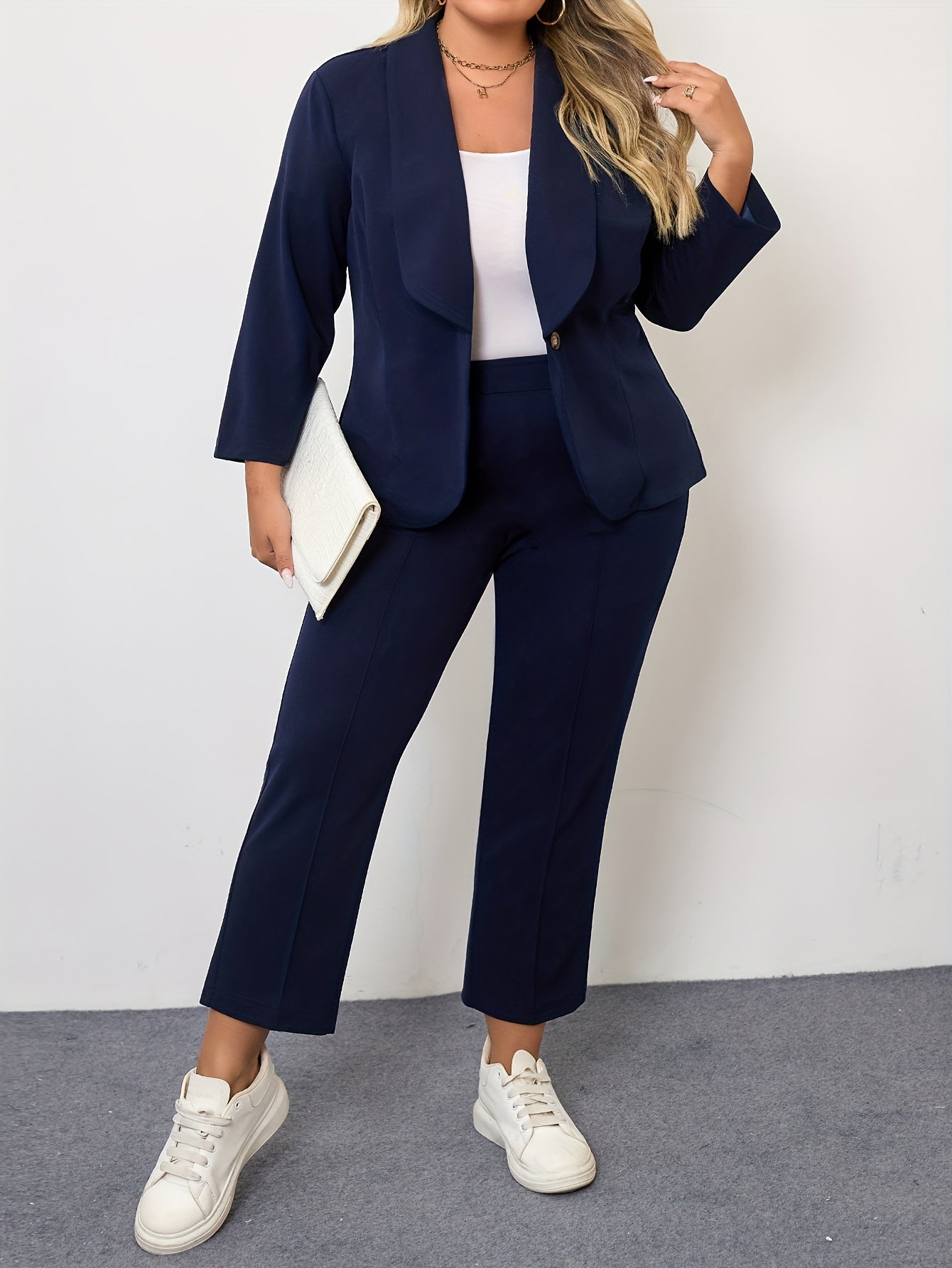 Chic Plus Size Mustahkam Blazer va Shimlar To'plami - Cho'ziluvchan, Mashinada Yuvish Mumkin, Har Mavsumda Foydalanish Uchun Mos