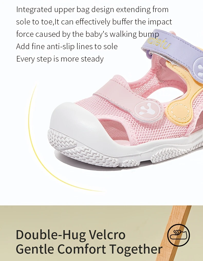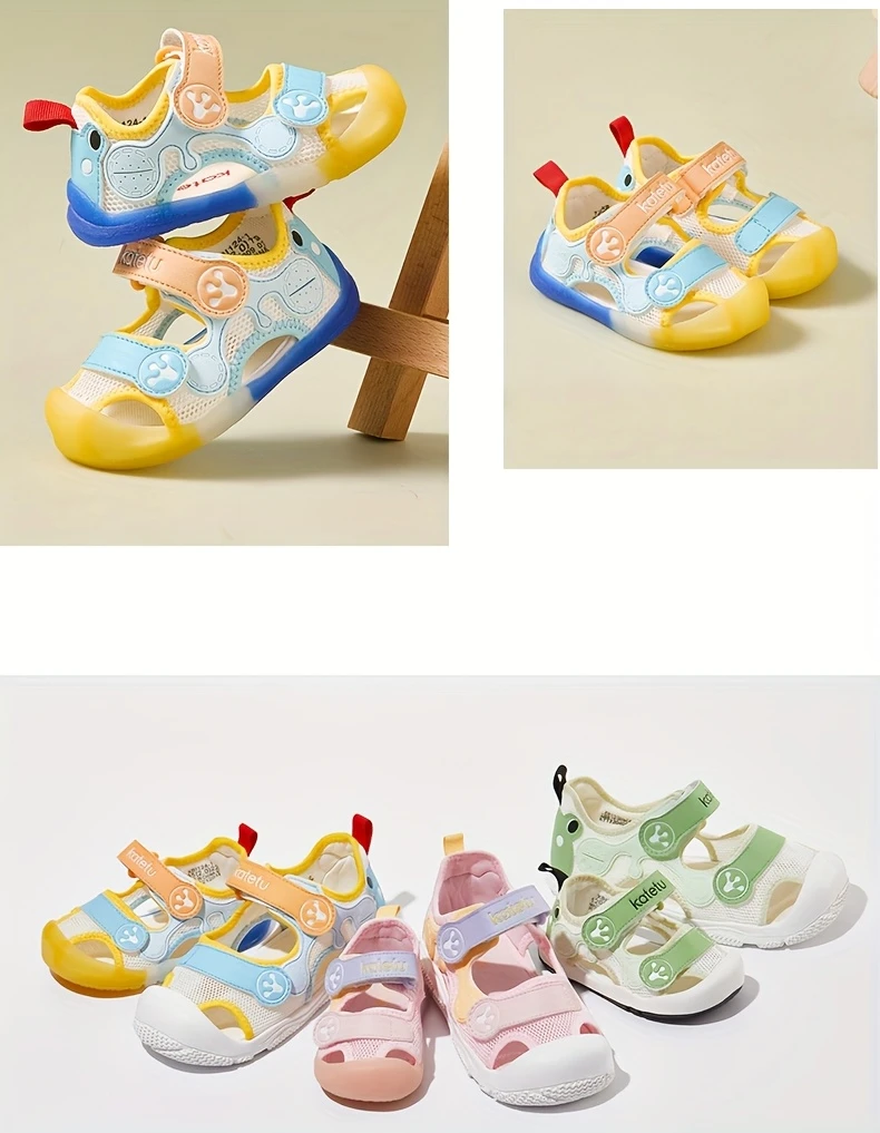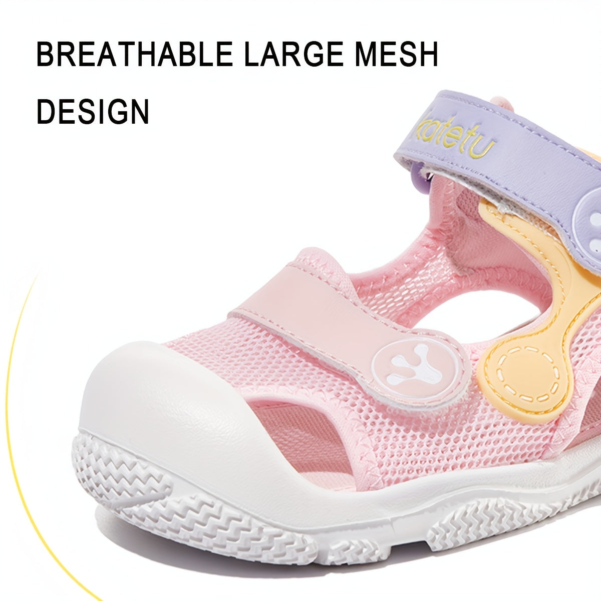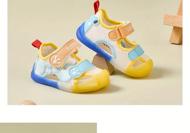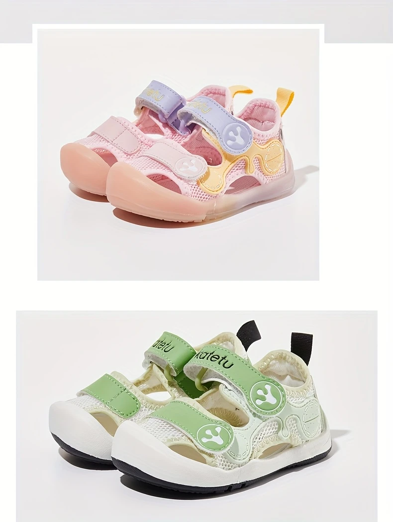 Bolalar uchun yengil, sirpanmaydigan taglikka ega va ichki va tashqi o'yinlar uchun nafas oladigan to'r dizayni bilan mo'ylovga qarshi sandallar.