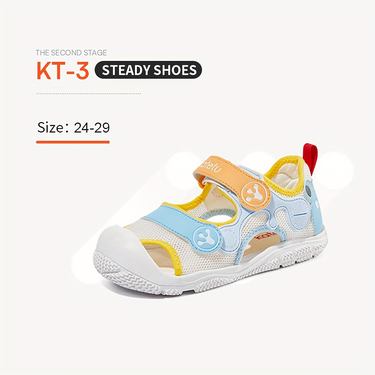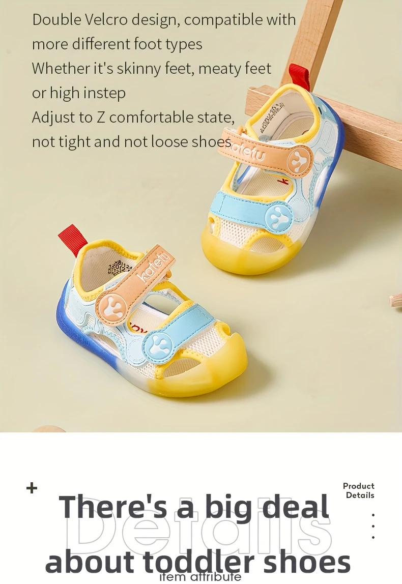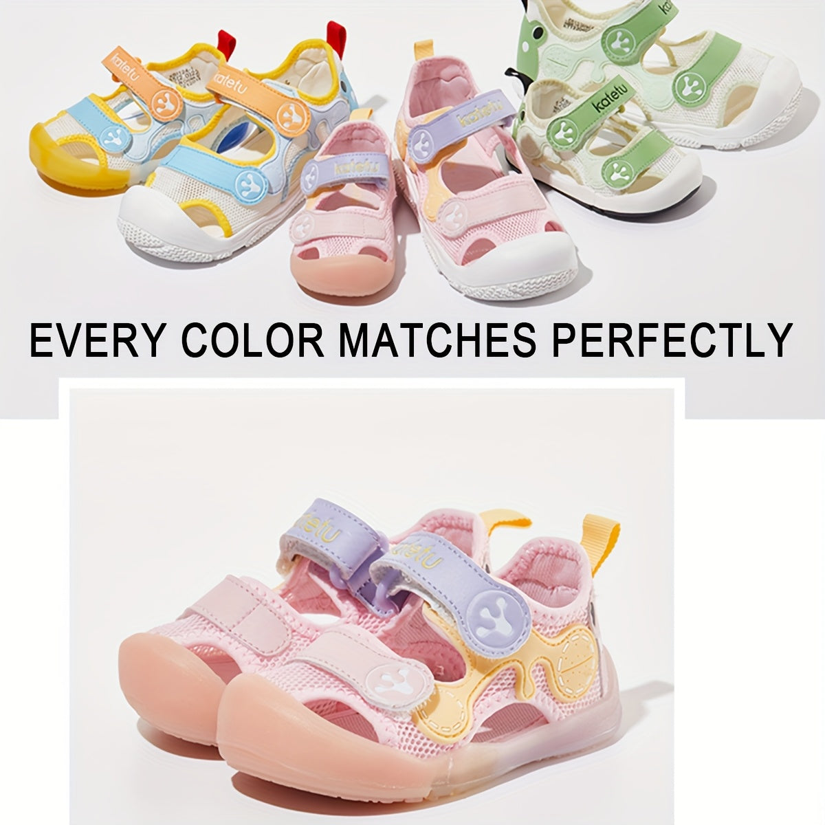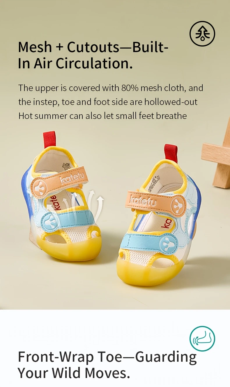 Bolalar uchun yengil, sirpanmaydigan taglikka ega va ichki va tashqi o'yinlar uchun nafas oladigan to'r dizayni bilan mo'ylovga qarshi sandallar.