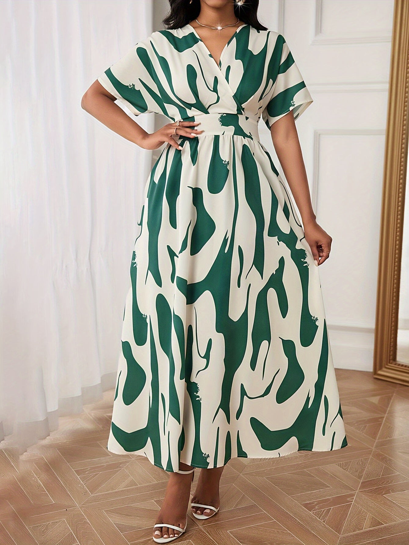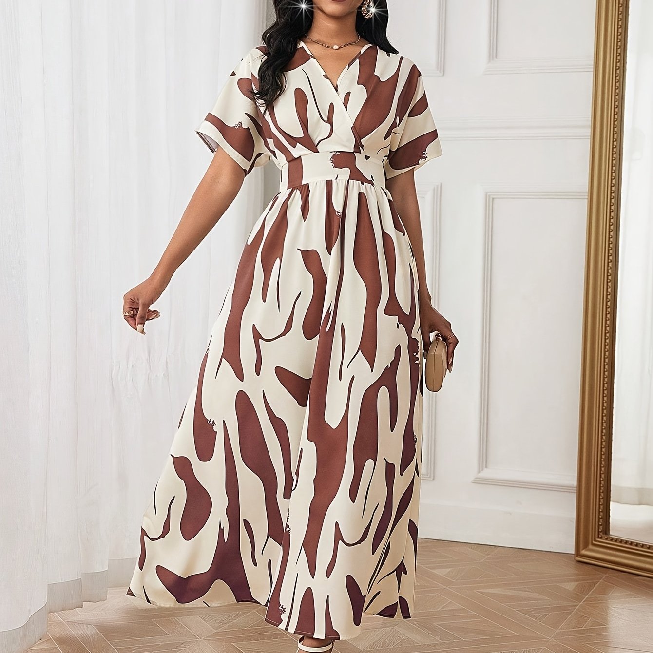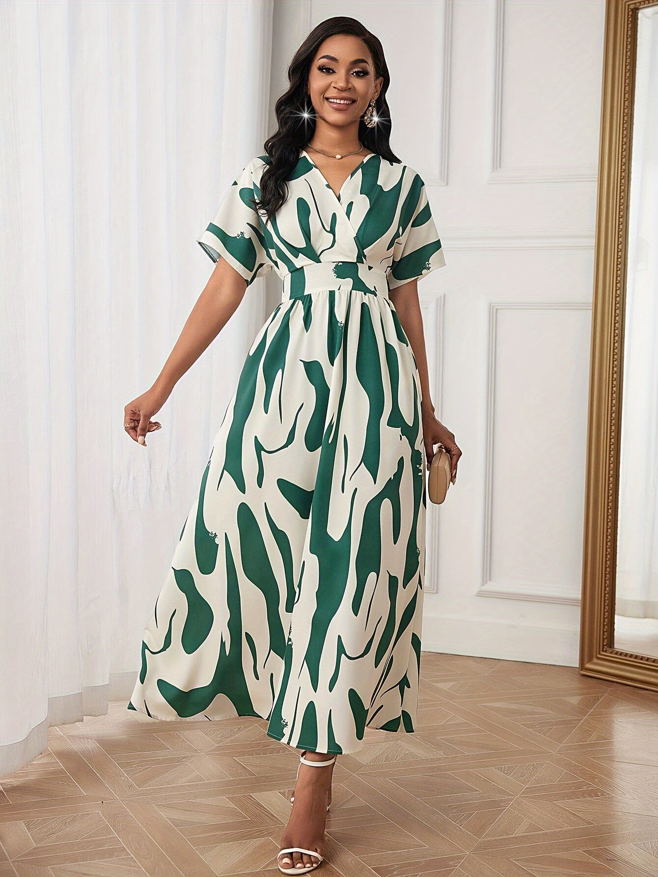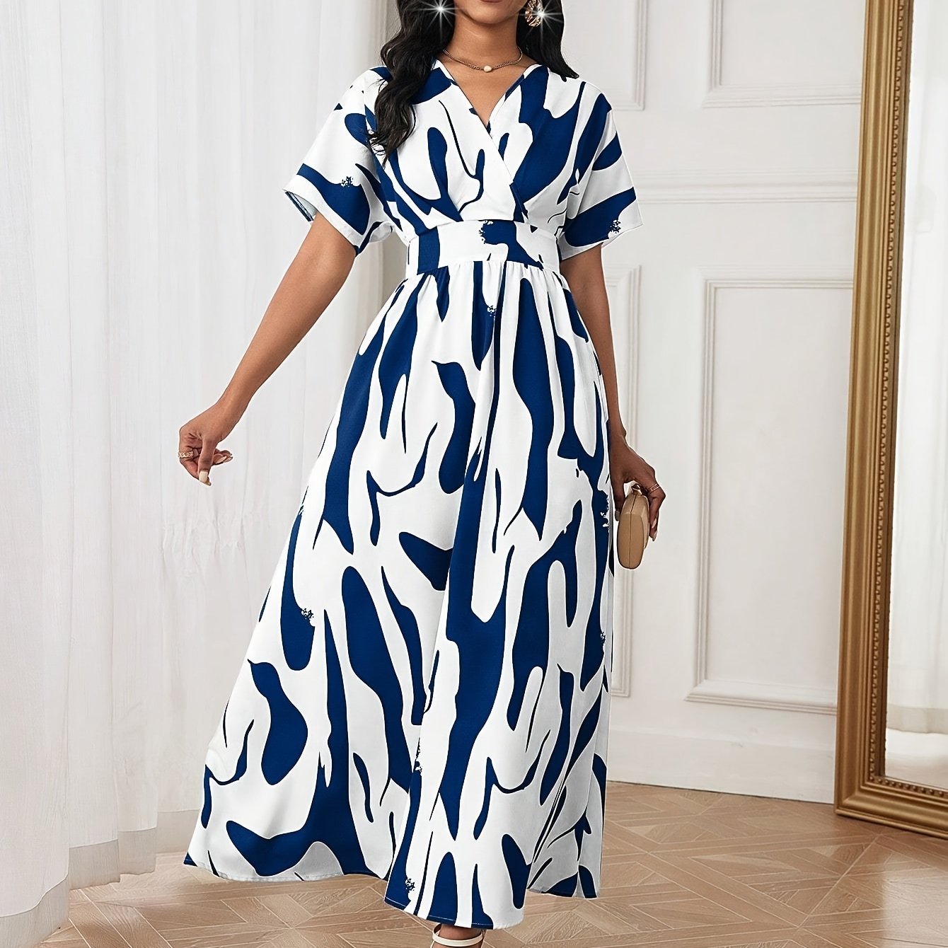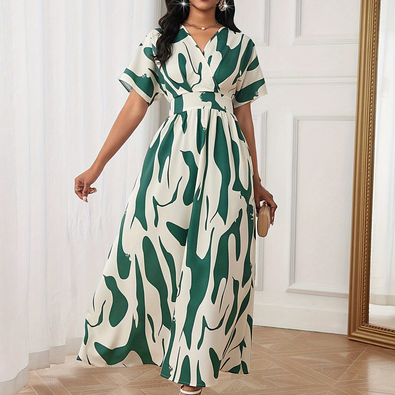 Rang blokli, siqilgan belbog‘li A-chiziqli kiyim, V-shakllı bo‘yin va qisqa qo‘llar bilan yoz uchun