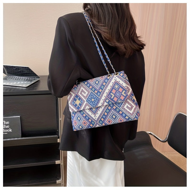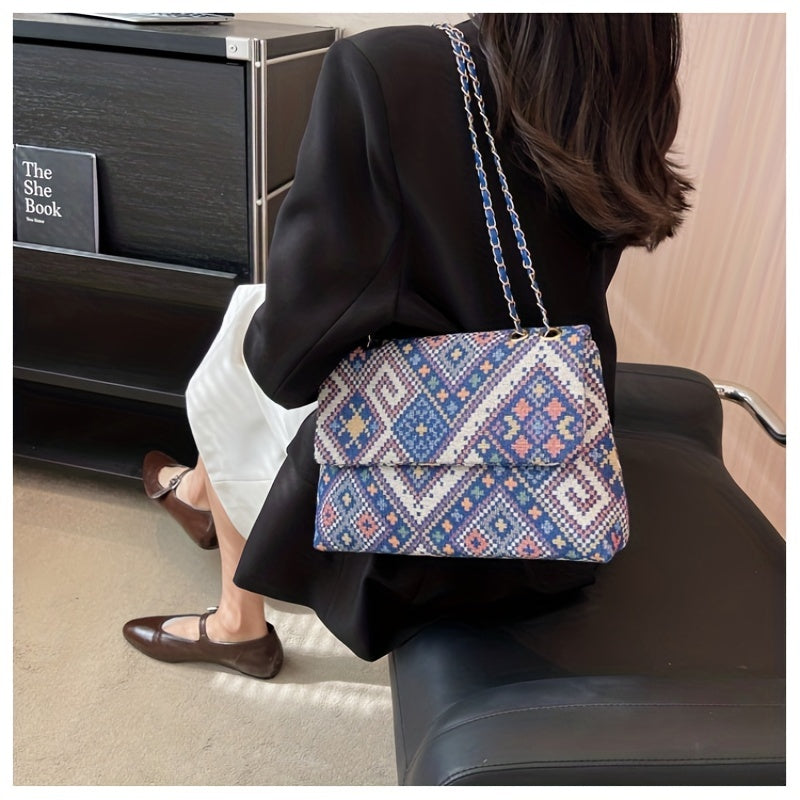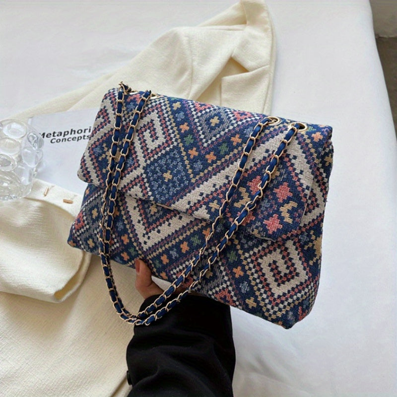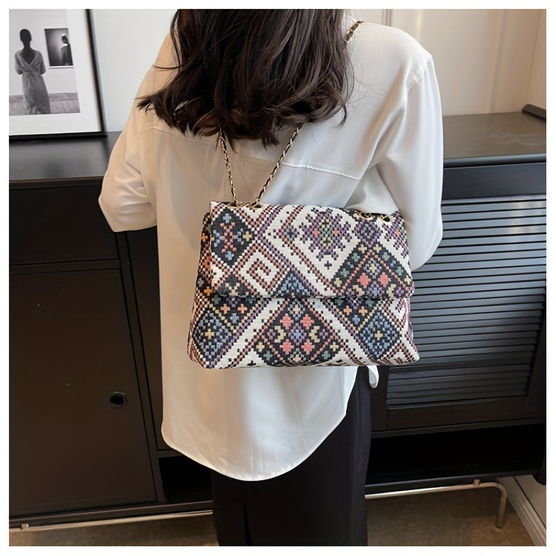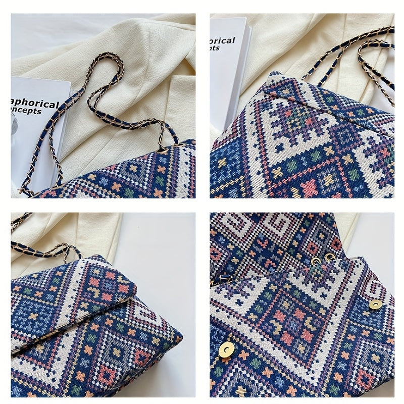 Ayollar uchun rang-barang geometrik yelka sumkasi, sozlanadigan tasma, magnit yopilishi, buklanadigan etnik uslub va polyester astar bilan.