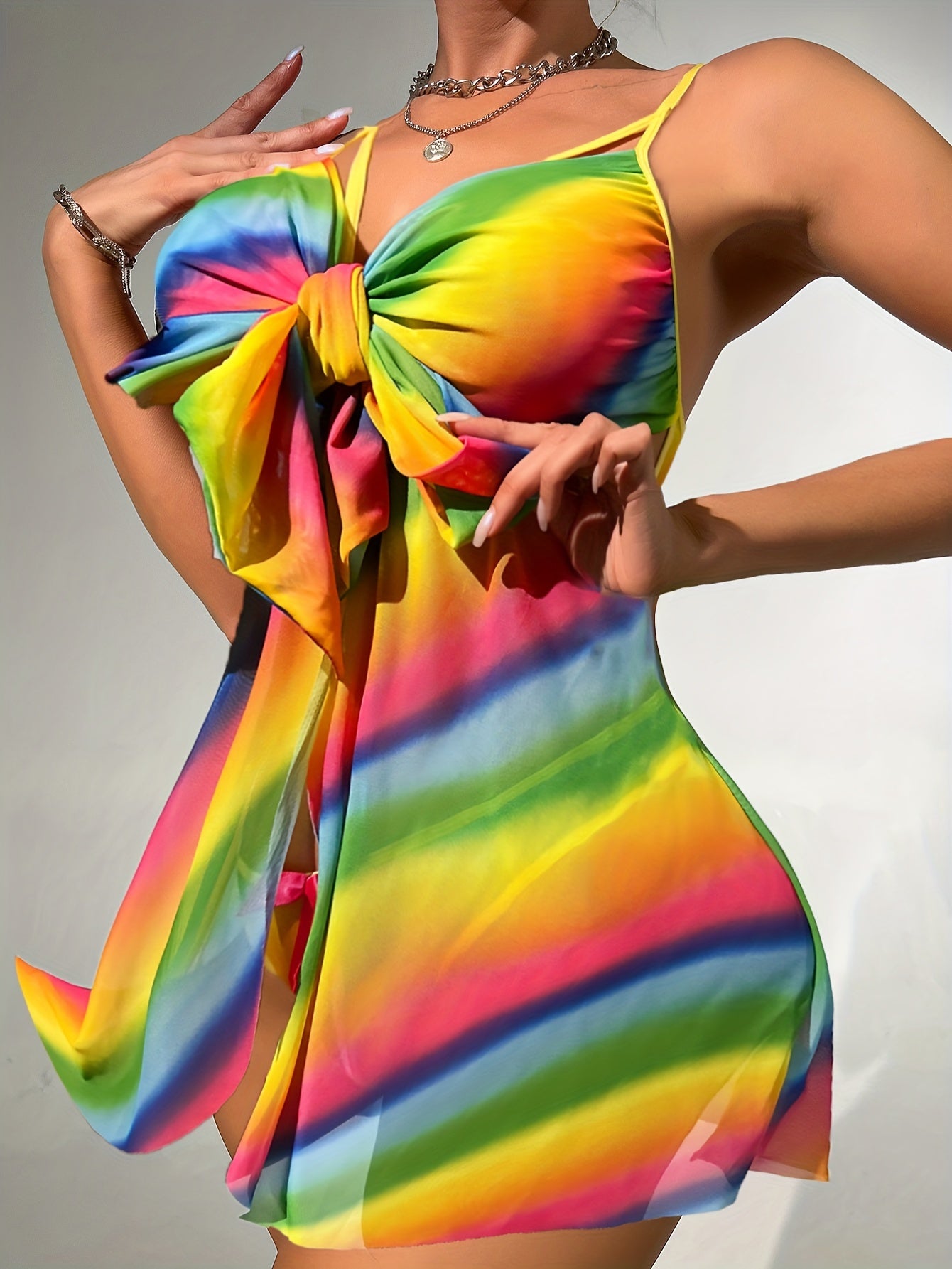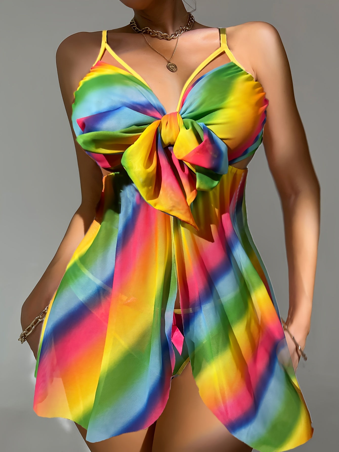 Ayollar uchun tugmachali tasmalari bilan rang-barang to'r yubka to'plami.