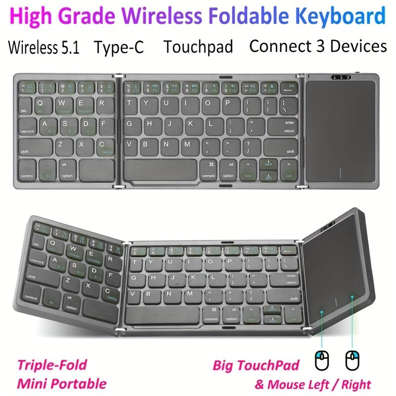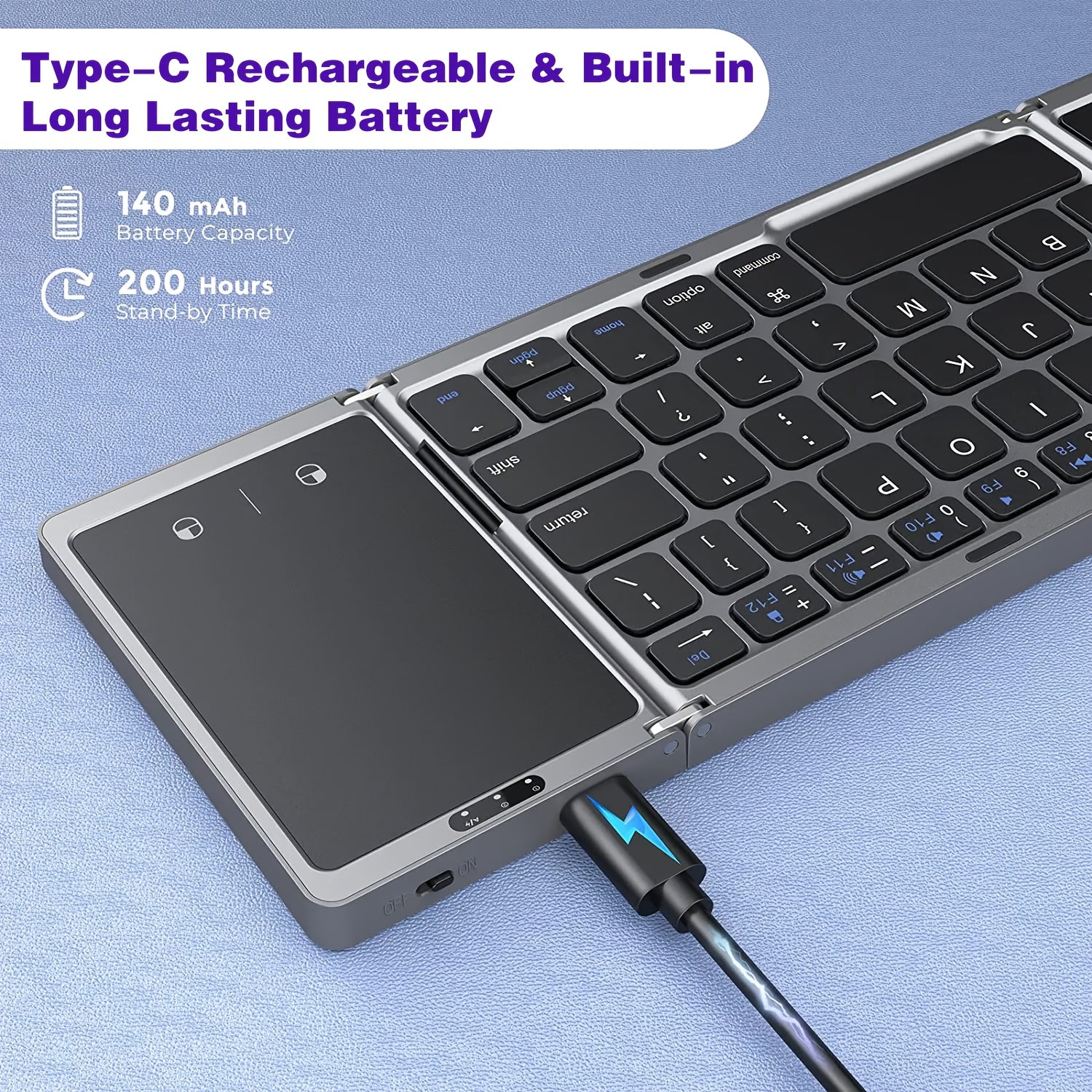 Windows, Android, iOS va Mac qurilmalari uchun mo'ljallangan, planshetlar va smartfonlar uchun ideal, teginish paneli bilan jihozlangan ixcham, bukiladigan simsiz klaviatura.