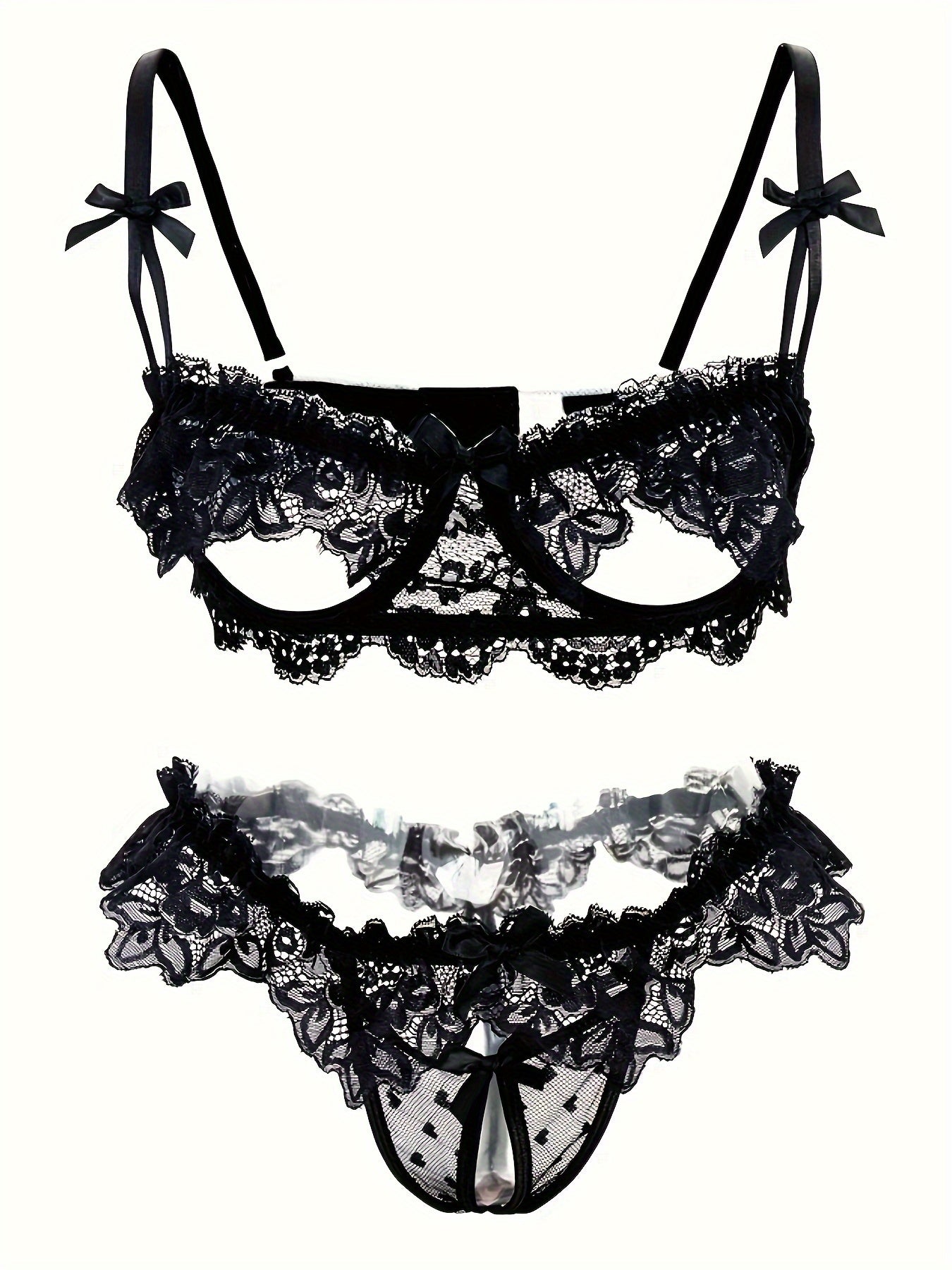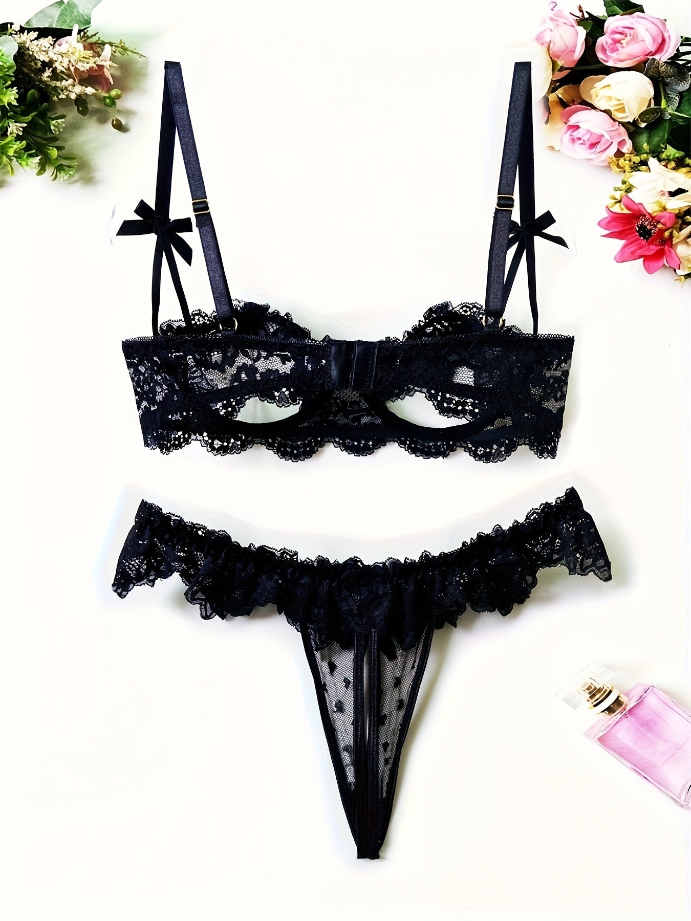 Ayollar uchun sexy ichki kiyim - ochiq ko'krakli brassiyer va qorin qismisiz ichki kiyimdan iborat qulay gullar bilan bezatilgan dantelli to'plam.