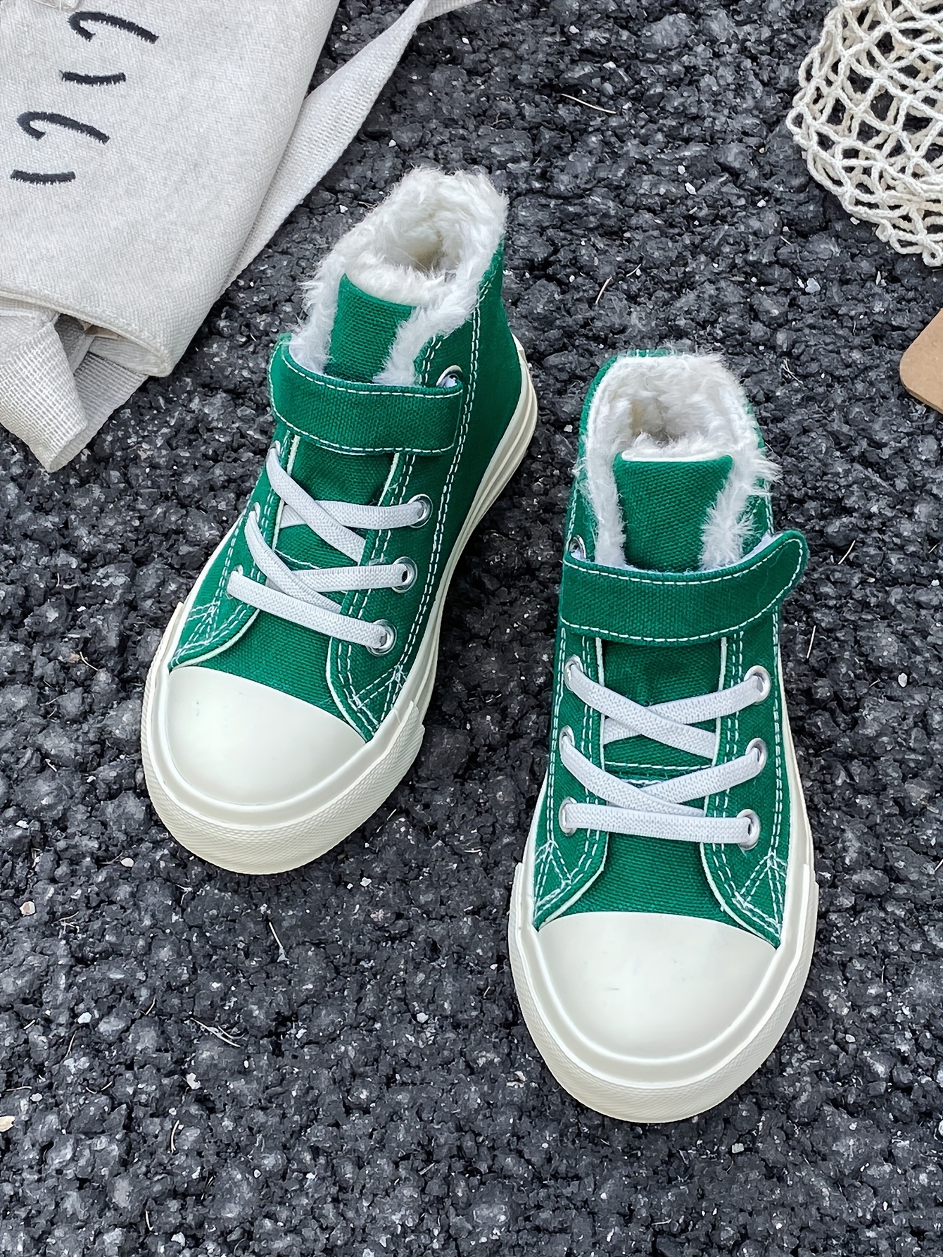 Bolalar uchun qulay qish yuqori to'plamli kanvas krossovkalar, yumshoq astar, sirpanmaydigan taglik, bog'ichli dizayn; ochiq havoda o'ynash va tasodifiy kiyim uchun ideal.