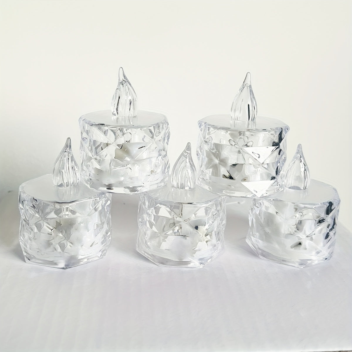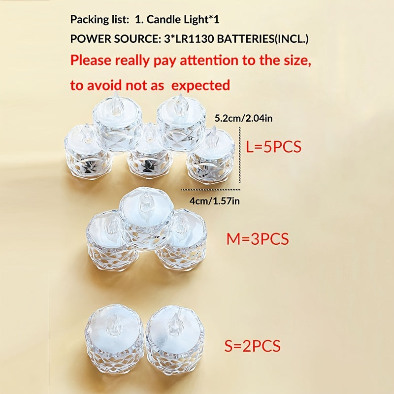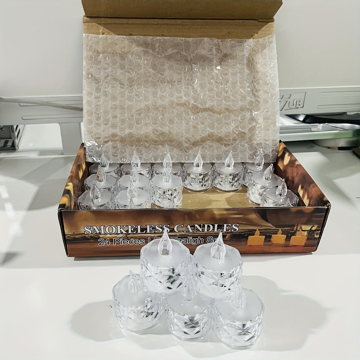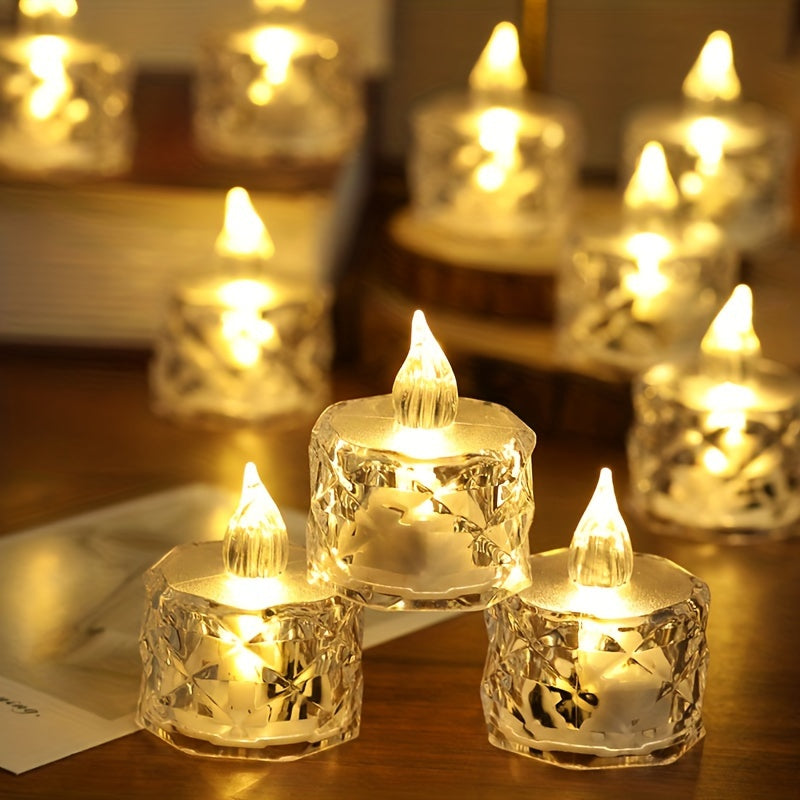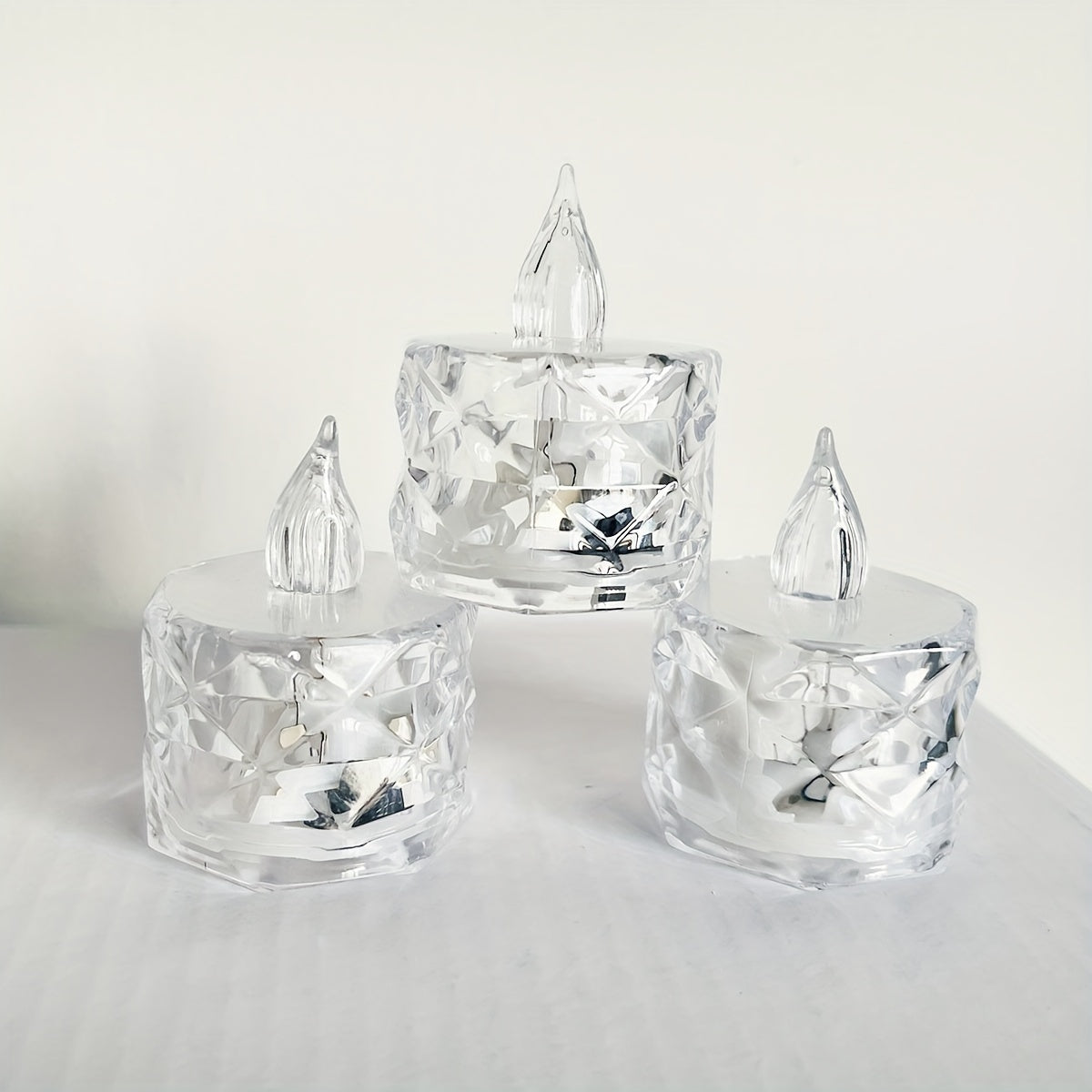 Kristal naqshli elektron sham yoritgichlar 2, 3, 5 yoki 24 ta to'plamlarda. LED simulyatsiya qilinadigan olovsiz choy shamlari lampalari xona bezatish uchun, tug'ilgan kunlar, to'ylar, bayramlar va Ramazon uchun mos.
