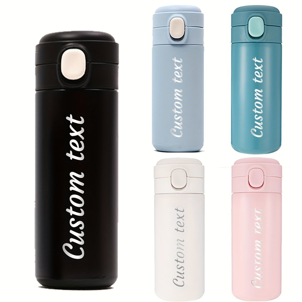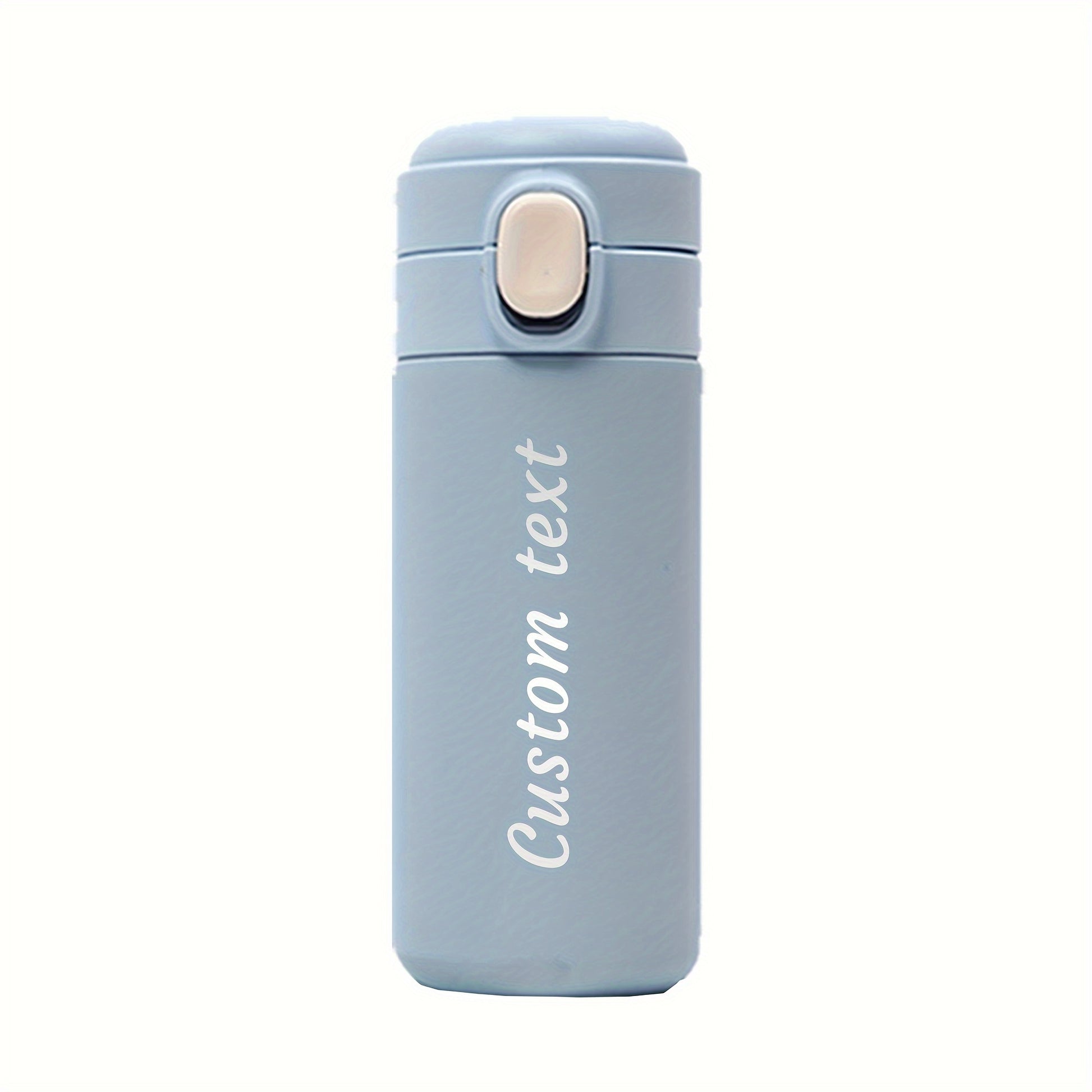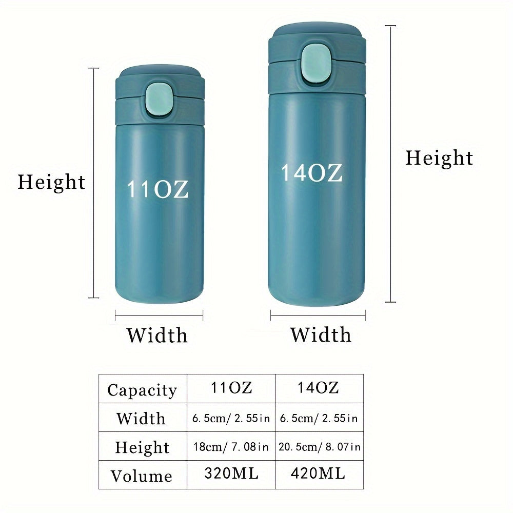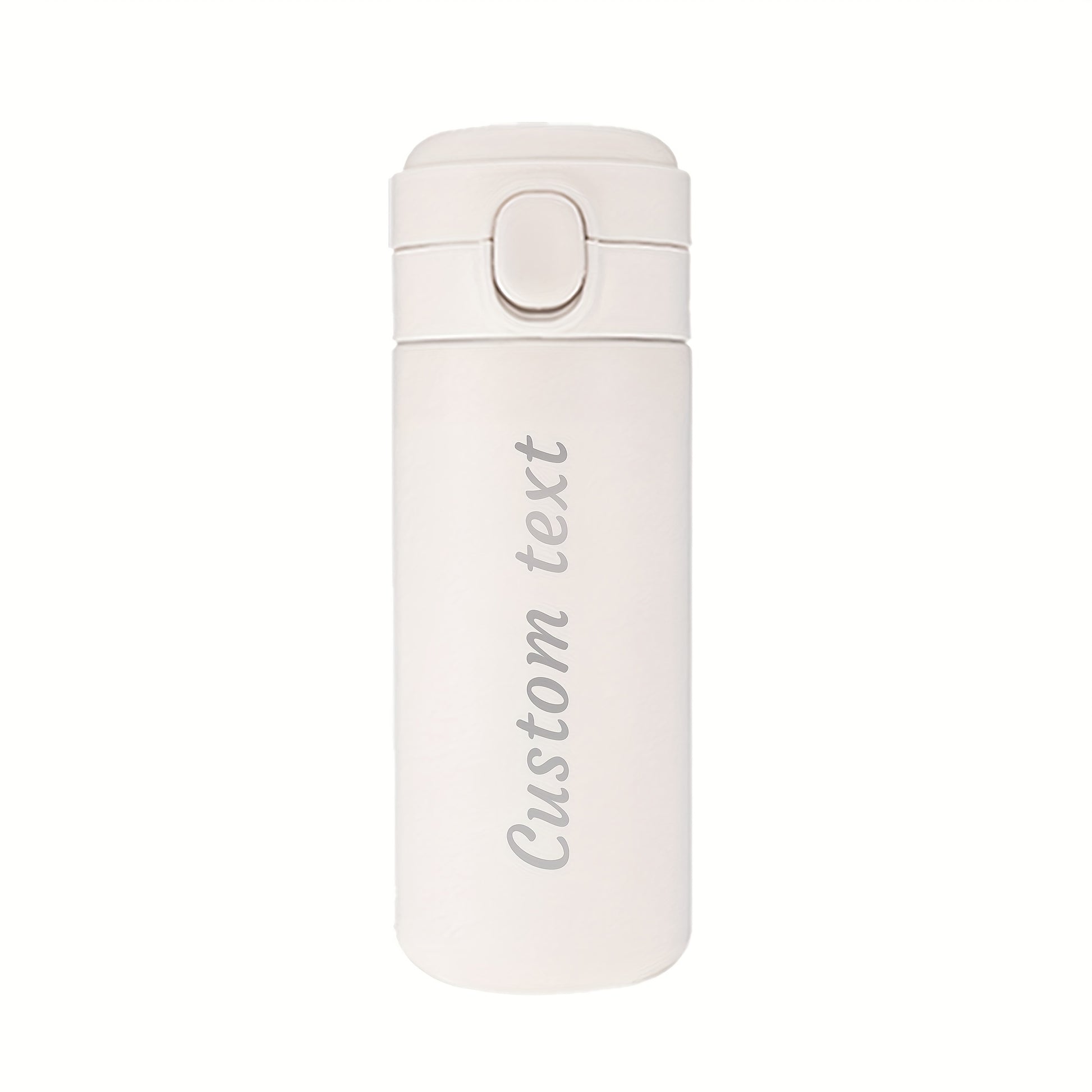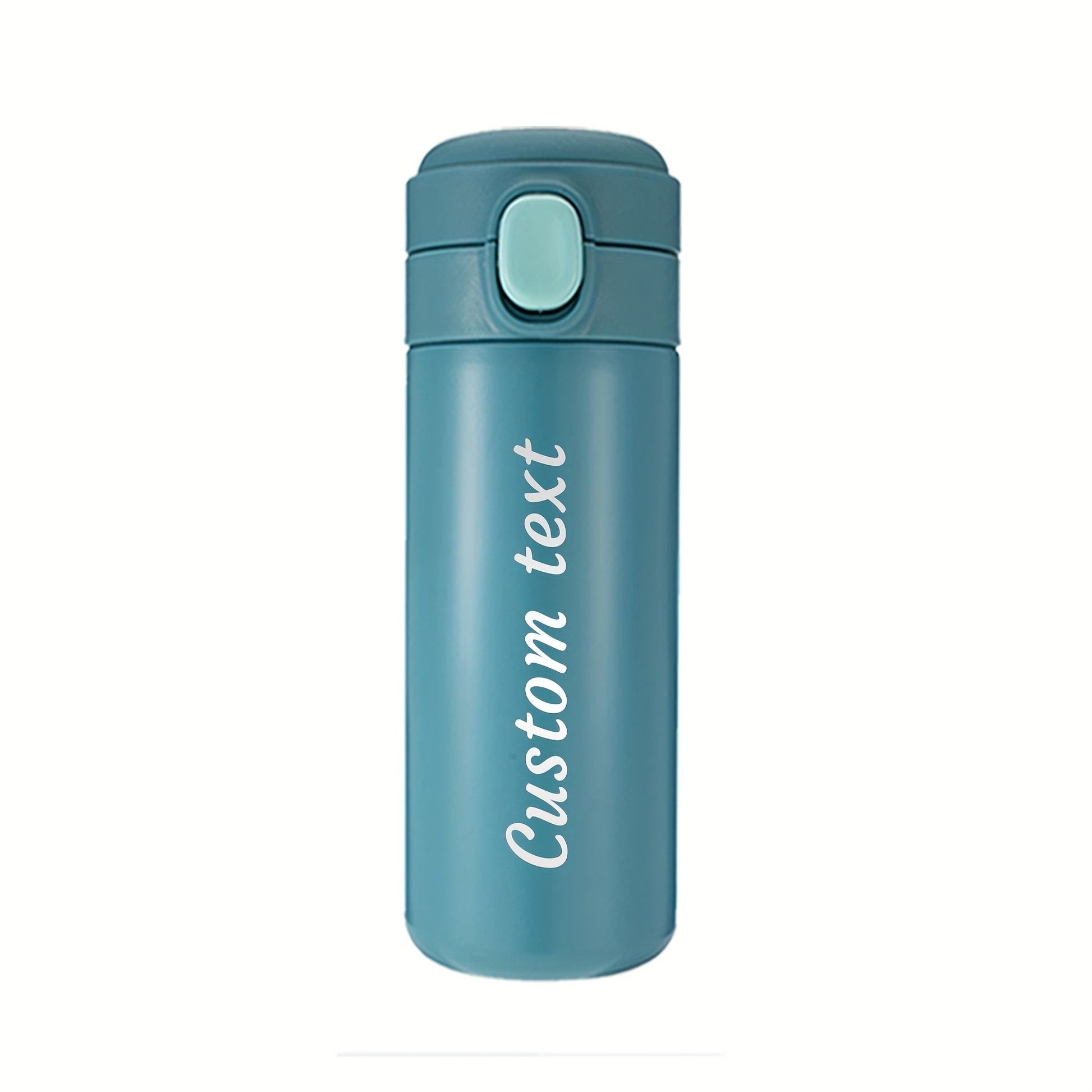 Maxsus lazer bilan o'yilgan matnli zanglamas po'latdan yasalgan suv shishasi, o'lchamlari 7-320ml/11-420ml, qulay foydalanish uchun ko'tariladigan qopqoq, sport va sayohat uchun ideal.