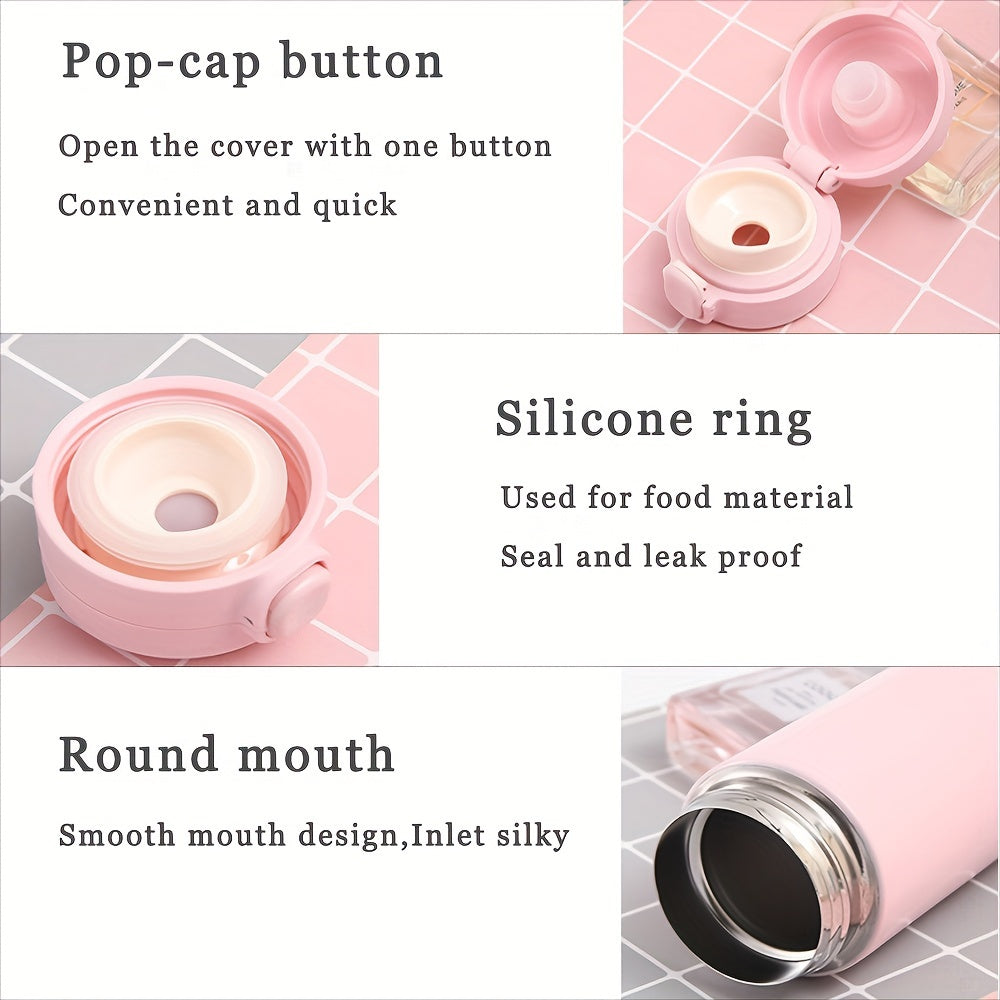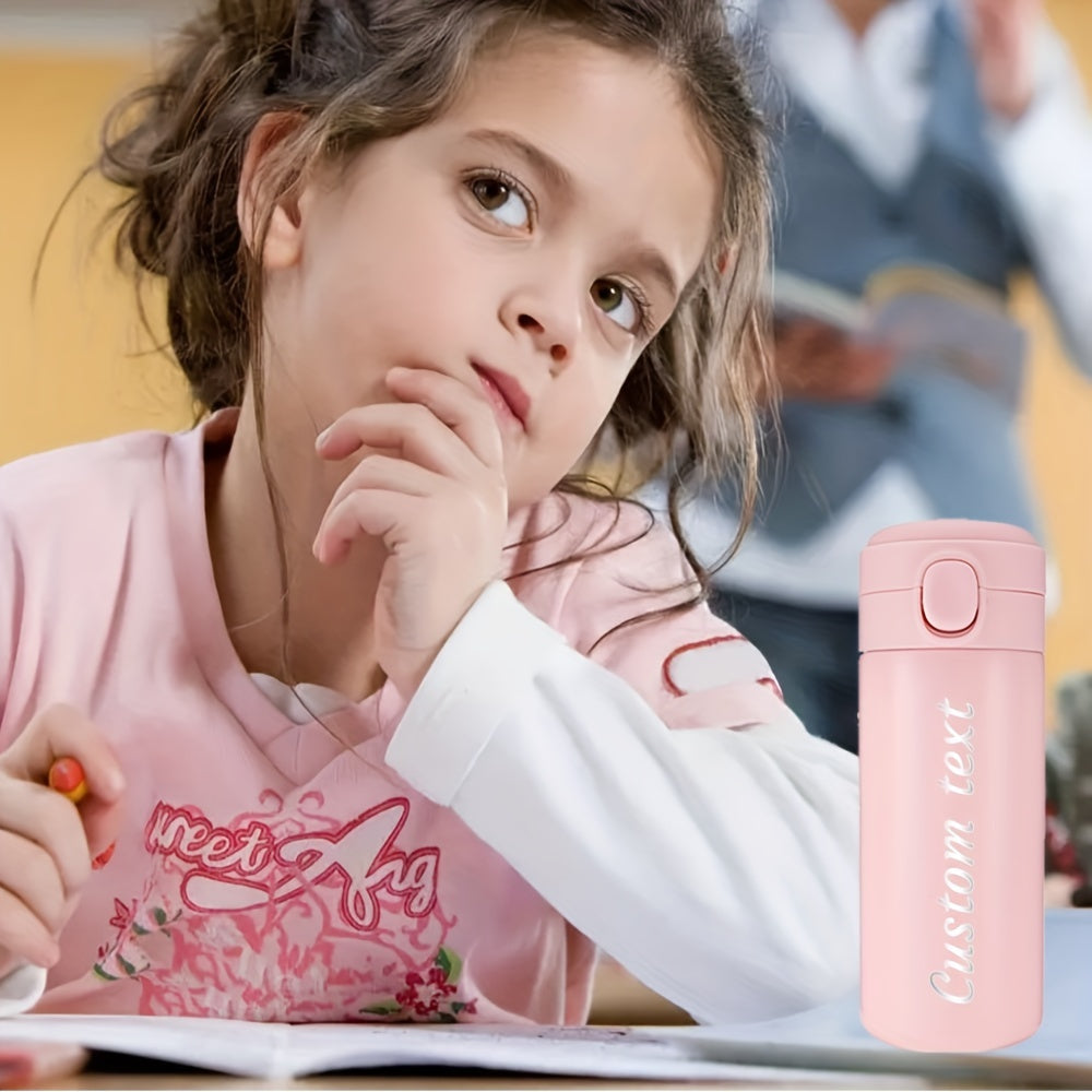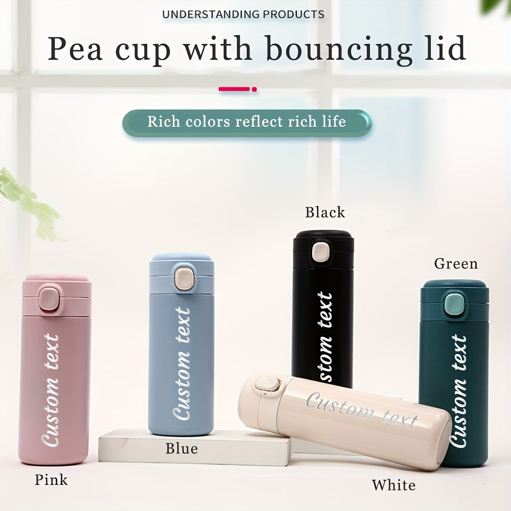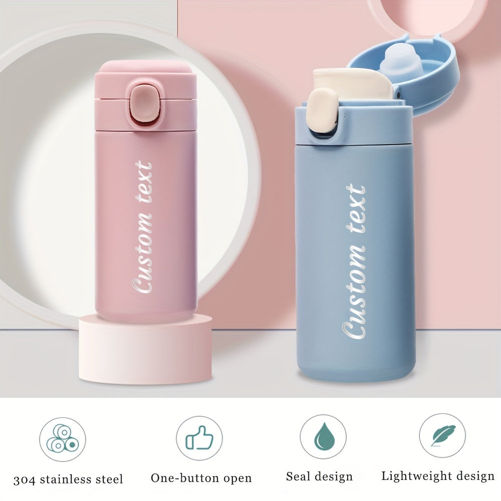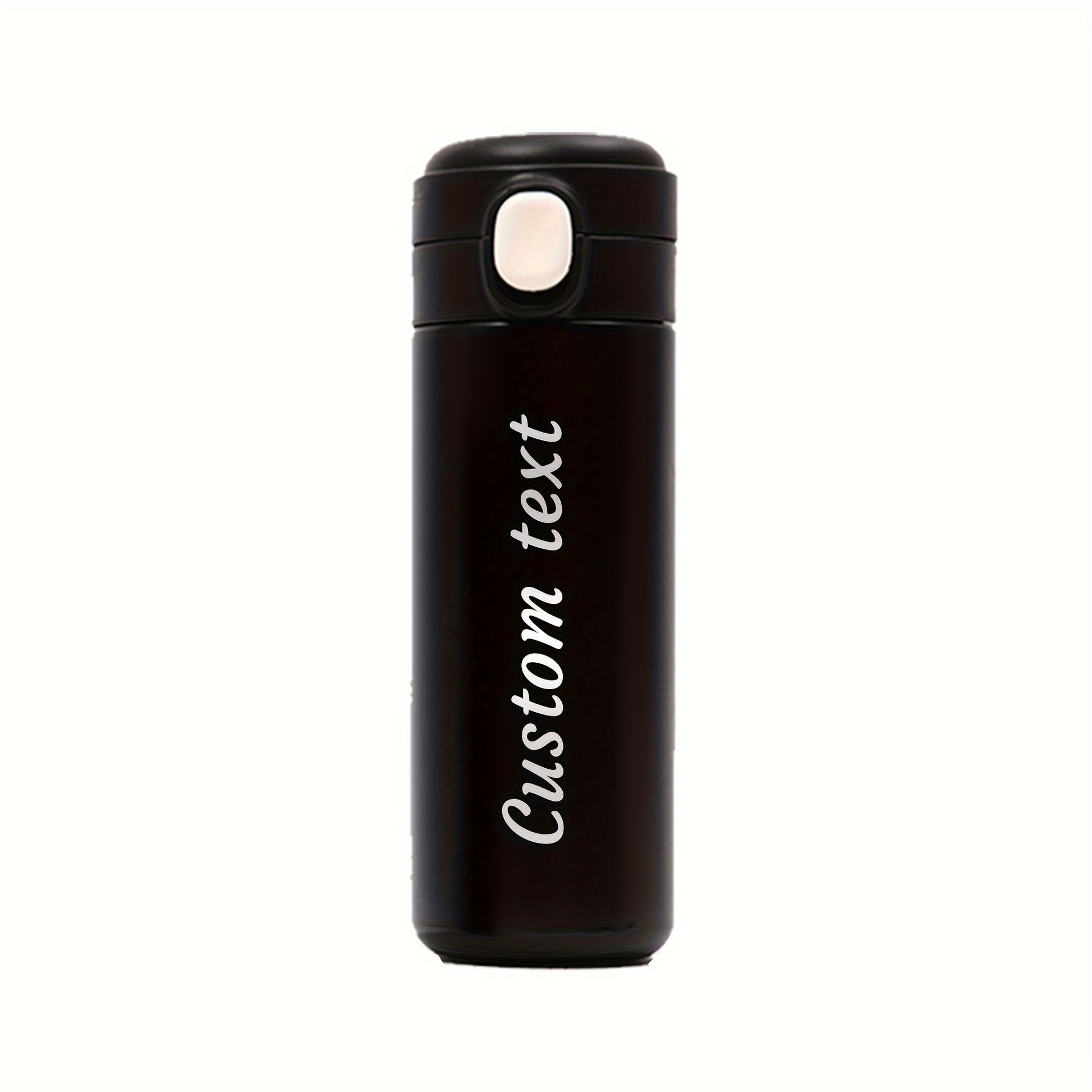 Maxsus lazer bilan o'yilgan matnli zanglamas po'latdan yasalgan suv shishasi, o'lchamlari 7-320ml/11-420ml, qulay foydalanish uchun ko'tariladigan qopqoq, sport va sayohat uchun ideal.