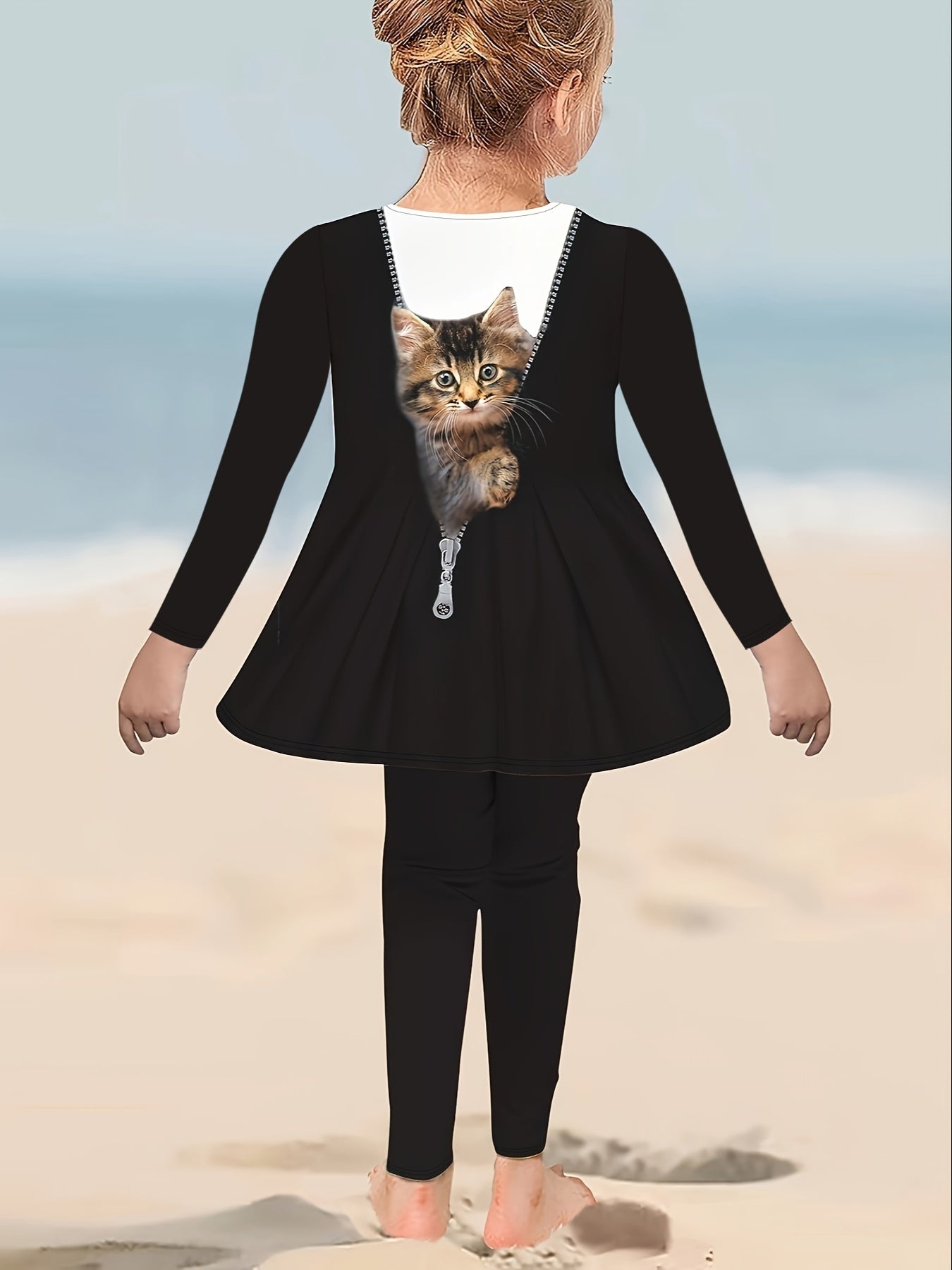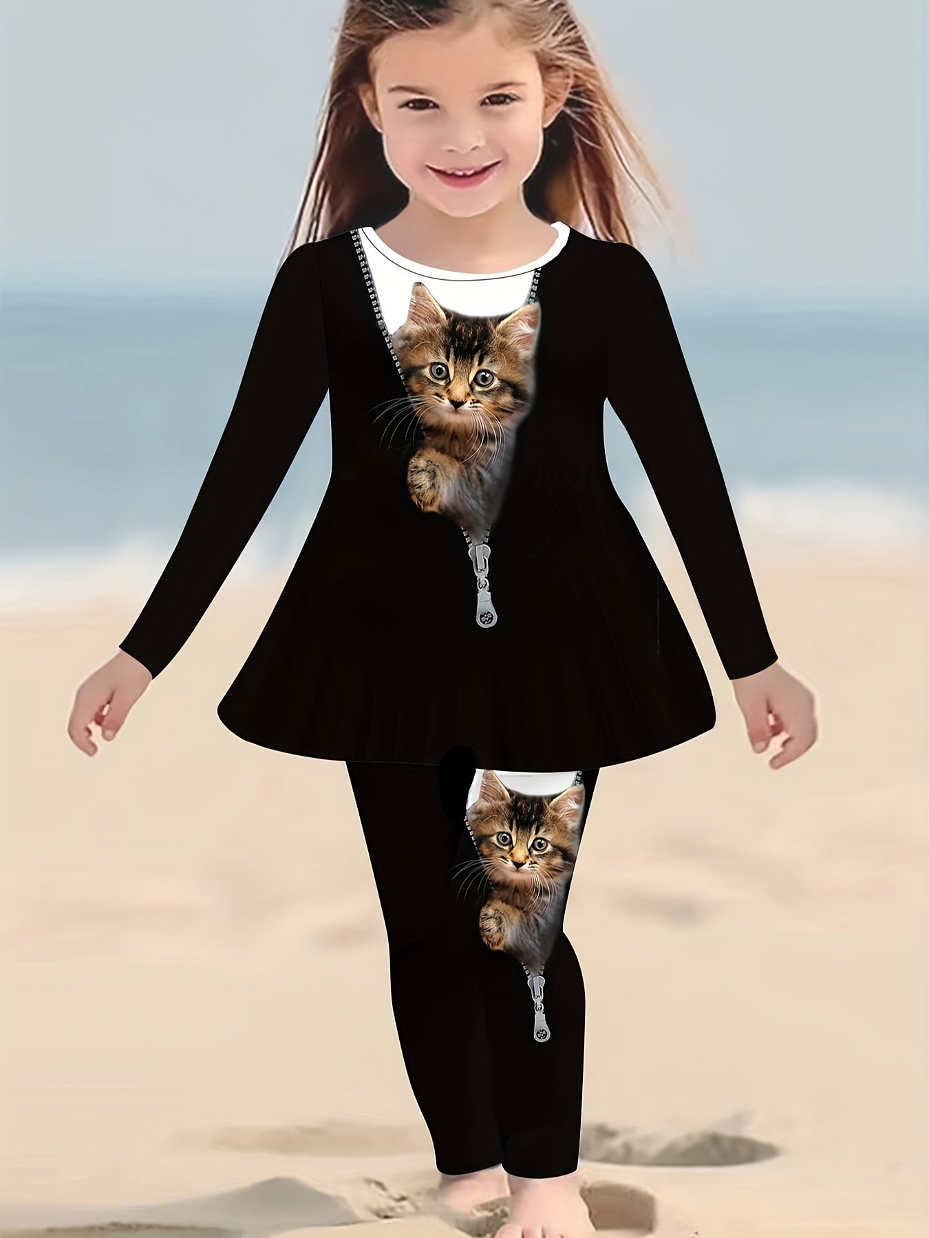 Qizlar uchun chiroyli mushuk printli ko'ylak to'plami - mashinada yuvish mumkin, har mavsumda qulay, ochiq havoda kiyish uchun mukammal.
