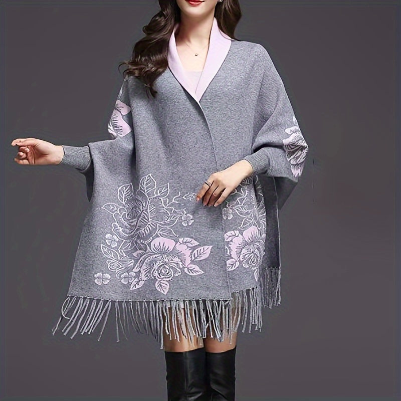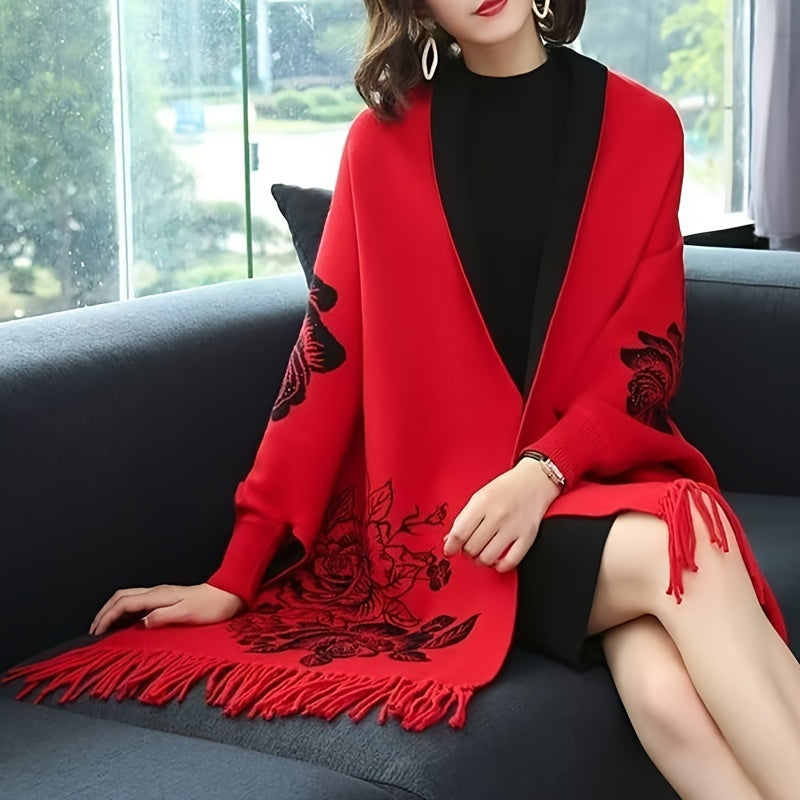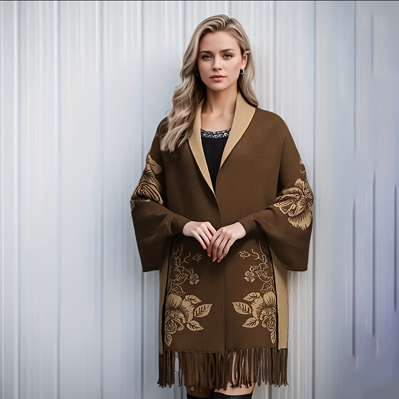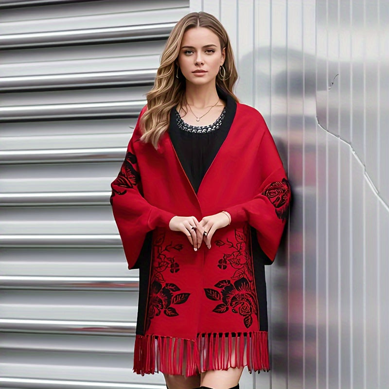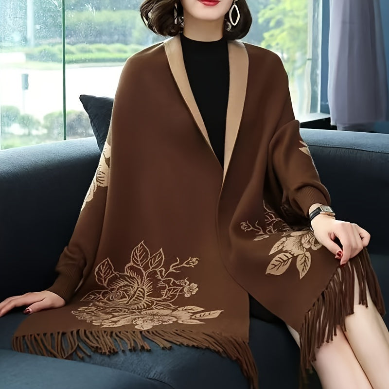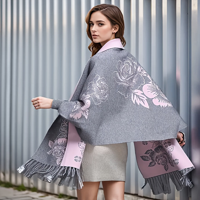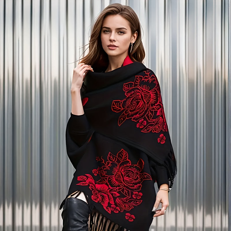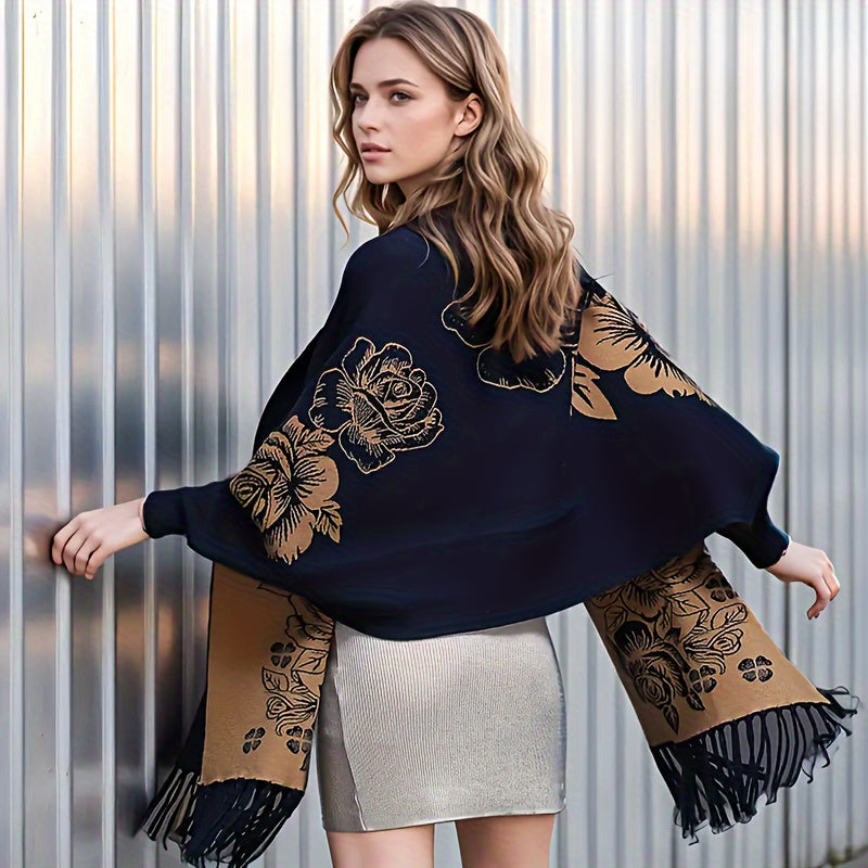 Qora va bej/rangda gullar dizayni bilan ikki tomonlama trikotaj shal, kuz va qish uchun mukammal. Parvarish uchun qo'l bilan yuvish yoki quruq tozalash.