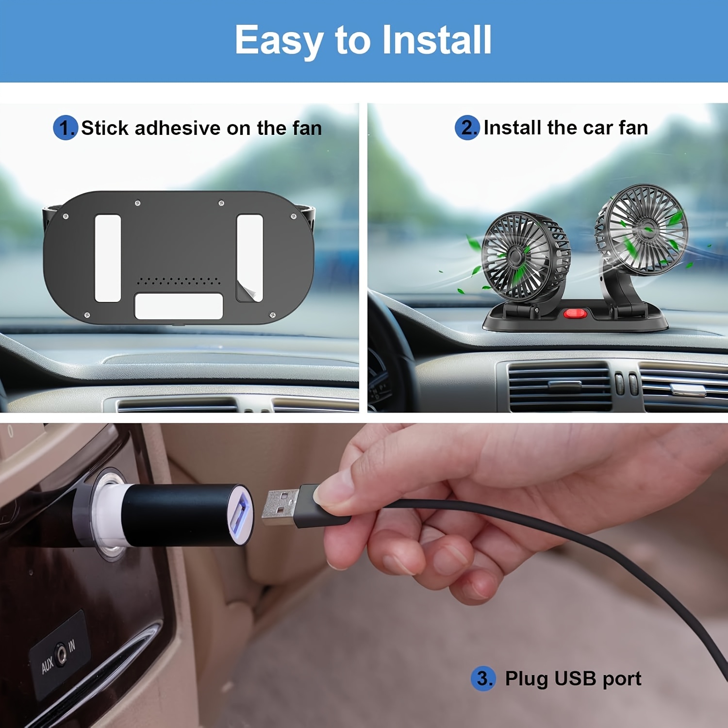 360° Adjustable Dizaynga ega Dual Head USB Avtomobil Ventilyatori - 2 tezlik, portativ va bukiladigan - Avtomobillar, Yuk mashinalari, SUVlar va noutbuklar uchun ideal