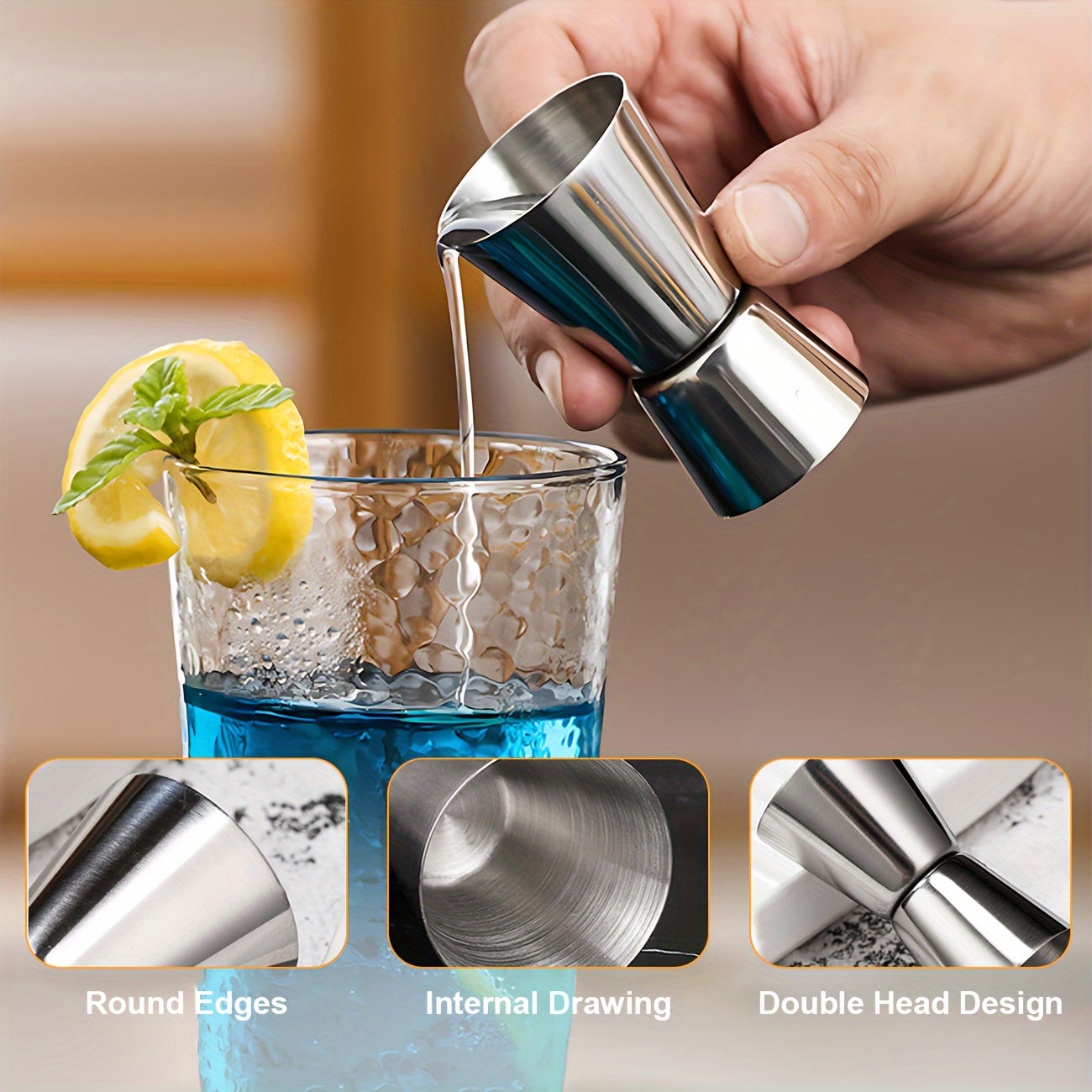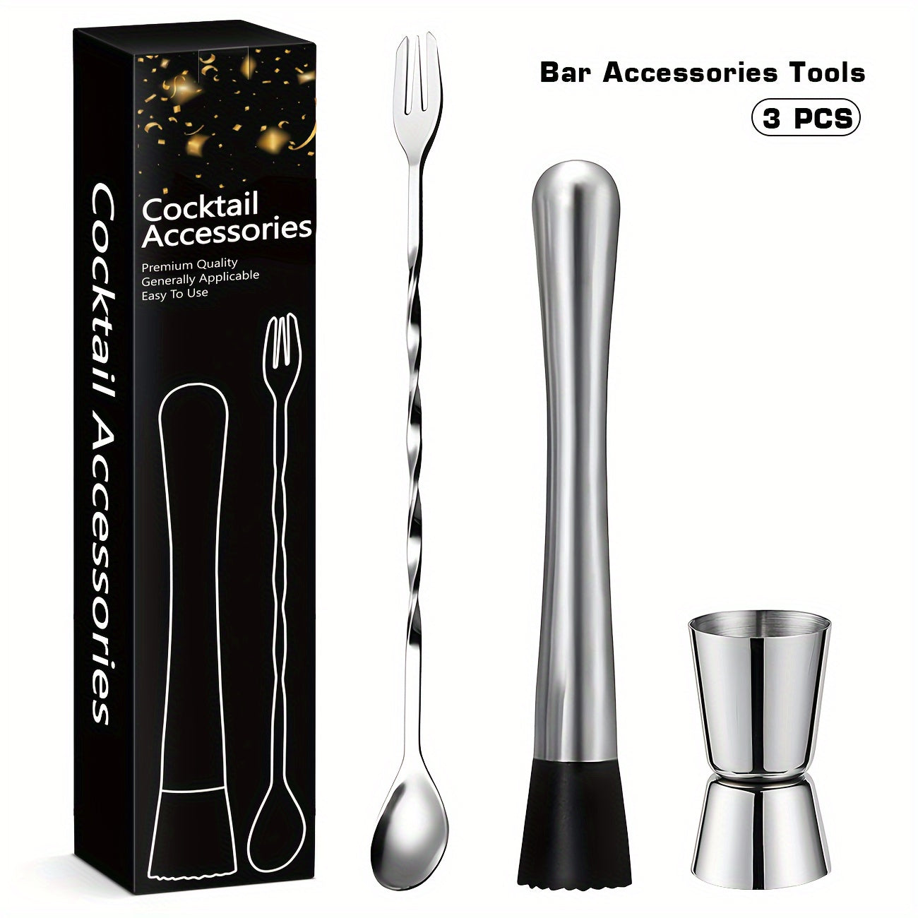 Mustahkam 3-qismli zanglamas po'latdan yasalgan kokteyl aralashtirish to'plami muz maydalagich, aralashtirish qoshiq, o'lchov stakani va uyda va professional foydalanish uchun shisha ochgichni o'z ichiga oladi.