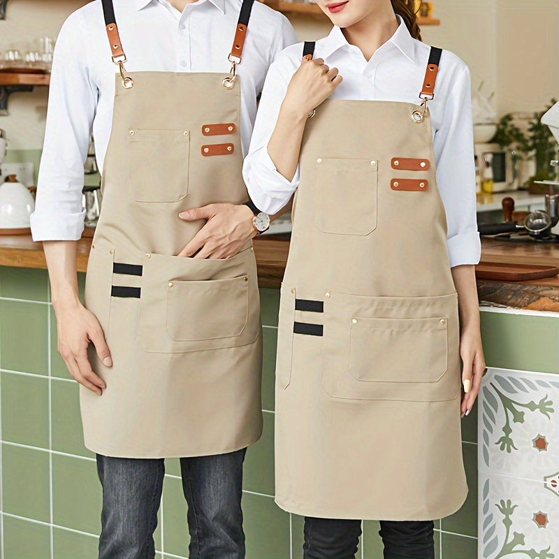 Mustahkam polyester kanvas ish xalat, sozlanadigan kamarlar bilan, ko'p cho'ntakli dizayn, oshxona, restoran, gullar do'koni va kafe kabi turli muhitlarda pishirish, bo'yash va yog'och ishlash uchun mos.