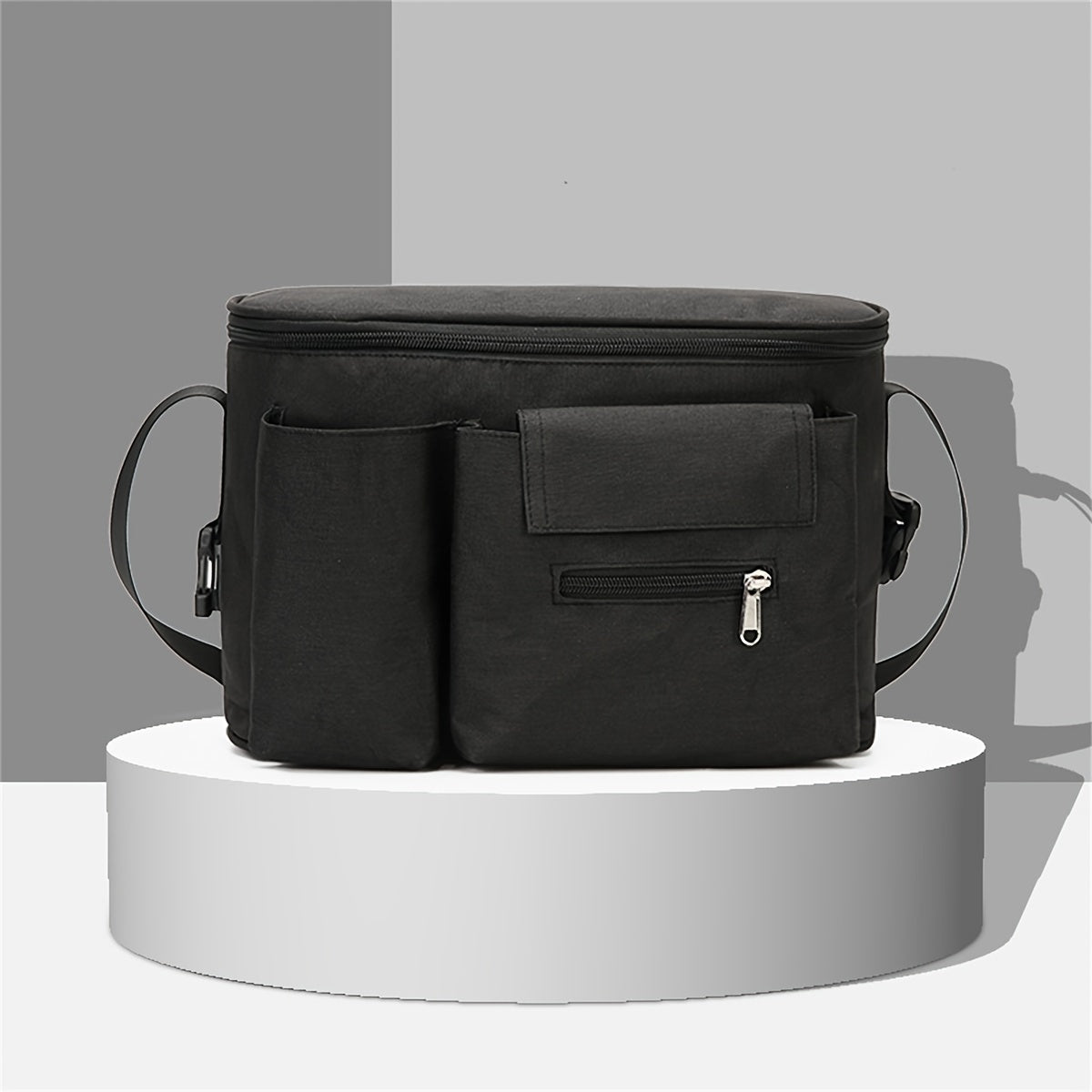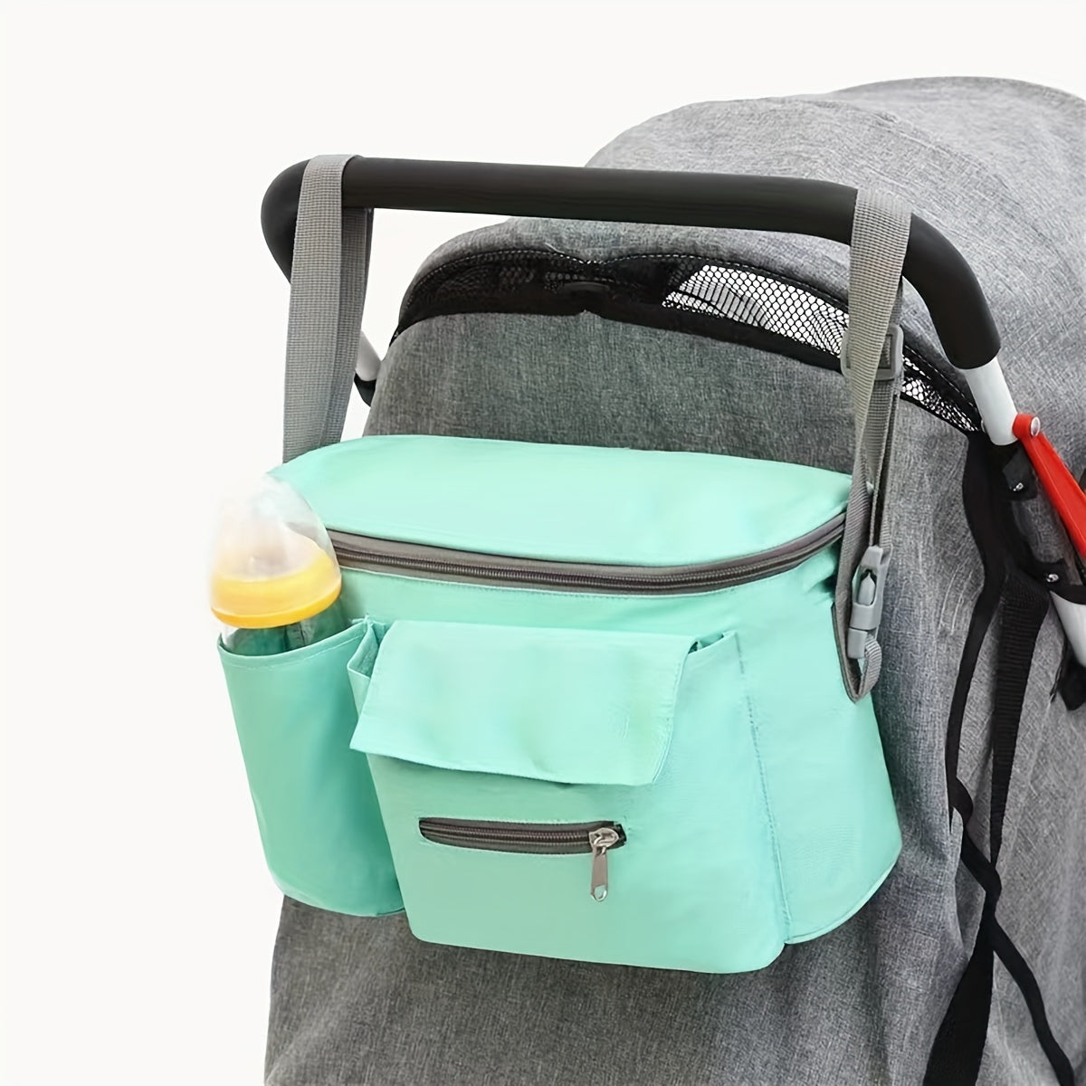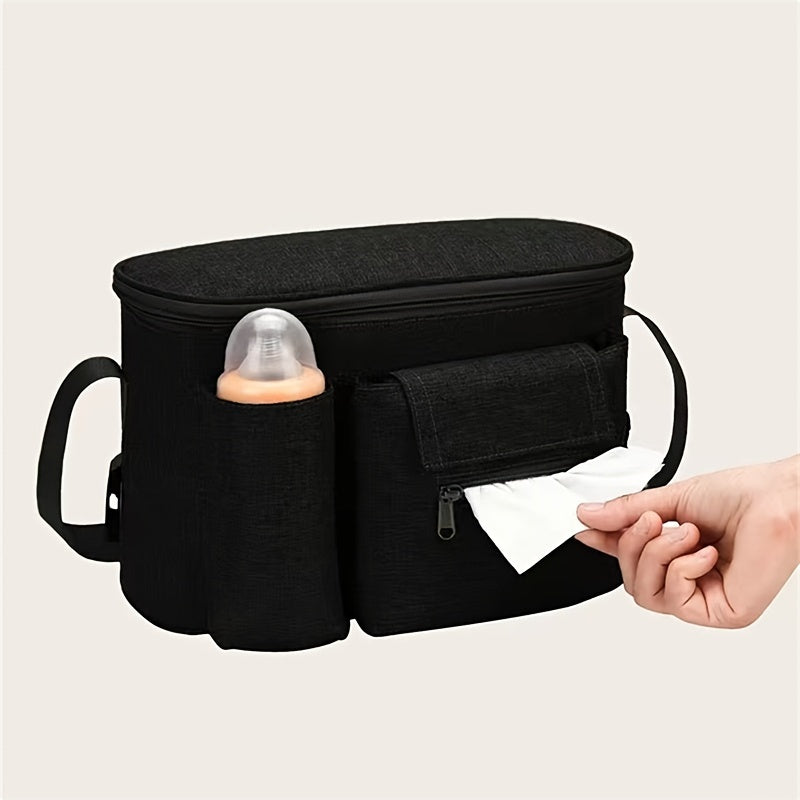 Katta sig‘imga ega, polyester materialdan tayyorlangan, ko‘p funksiyali, saqlash cho‘ntaklari va yelka tasmasi bilan jihozlangan mustahkam, zamonaviy aravachalar tashkilotchisi.
