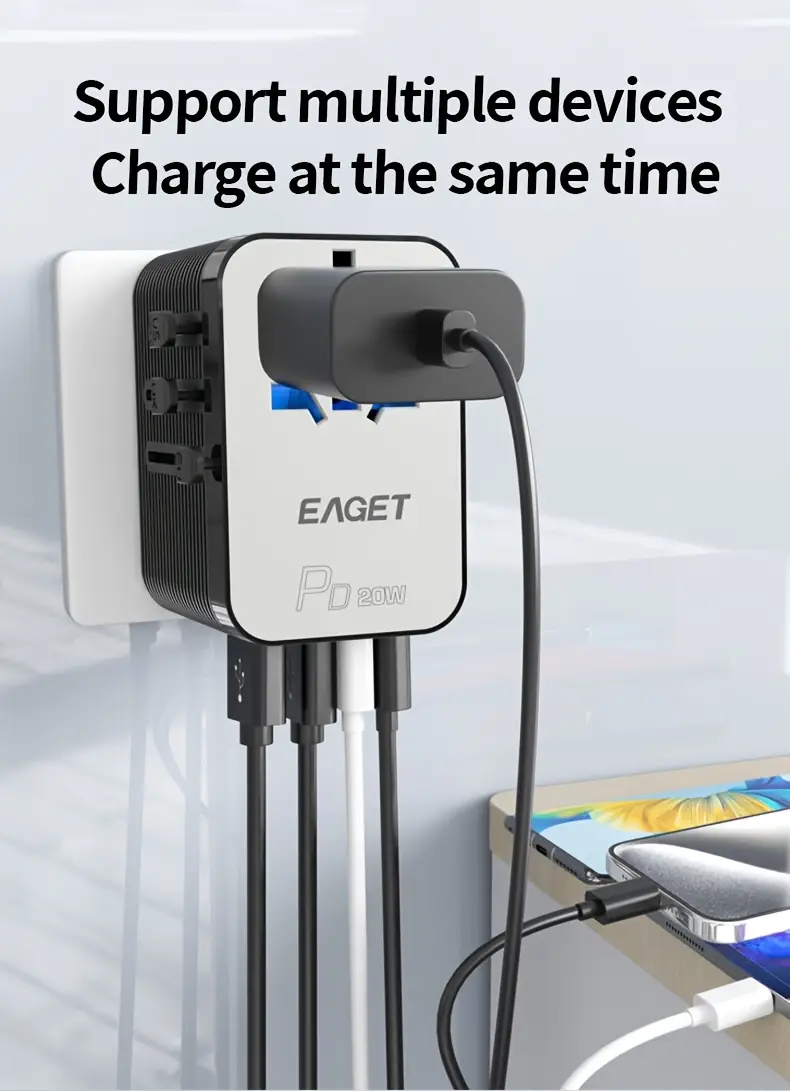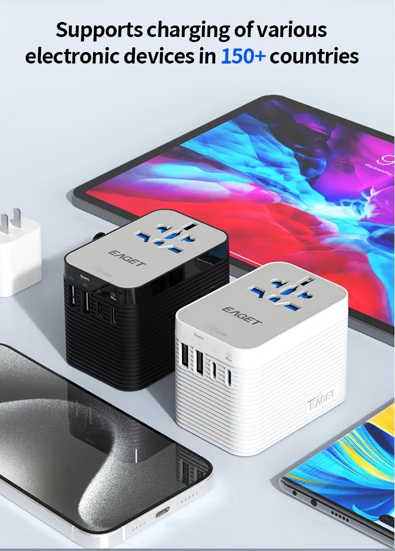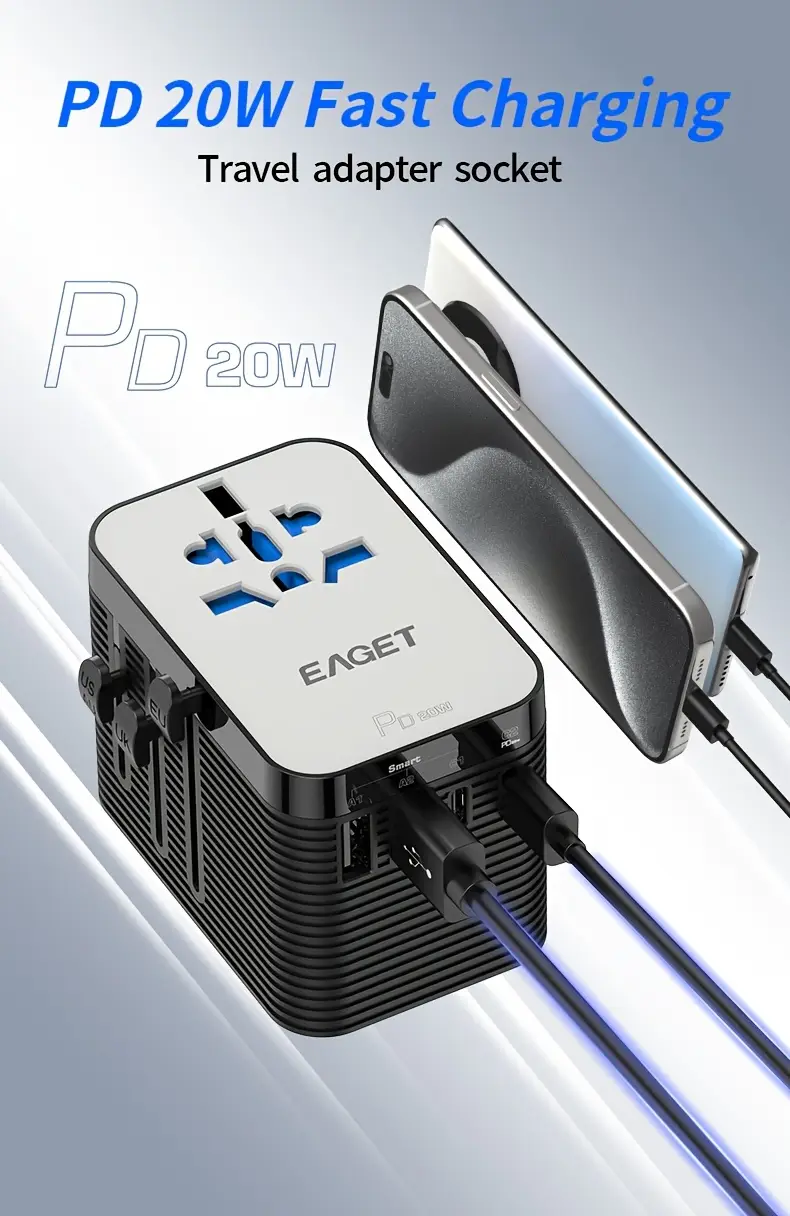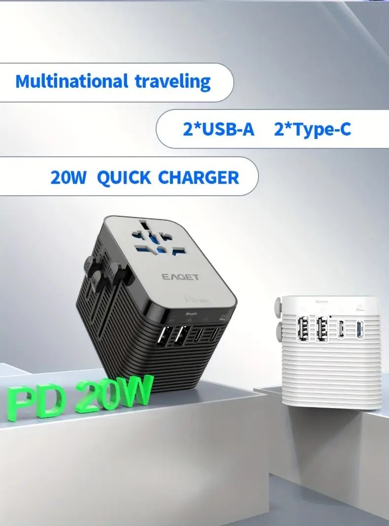 EAGET PD 20W Universal Sayohat Zaryadlovchisi 2 USB-A va 2 USB-C Port bilan, iPhone, Samsung, Vivo, Xiaomi uchun Tez Zaryad, Bir nechta Mamlakatlar uchun Barcha-in-Bir Socket Adapter, Siqilgan va Mustahkam.