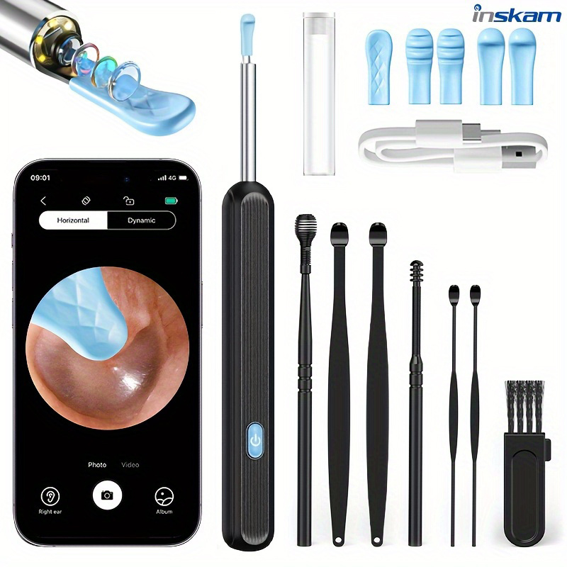 Kamera va yoritgich bilan quloq tozalagich, batareya yoki USB orqali quvvatlanadi. Barcha telefonlar bilan mos keladigan 7 ta quloq qoshiqni o'z ichiga oladi. Brend: INSKAM.