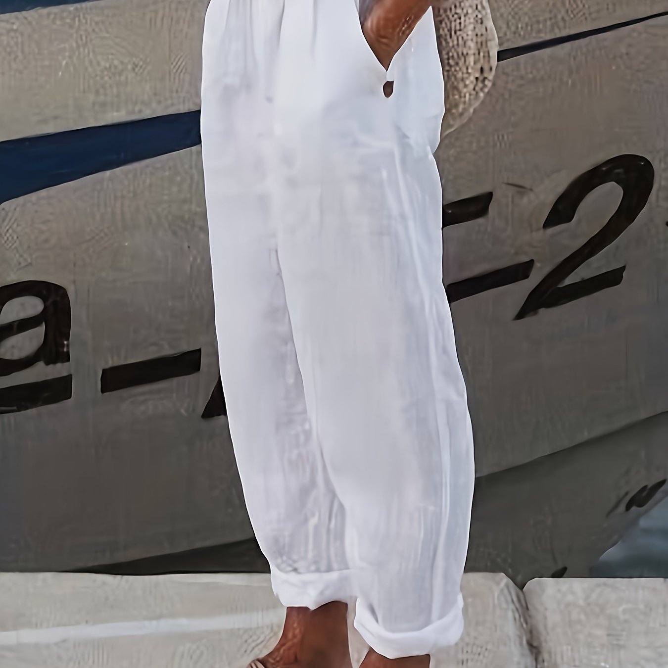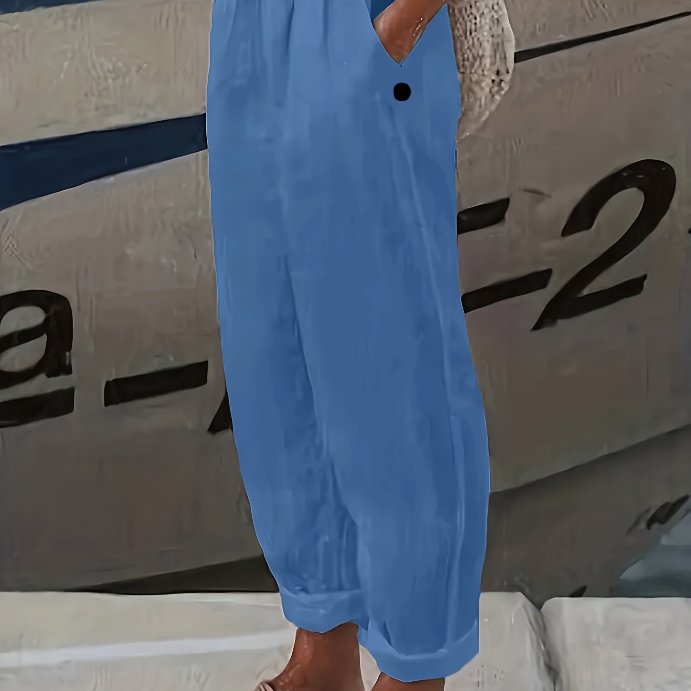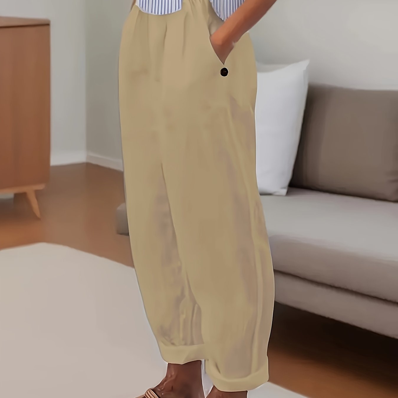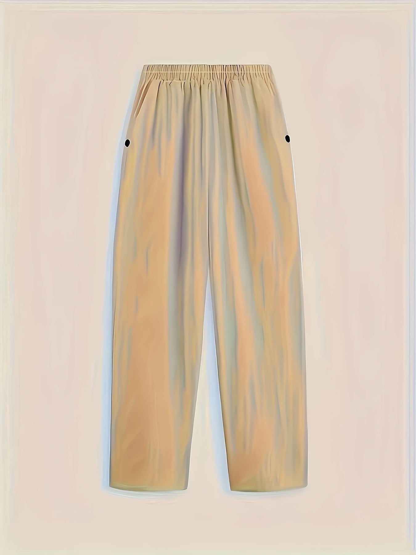 Bahor va yoz uchun elastik belli shimlar, qiyshiq cho'ntaklari bo'lgan katta o'lchamdagi ayollar kiyimlari.