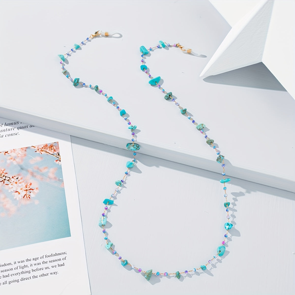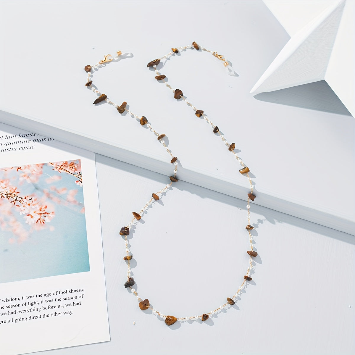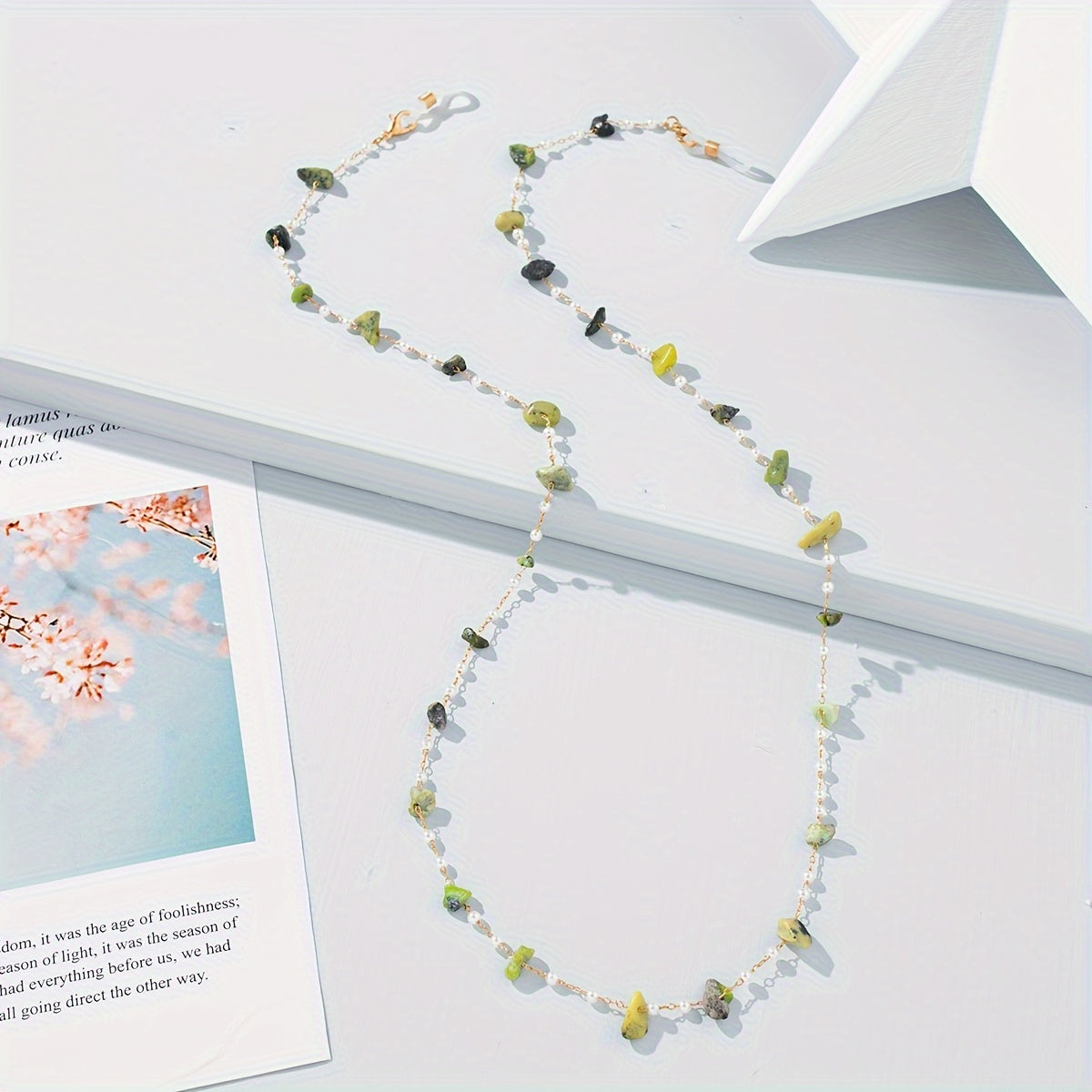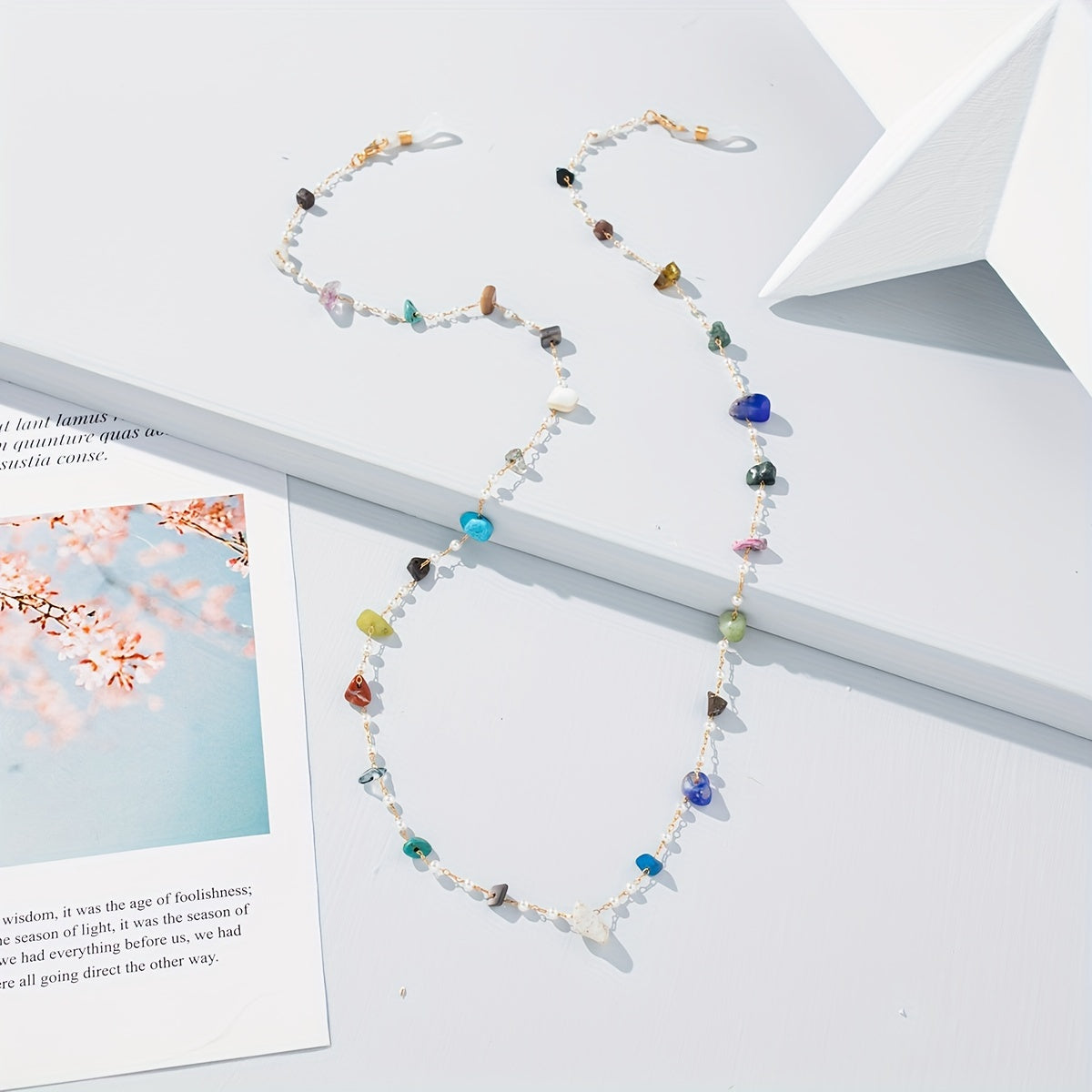 Nozik halter ko'zoynak zanjiri, notekis maydalangan tosh va aralash materiallardan tayyorlangan, ayollar uchun mukammal.