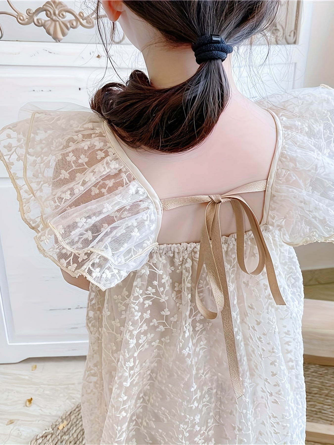 Qizlar uchun gullar bilan jacquard, uchuvchi yenglar va orqa qismi ochiq dizaynga ega nafis dantel ko'ylak.