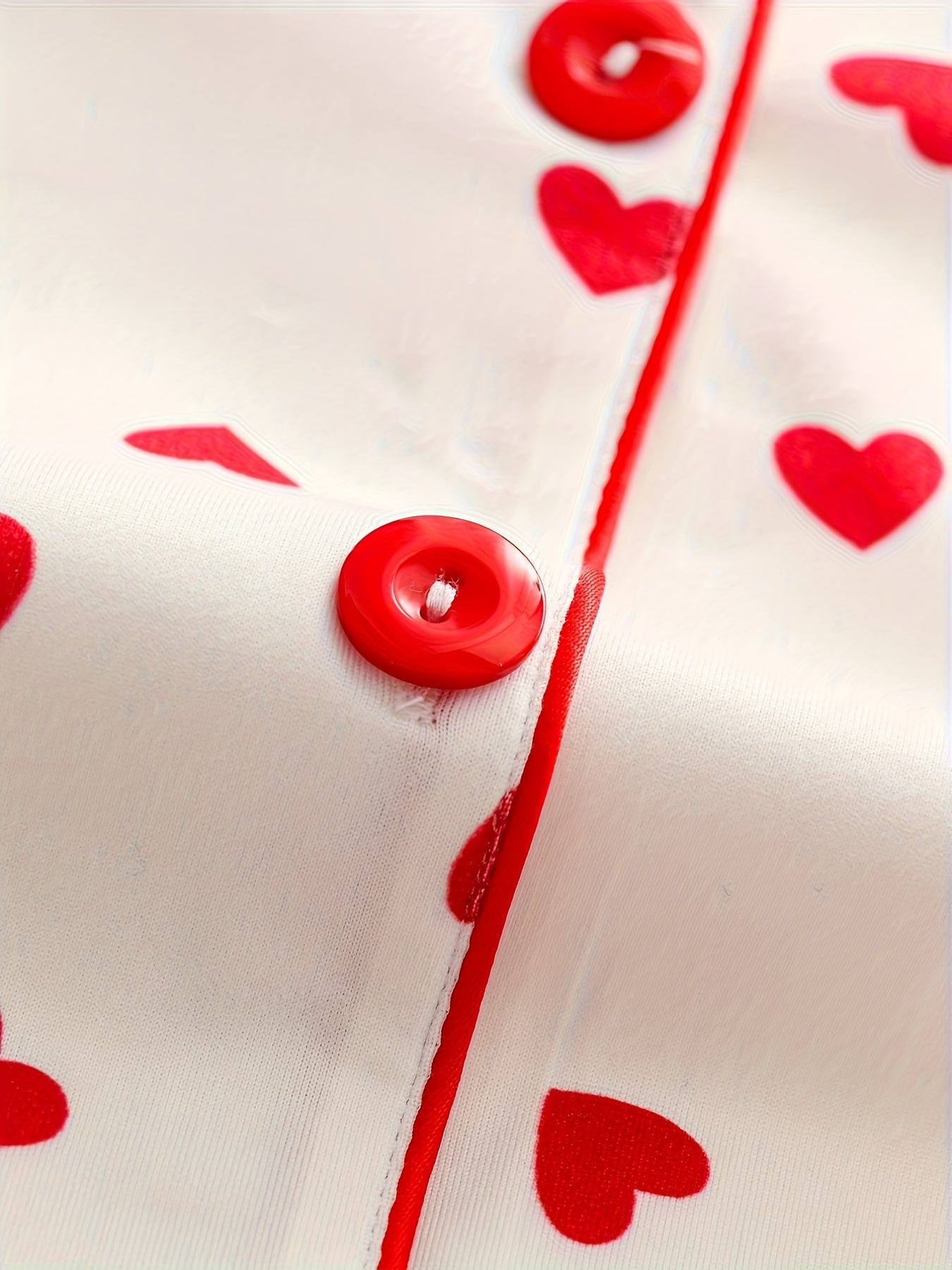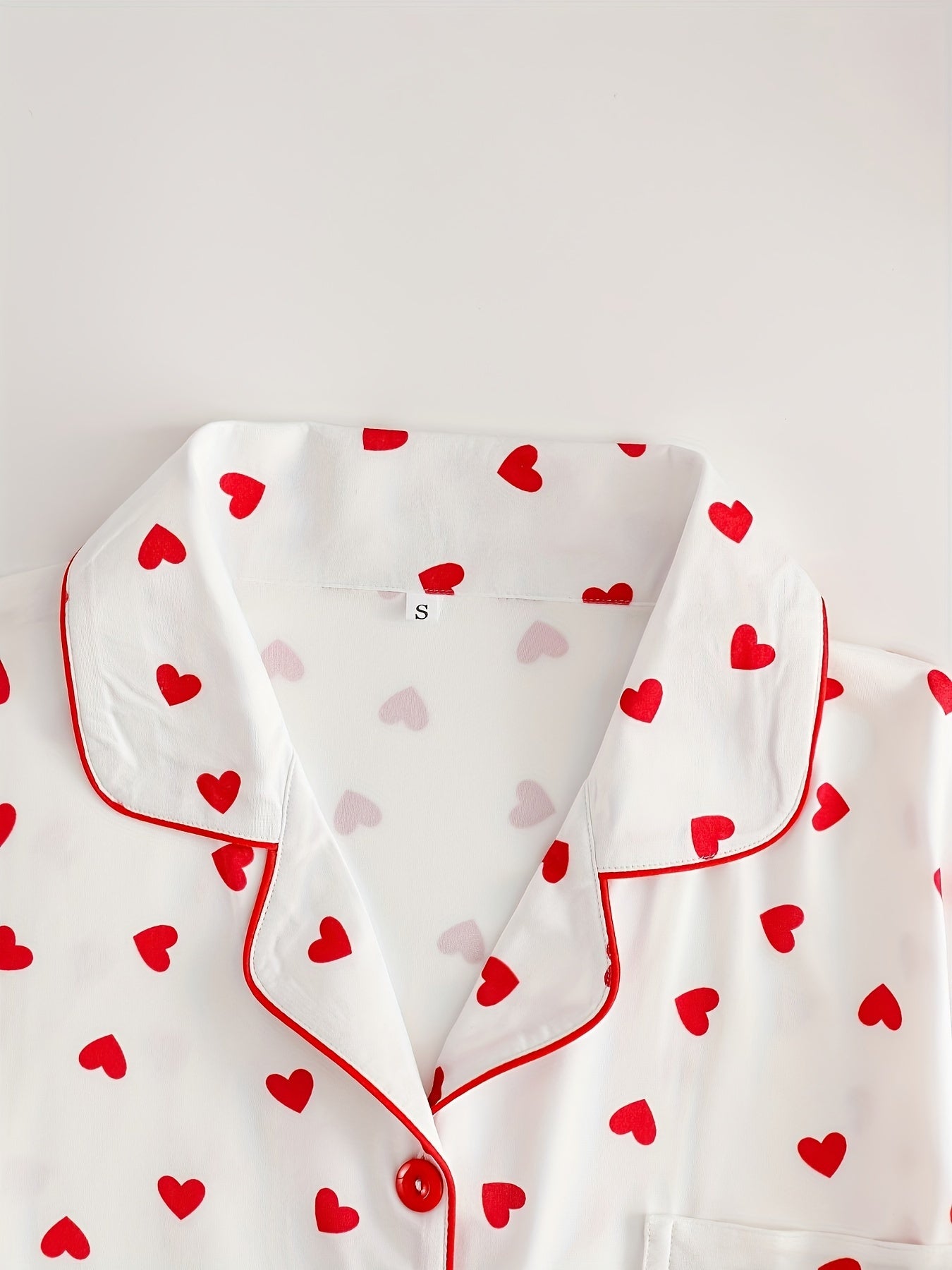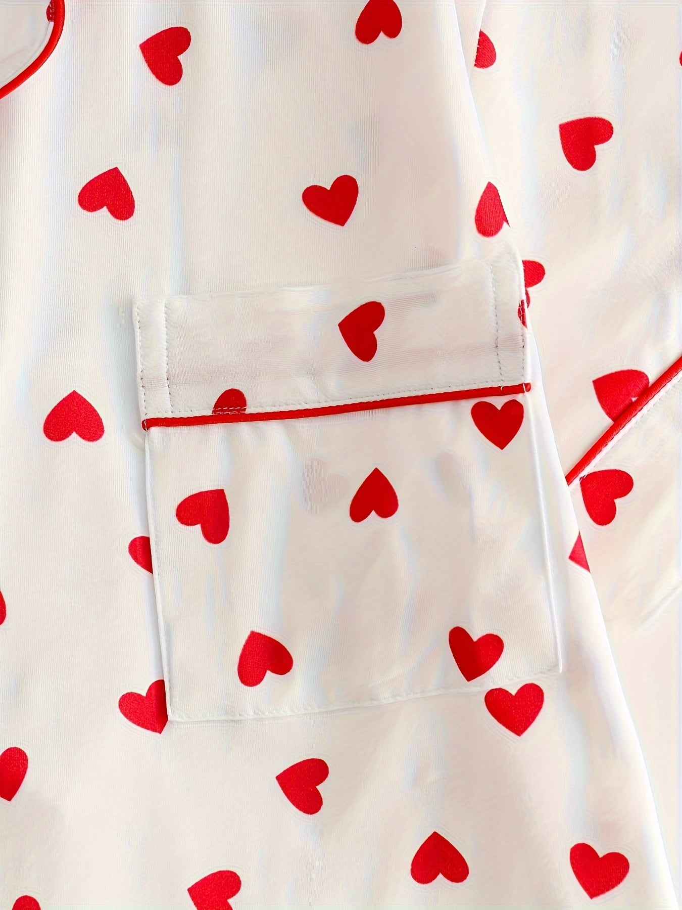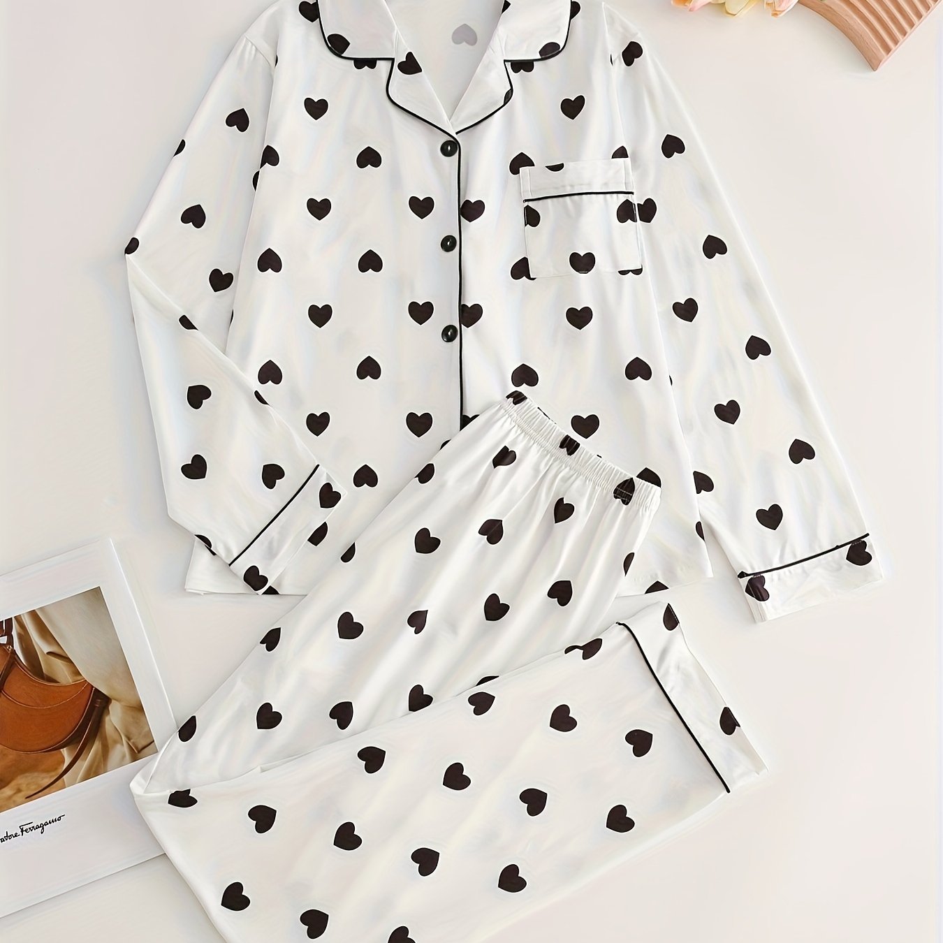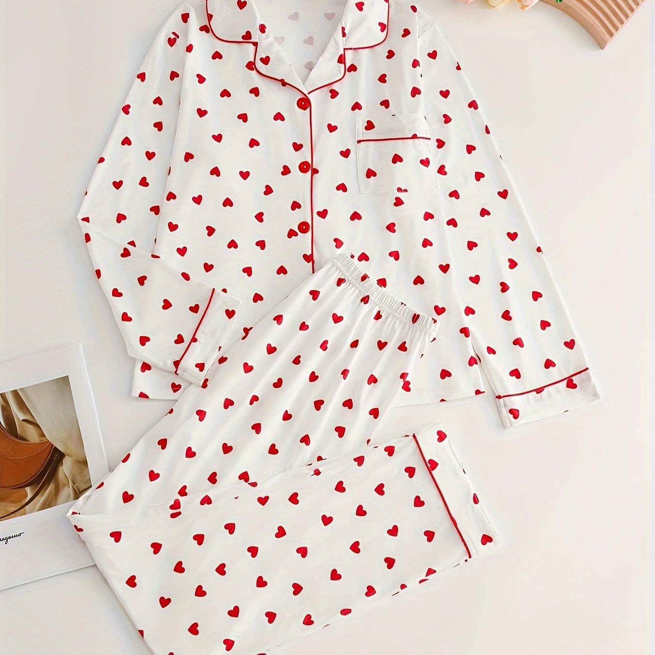 Bahor/kovak uchun uzun yengli yuqori va yurak naqshiga ega, uyda qulaylik uchun yumshoq shimlar bilan birga bo'lgan nozik ayol pijama to'plami.