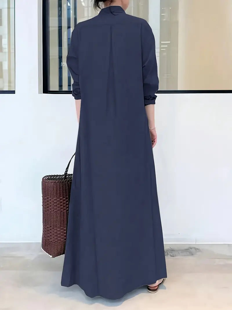 Minimalistik dizayndagi elegant zaytun yashil maxi ko'ylak, cho'zilmaydigan polyesterdan tayyorlangan. Yengil va mashinada yuvish mumkin. Ayollar uchun barcha mavsumlarda kiyish uchun mos.