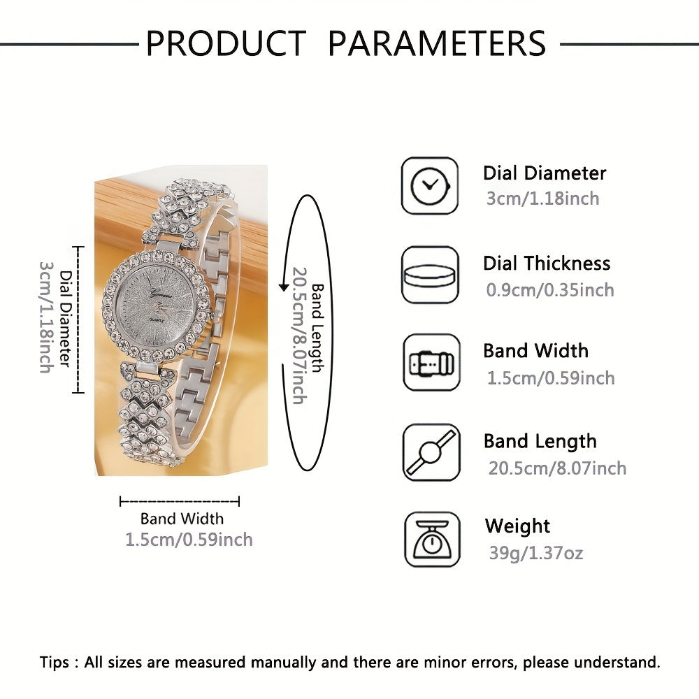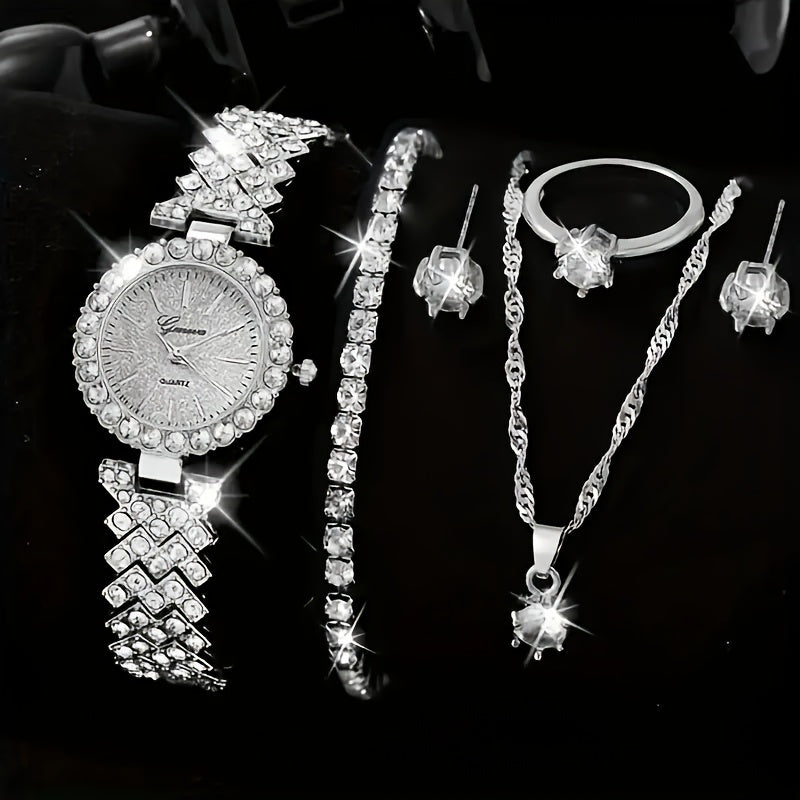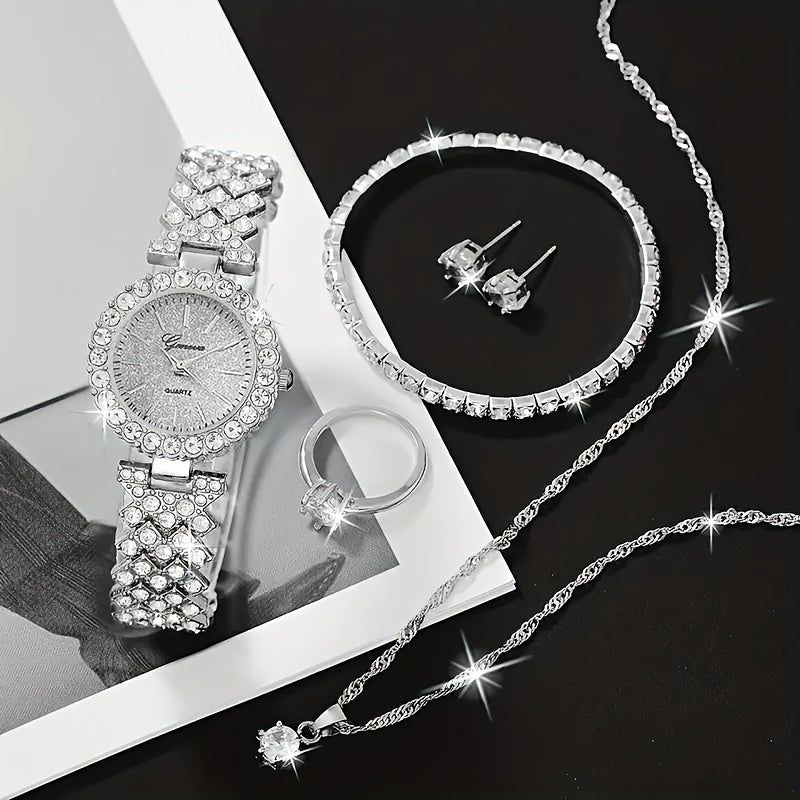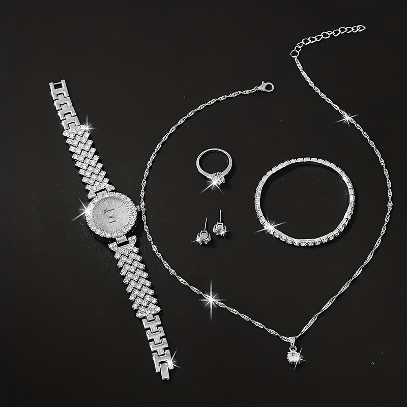 Rinestones bilan bezatilgan 6 ta kvarts soatning elegant to'plami, marjon, bilaguzuk, taqinchoq va uzukni o'z ichiga oladi. Onalar yoki qiz do'stlar uchun maxsus tadbirlarda mukammal sovg'a.