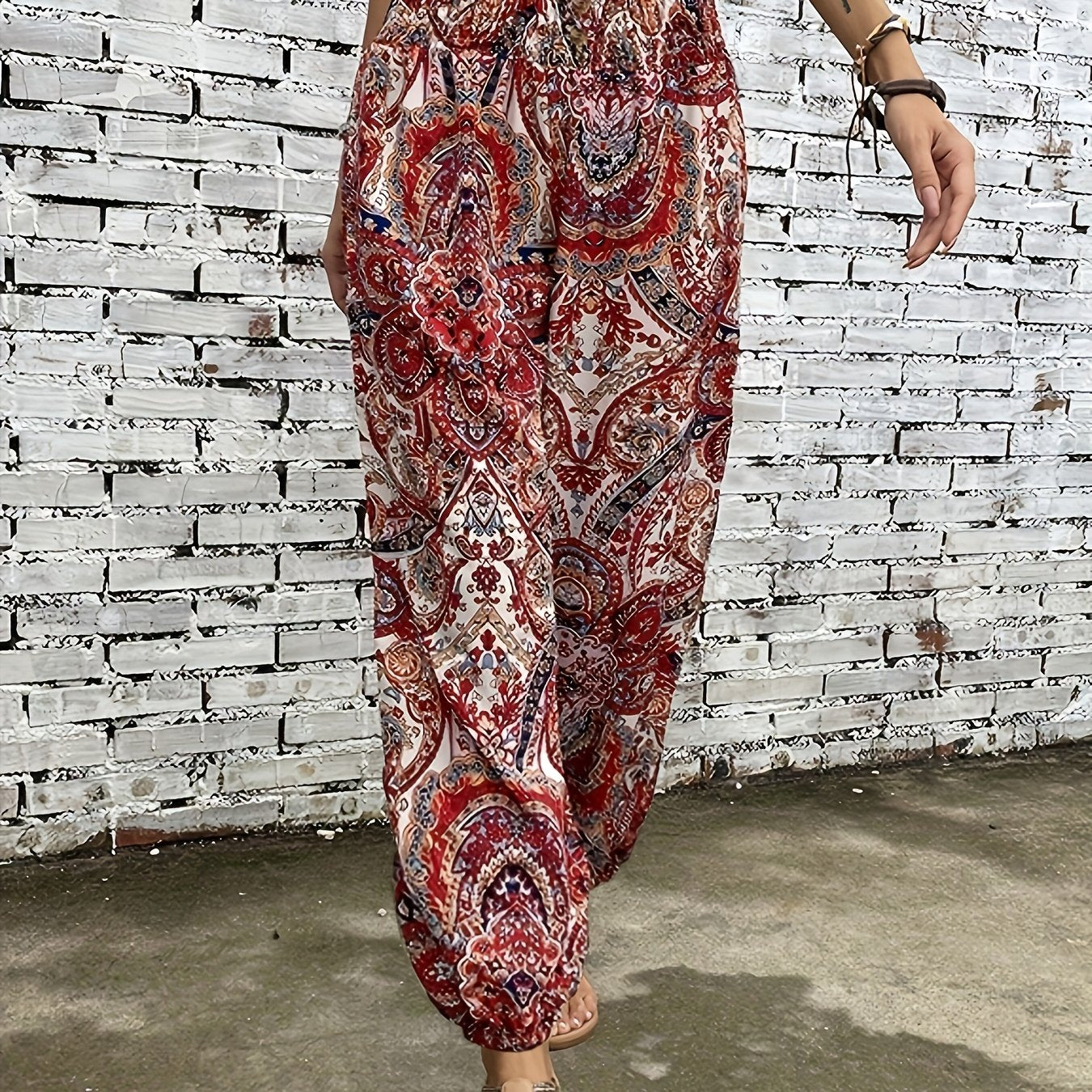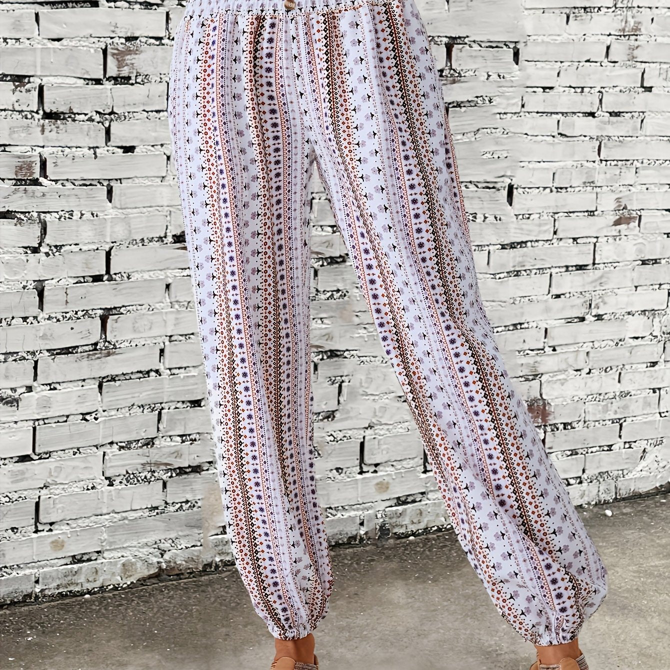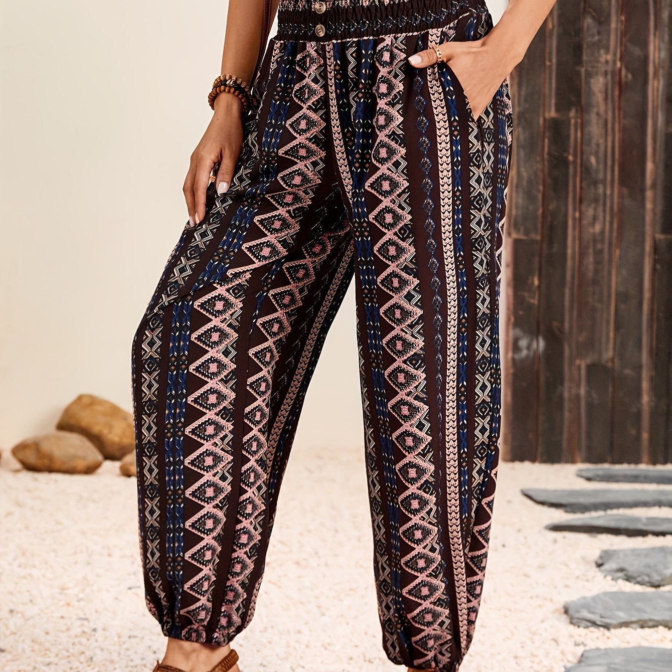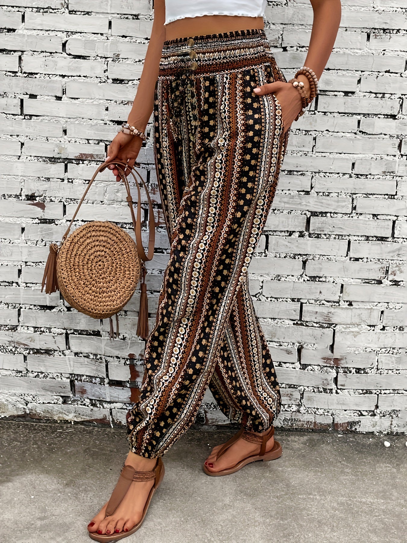 Ayollar uchun cho'ntak, tugma va elastik bel bilan plus-size etnik uslubda bosma shimlar.