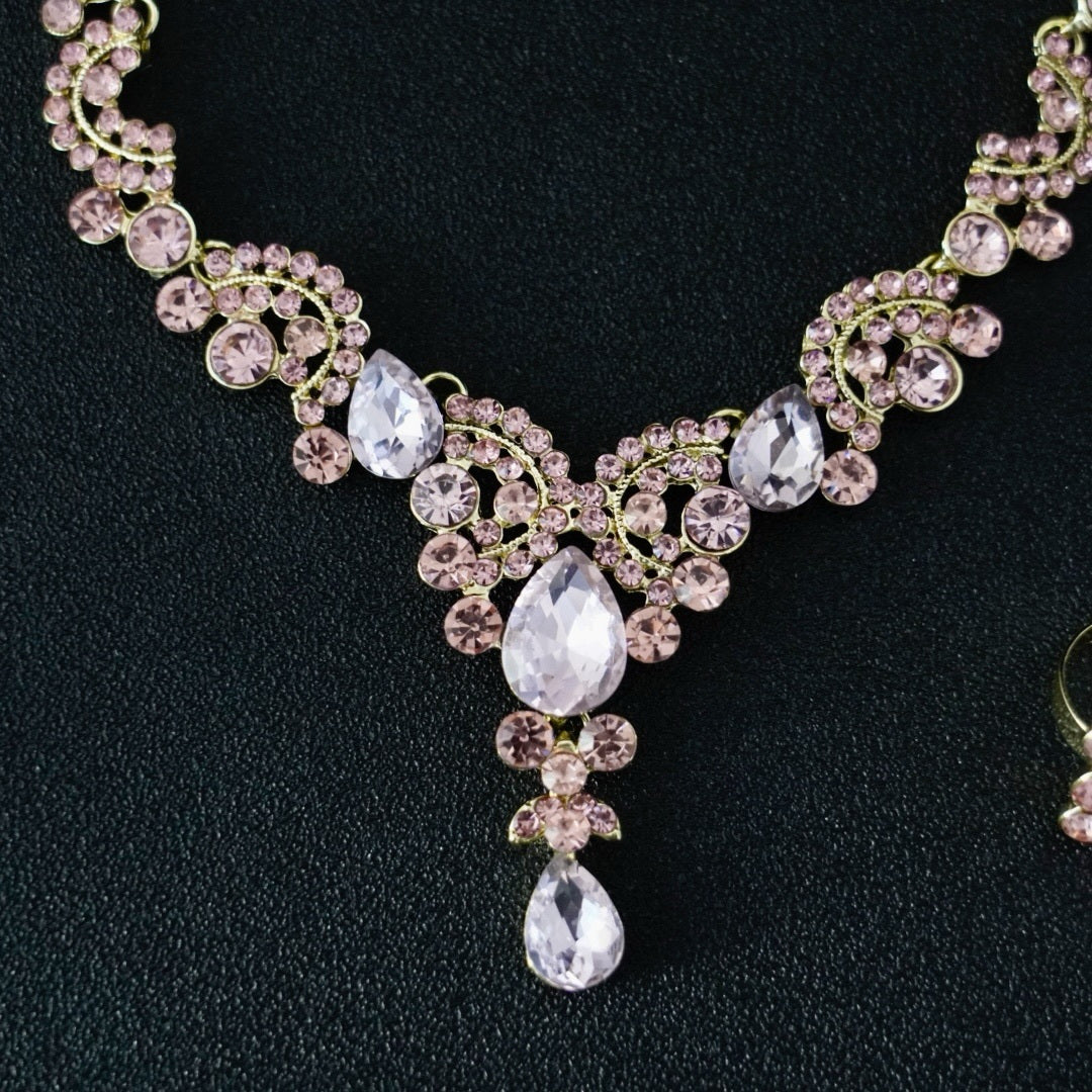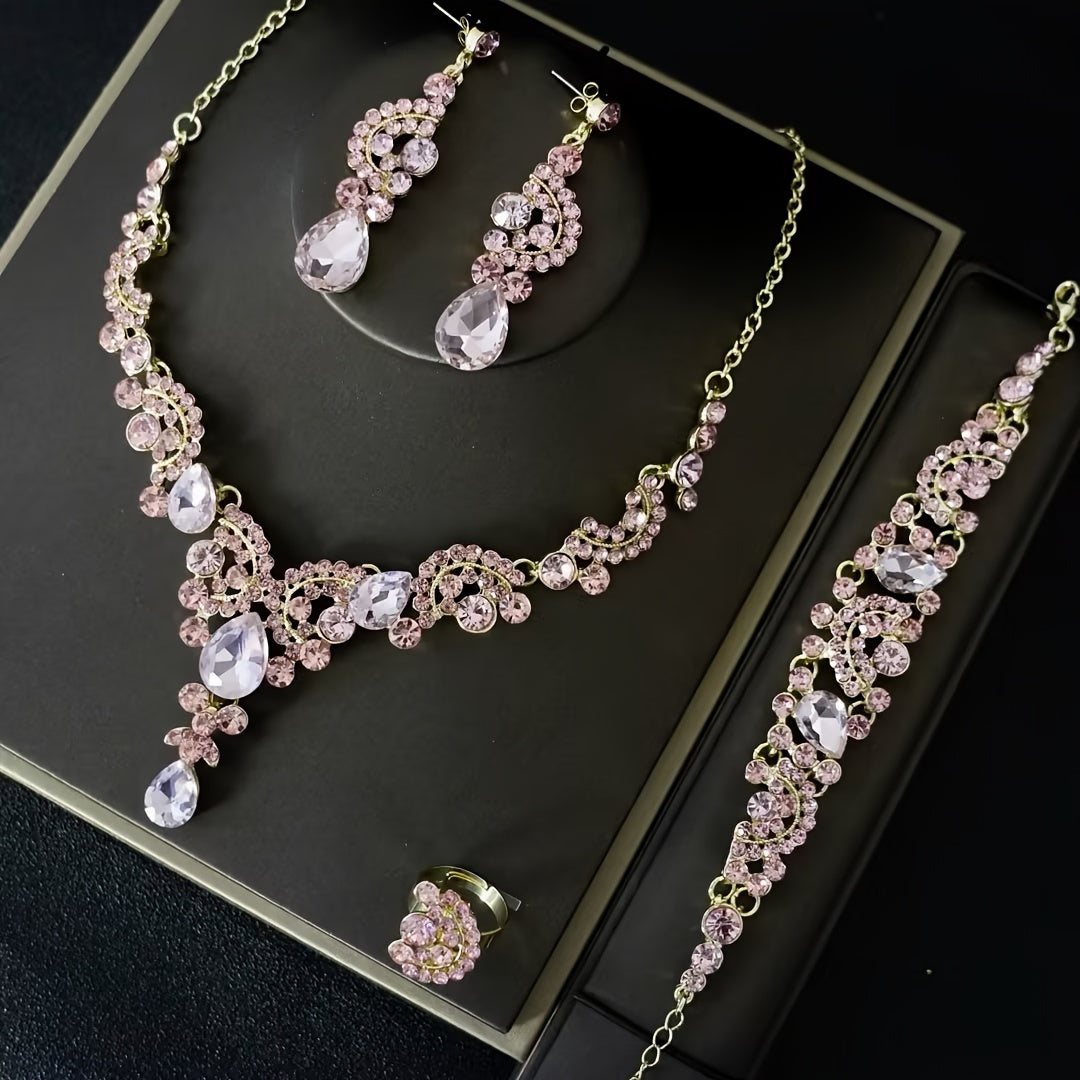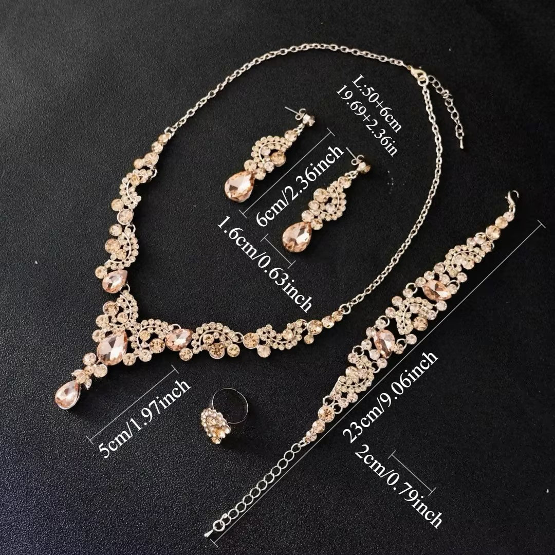 Ayollar uchun nozik 5 qismli zargarlik to'plami - Sink qotishmasidan va porloq rhinestone'lardan tayyorlangan, quloq bilaguzuklari, marjon, bilaguzuk va uzukni o'z ichiga oladi - To'y, ziyofat yoki banket kiyimlaringizga mukammal qo'shimcha