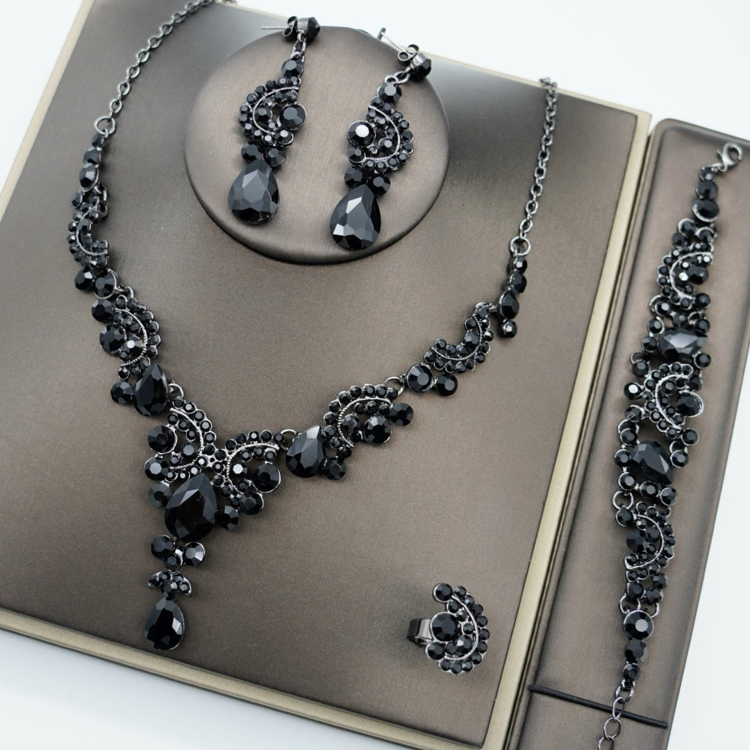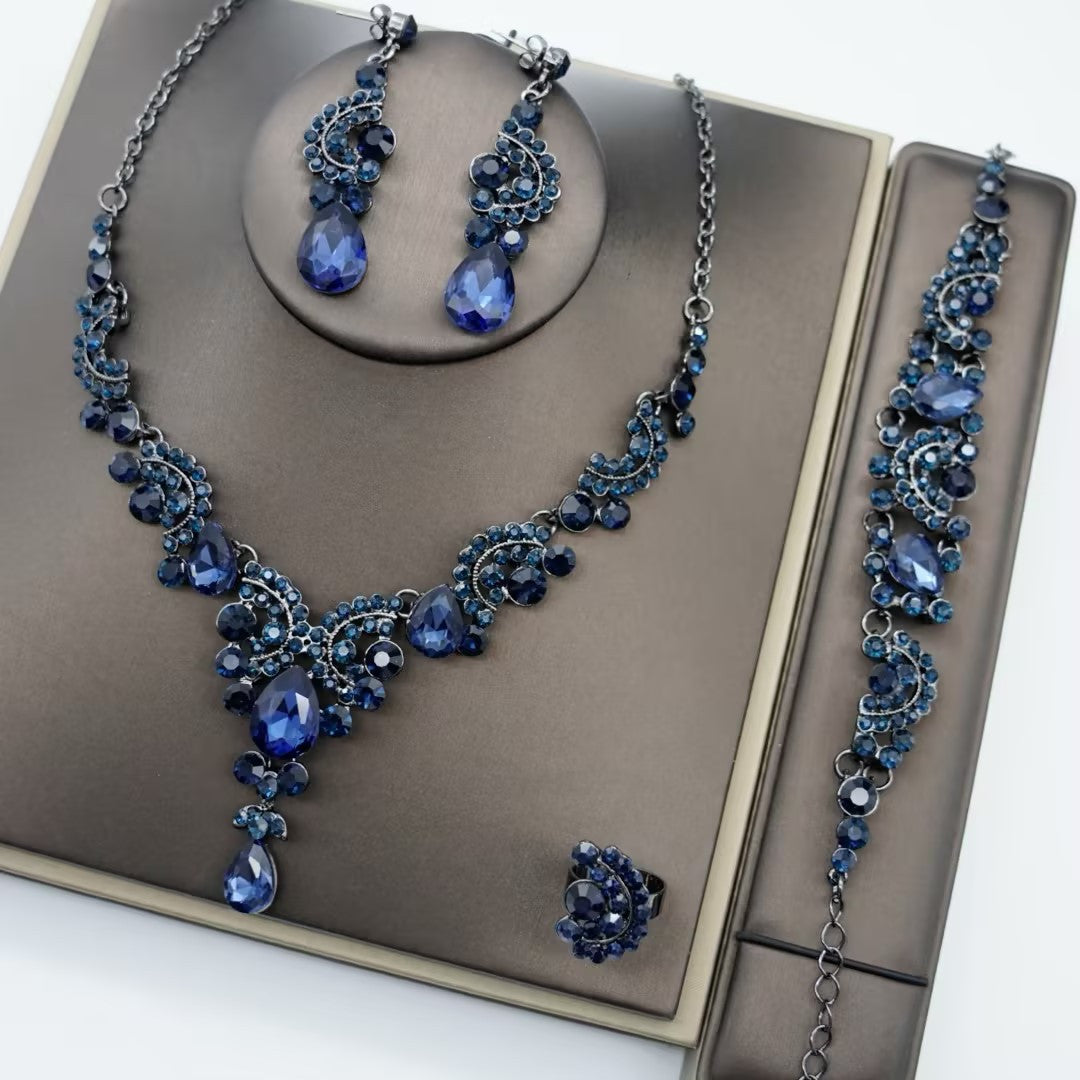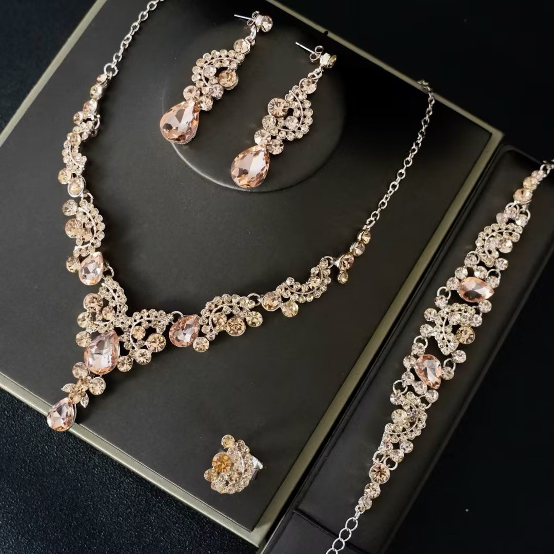 Ayollar uchun nozik 5 qismli zargarlik to'plami - Sink qotishmasidan va porloq rhinestone'lardan tayyorlangan, quloq bilaguzuklari, marjon, bilaguzuk va uzukni o'z ichiga oladi - To'y, ziyofat yoki banket kiyimlaringizga mukammal qo'shimcha