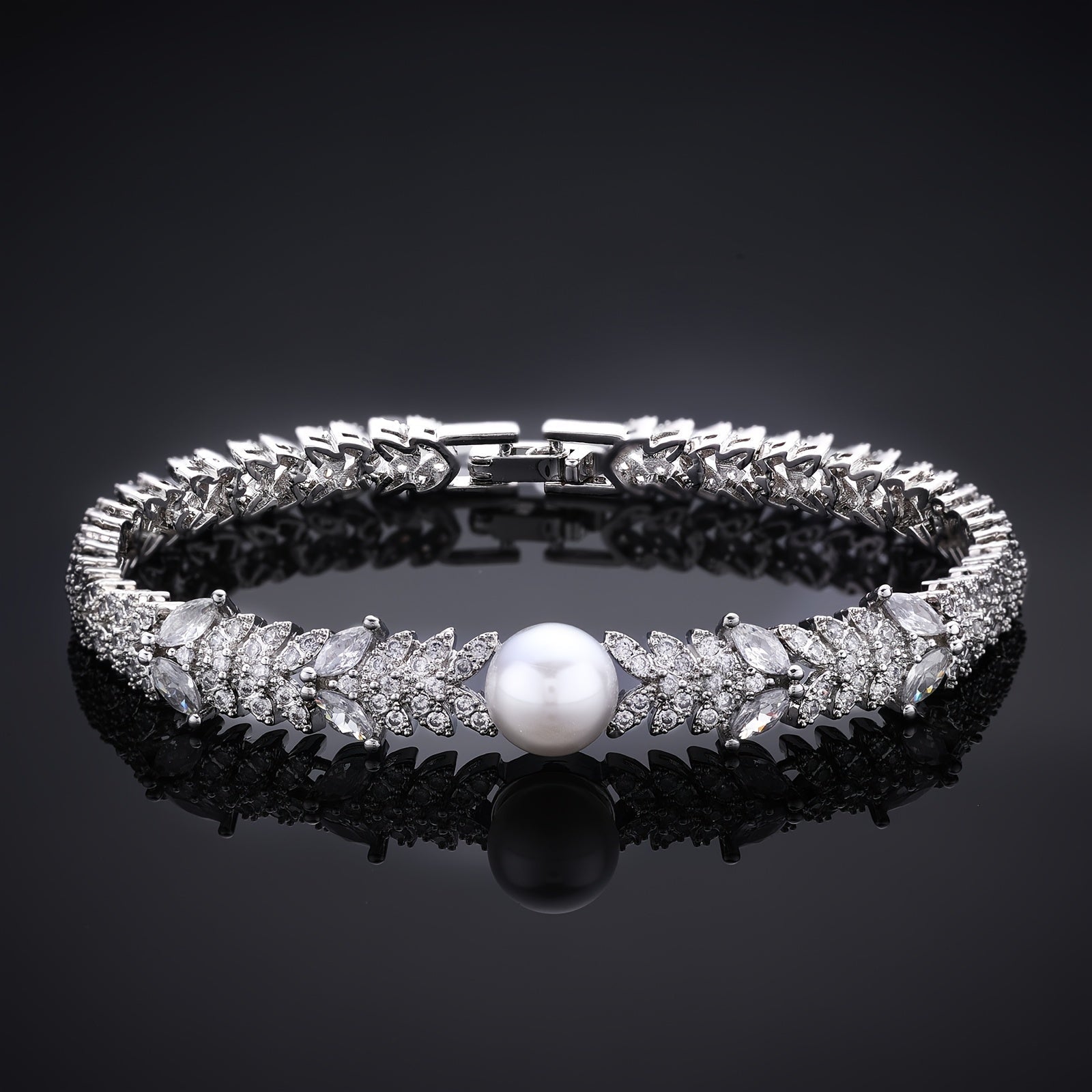 Ayollar uchun nozik to'y zargarlik to'plami, maxsus kuningizda hashamatli tuyg'u berish uchun yuqori sifatli kubik zirkoniya va sun'iy marvaridlarni o'z ichiga oladi.