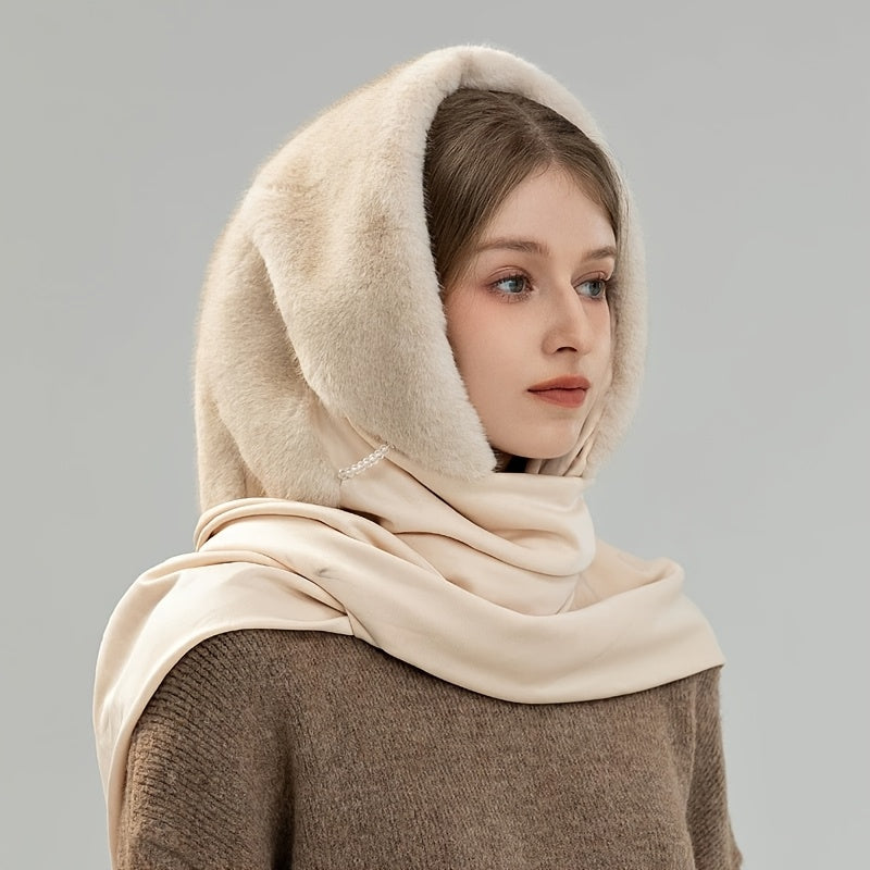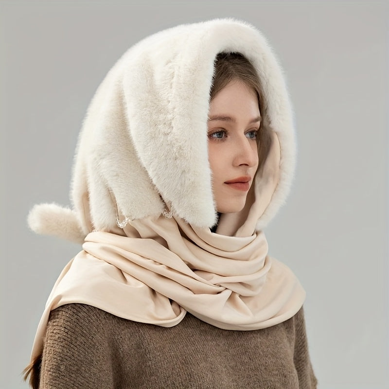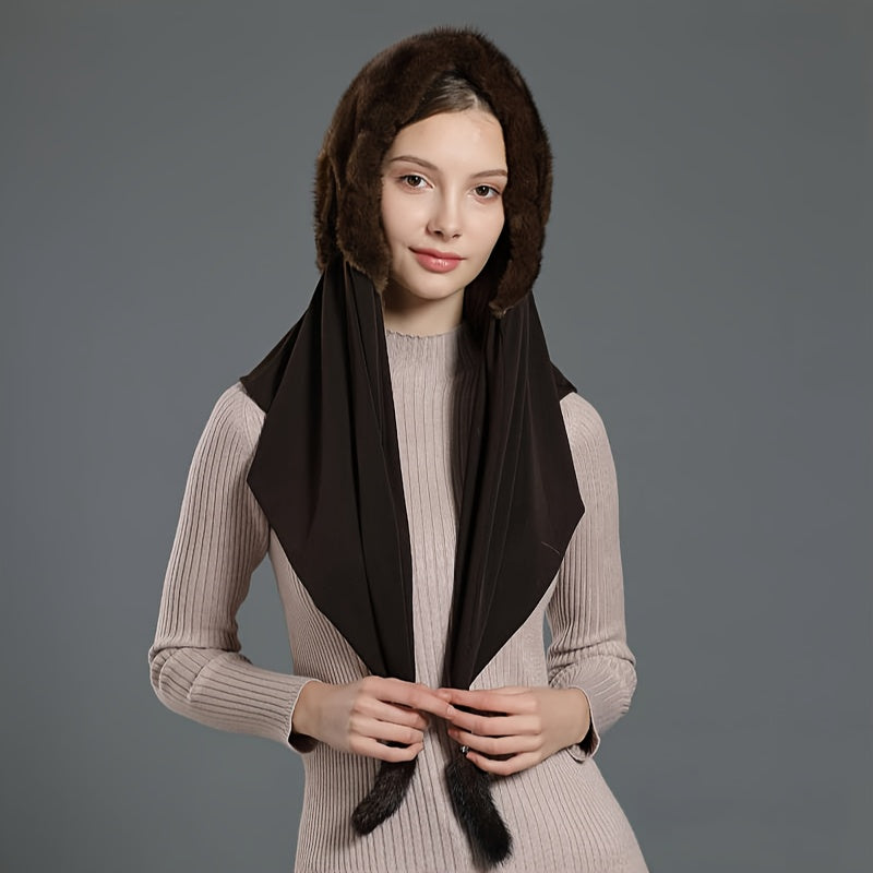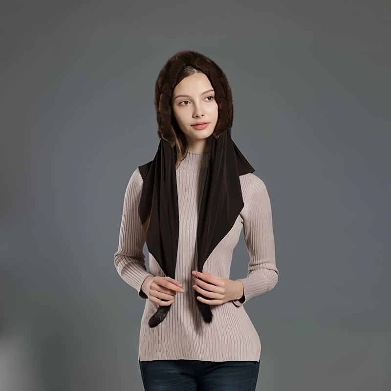 Qora rangda qizil aksentlar bilan bezatilgan zamonaviy ayollar uchun soxta mink mo'ynali sharf shlyapa, kuz/qish uchun mukammal.