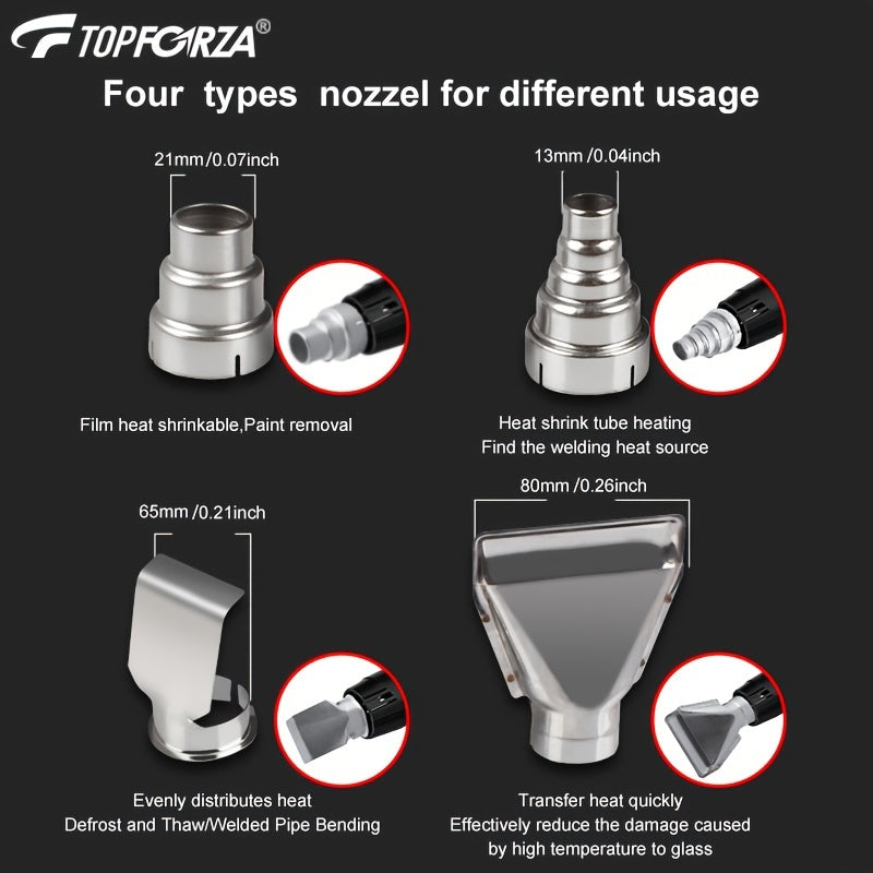 Tez isitiladigan issiq qurol, haroratni boshqarish va ortiqcha yukdan himoya qilish bilan, hunarmandchilik, PVC qisqarishi va bo'yoqni olib tashlash uchun ideal. To'plam 4 ta nozzleni o'z ichiga oladi.