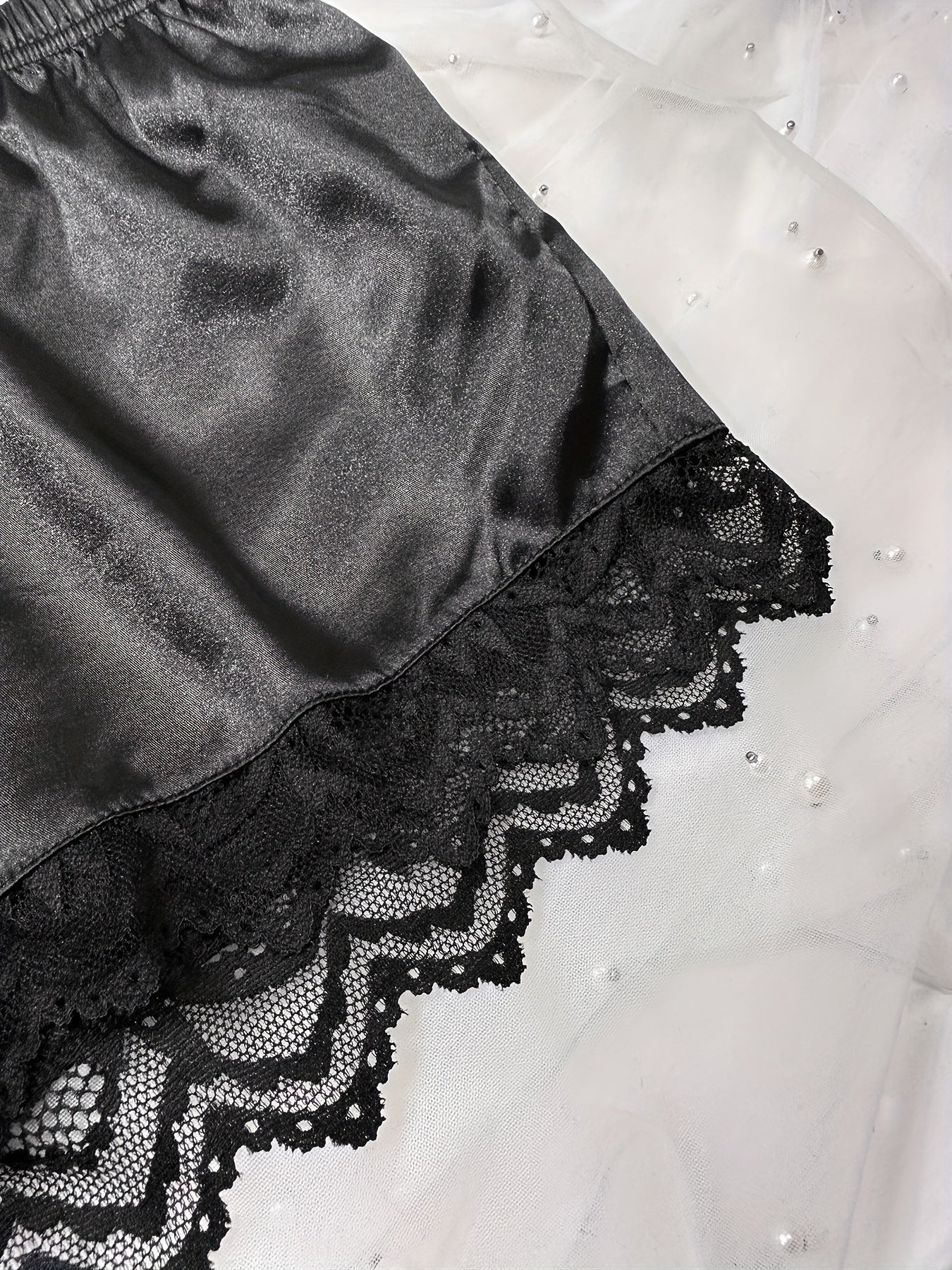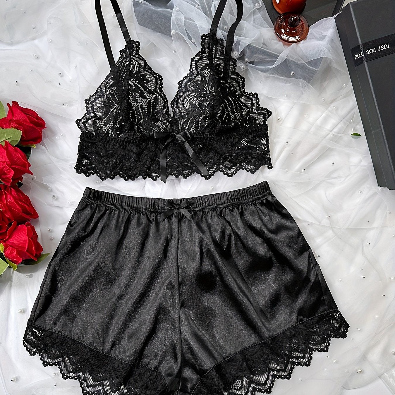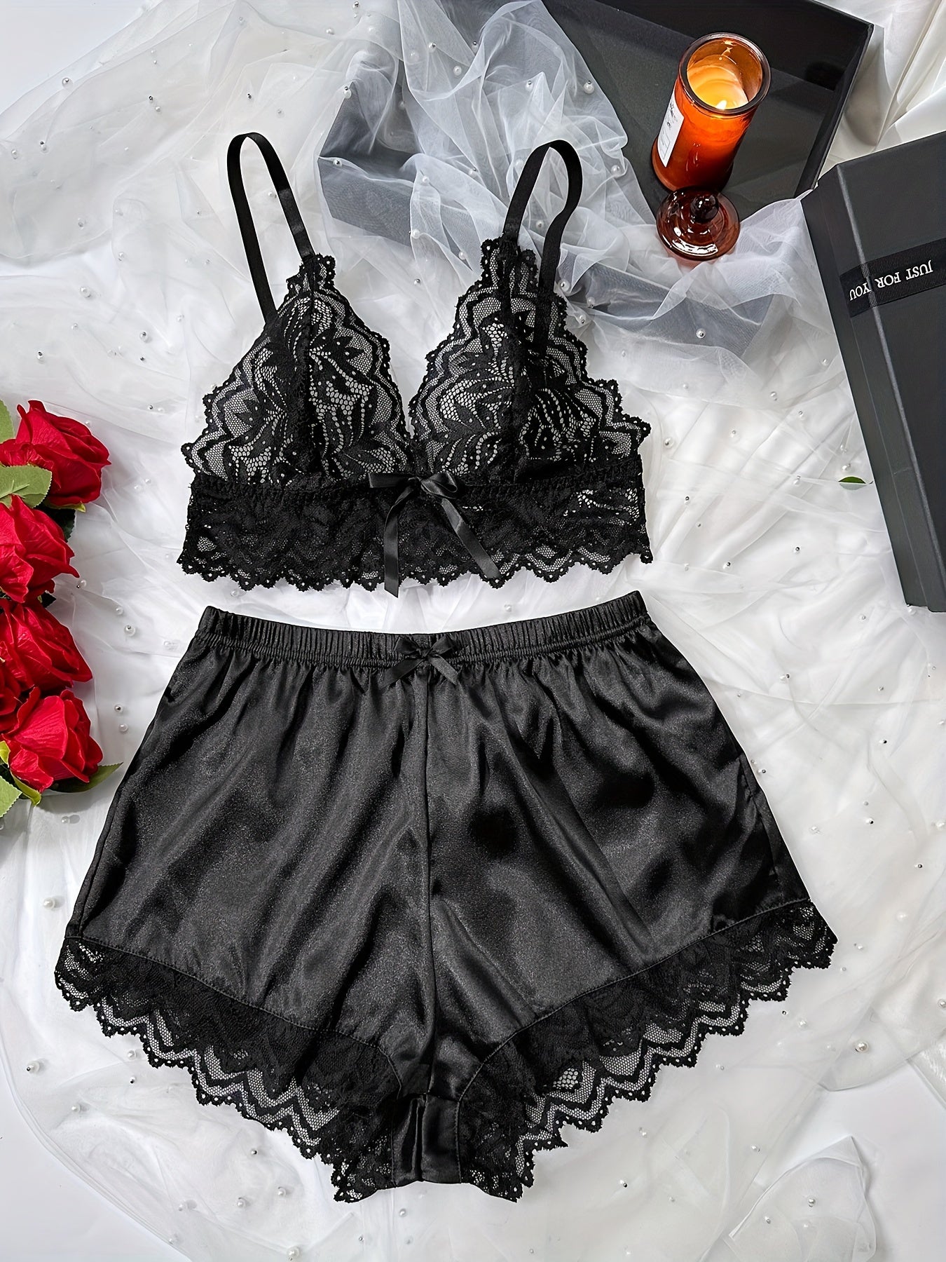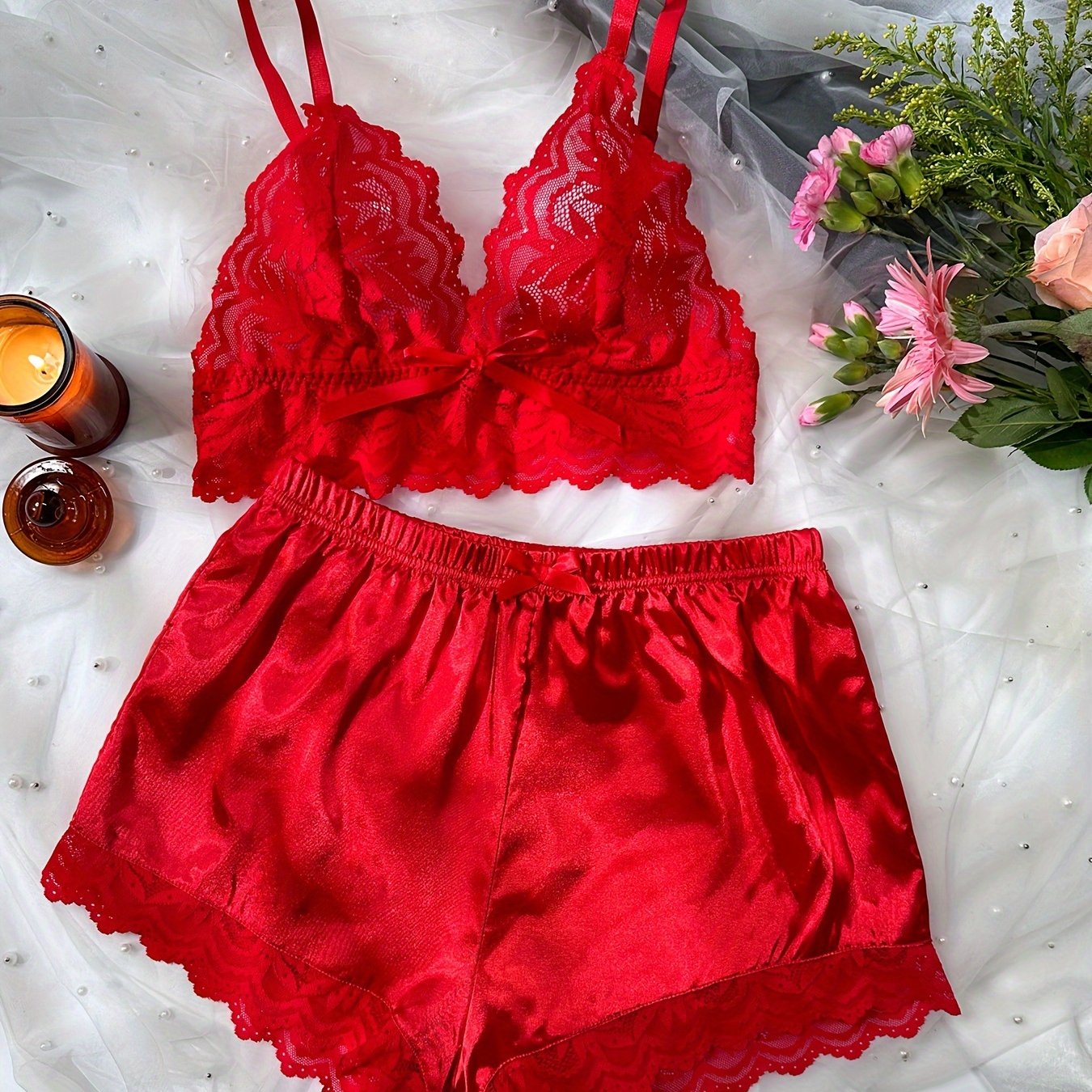 Gul naqshli dantel ichki kiyim to'plami, bog'ichli kamizol, atlas shortilar - ayollar uchun sexy ichki kiyim.