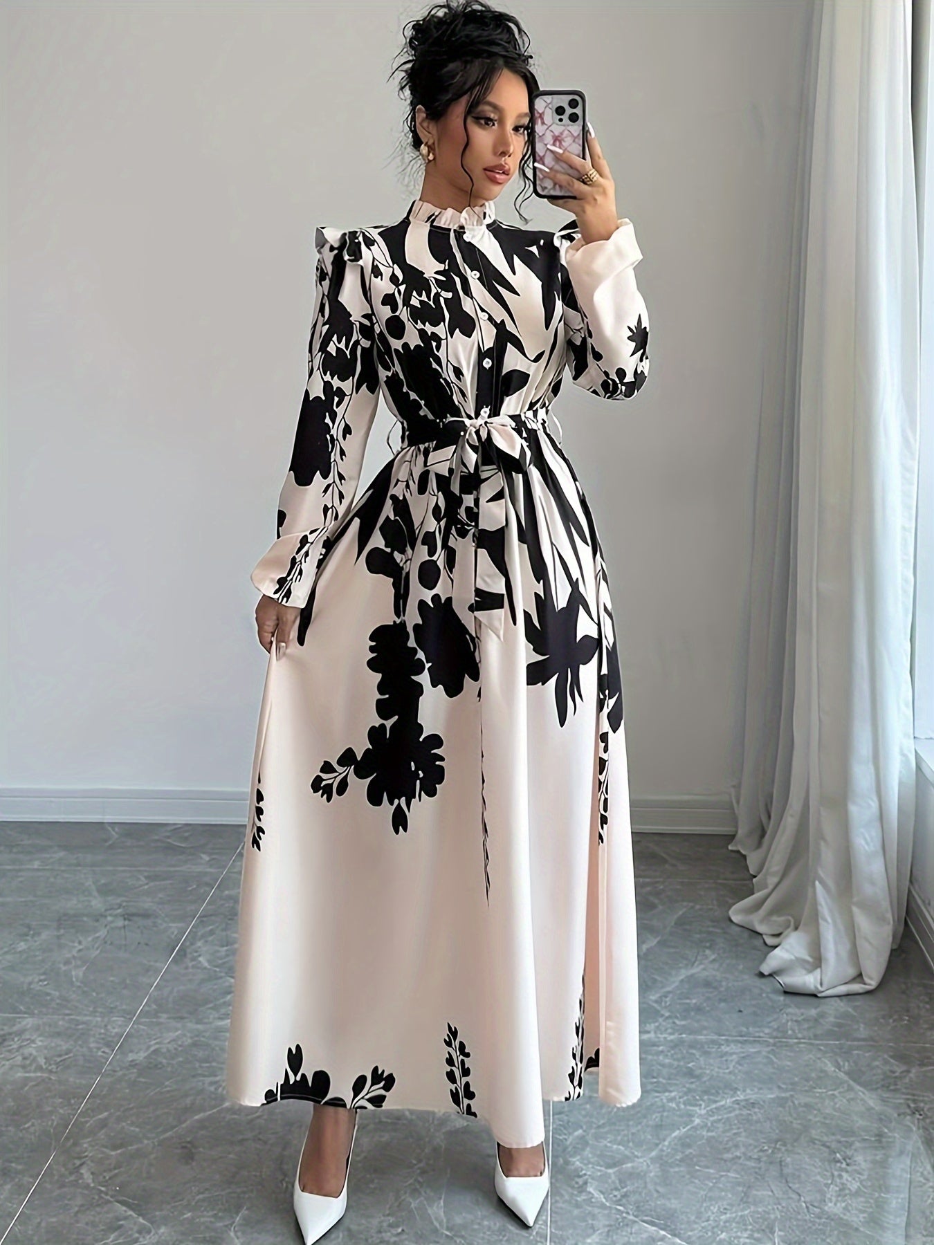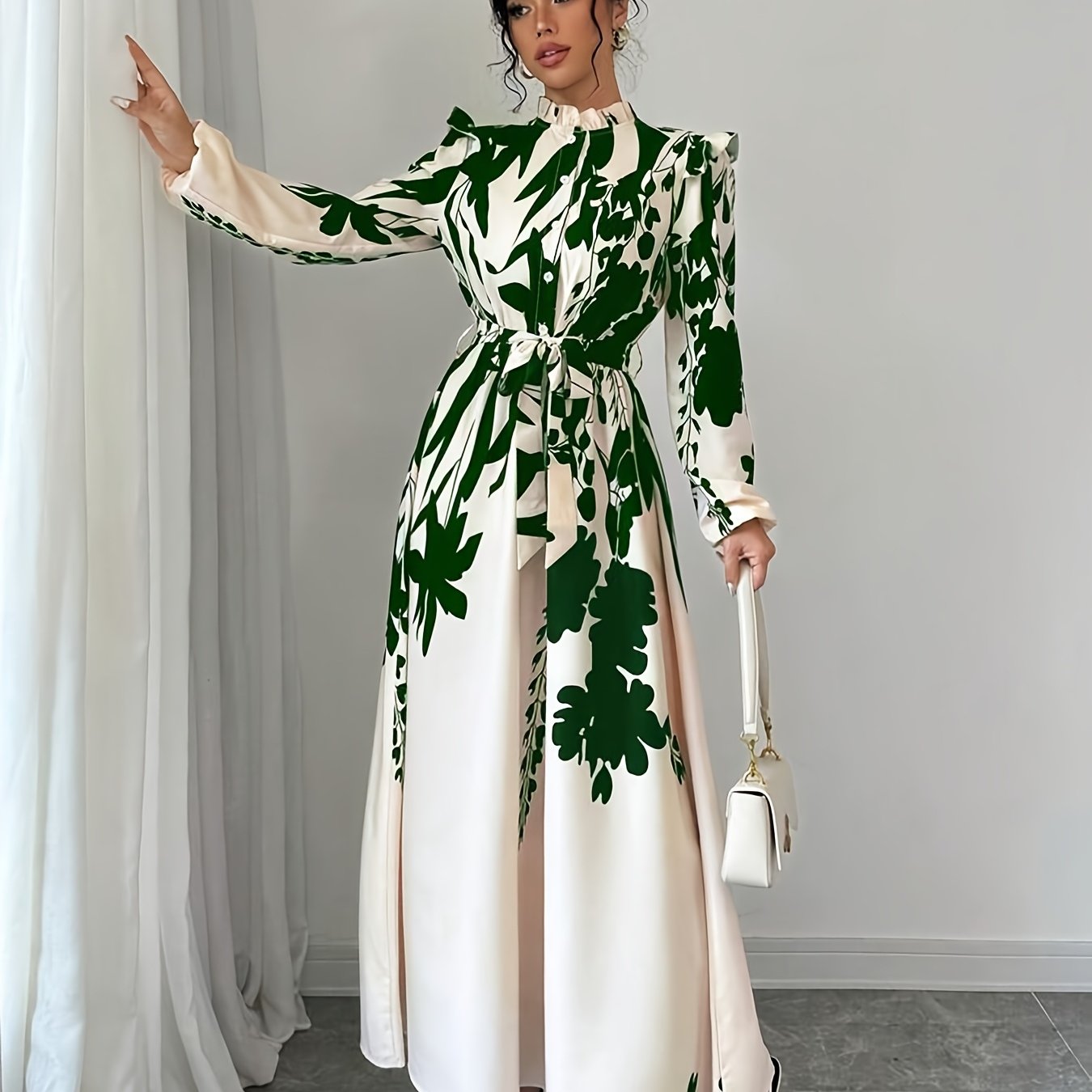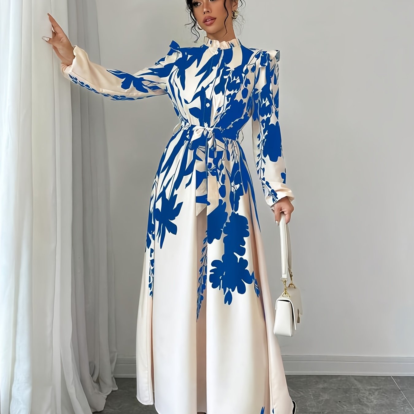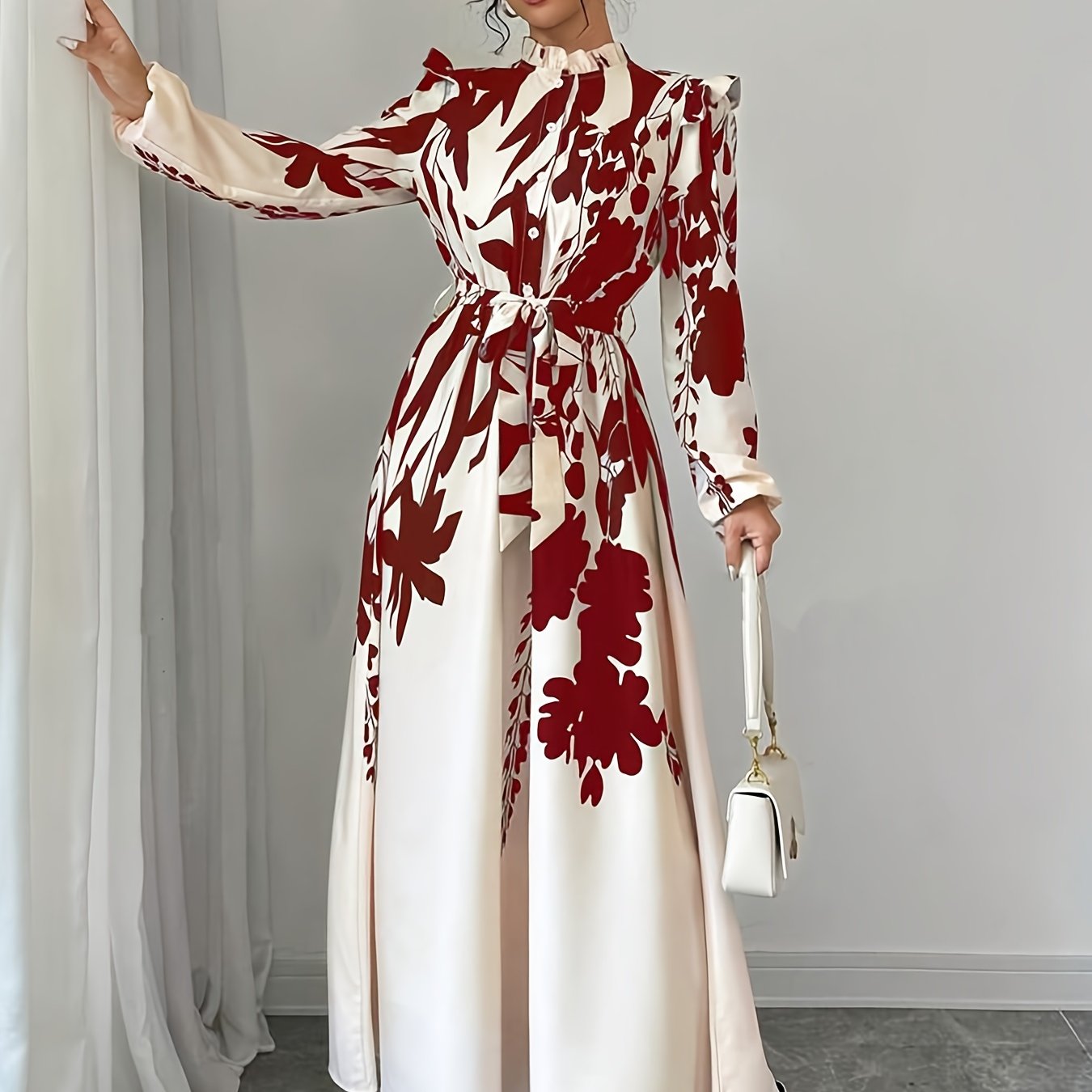 Gul naqshli maksi ko'ylak, turli xil yenglar, bel detali va qirrali pastki qismi bilan, bahor yoki kuz uchun mukammal.