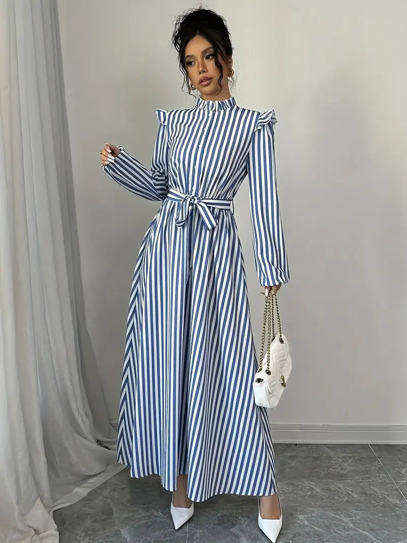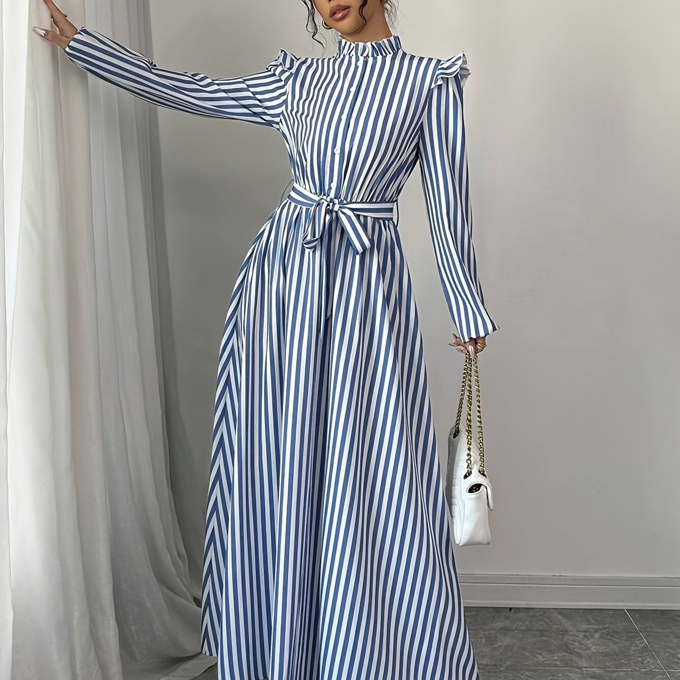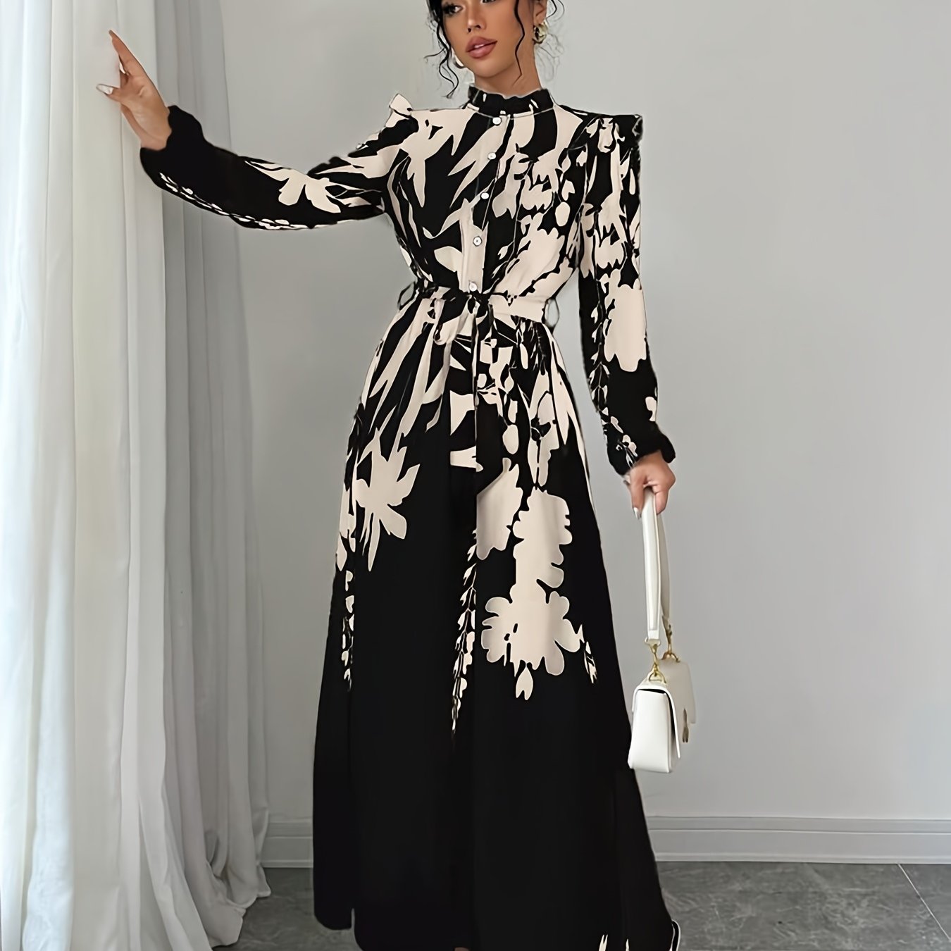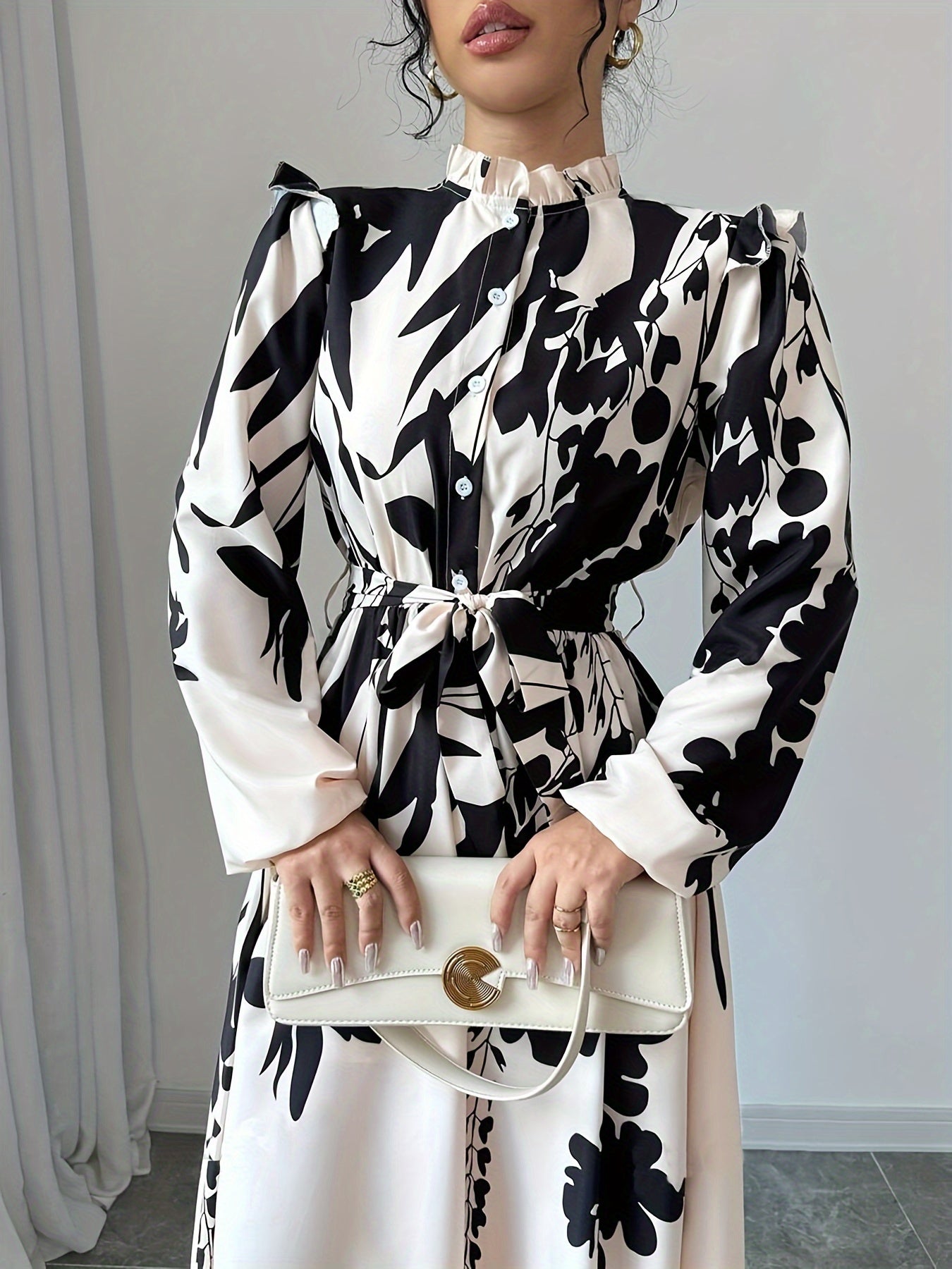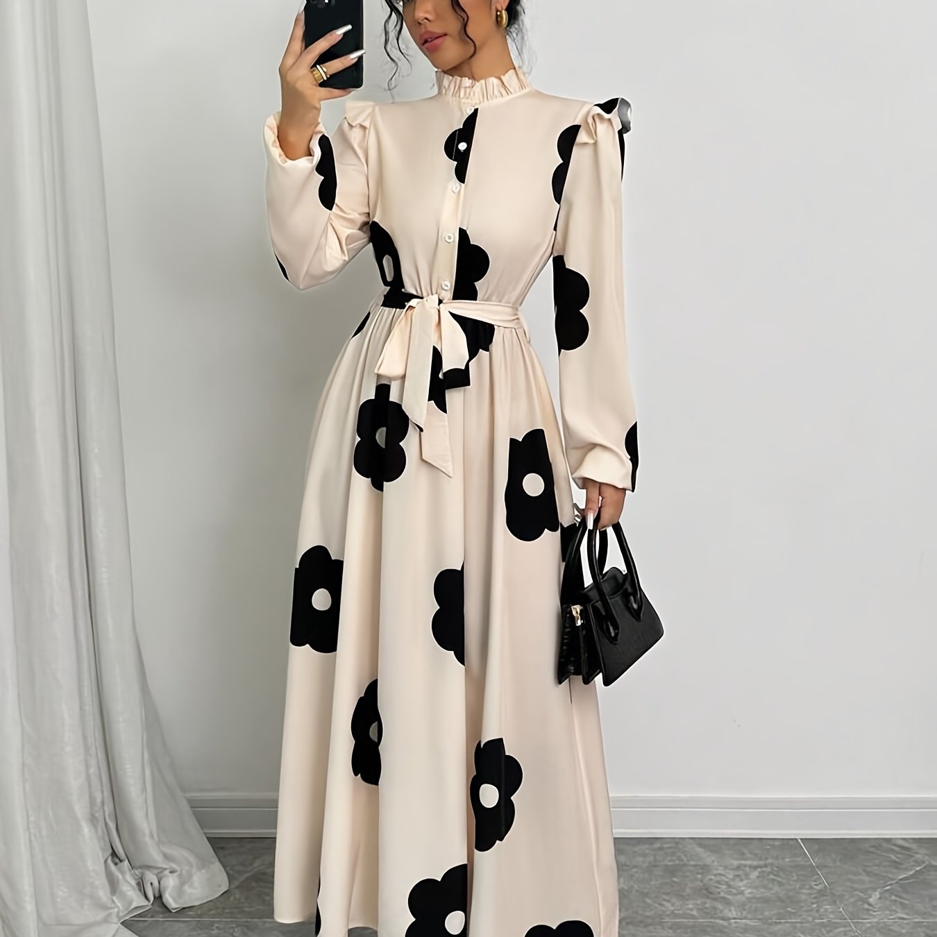 Gul naqshli maksi ko'ylak, turli xil yenglar, bel detali va qirrali pastki qismi bilan, bahor yoki kuz uchun mukammal.