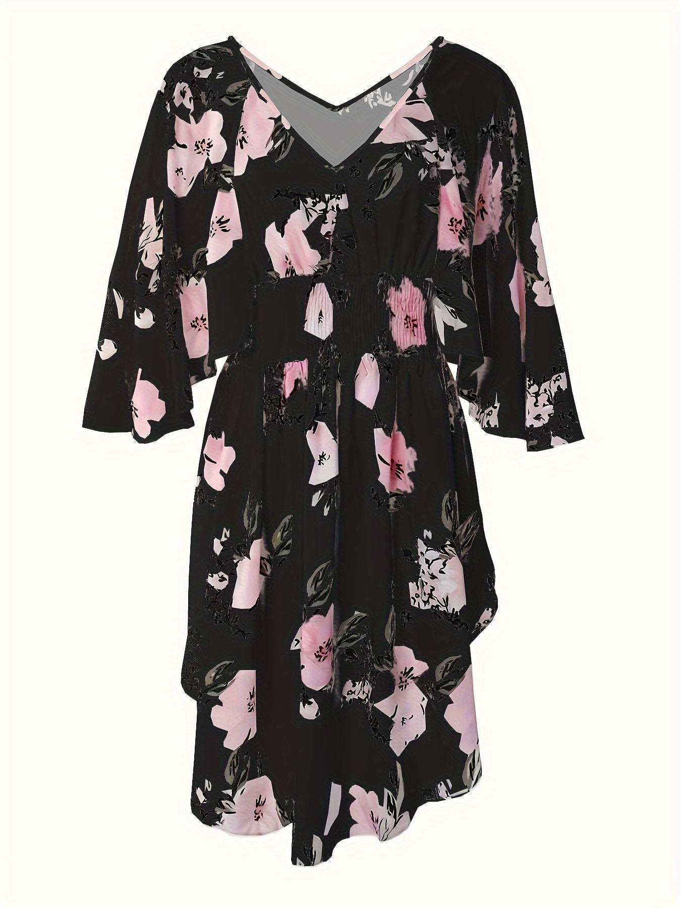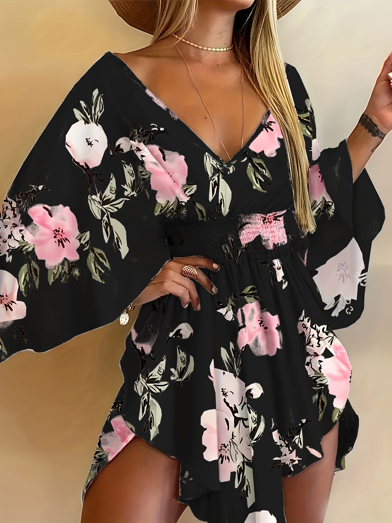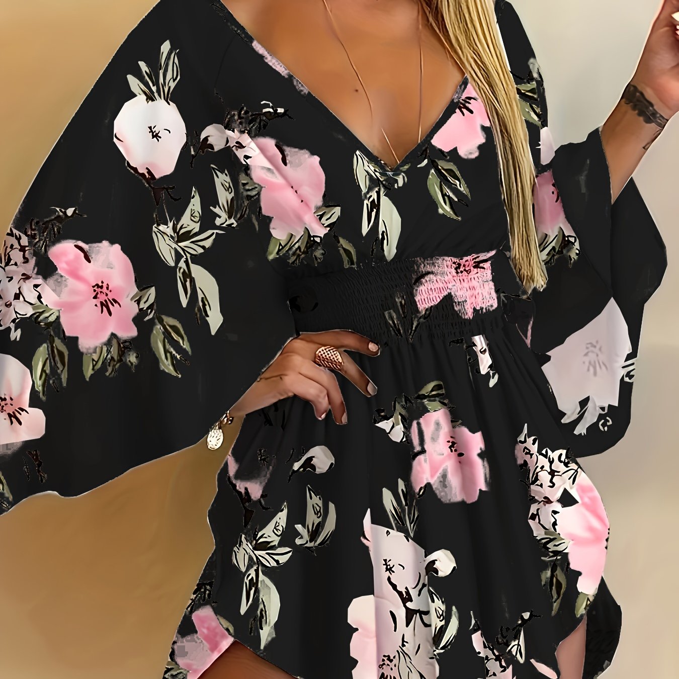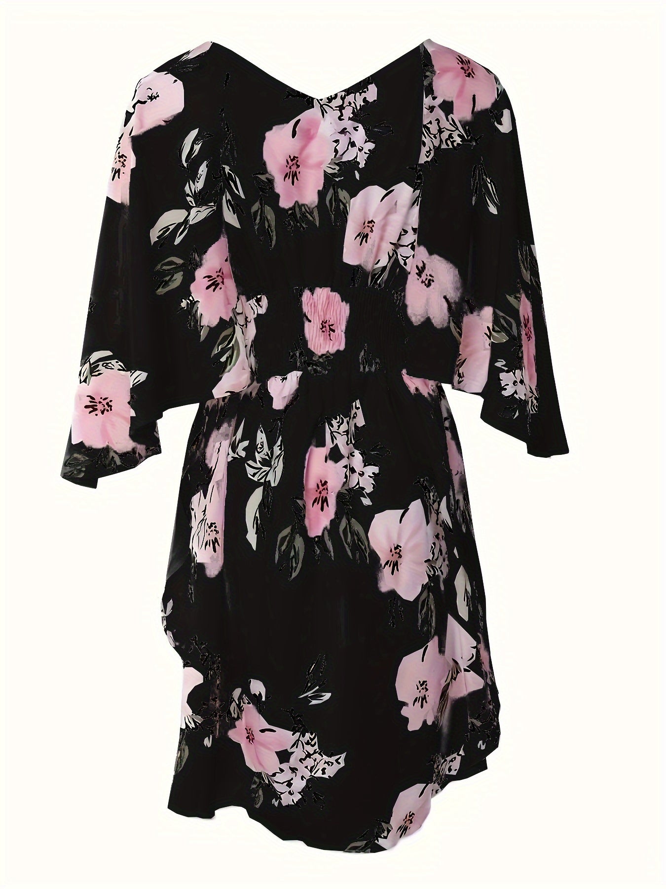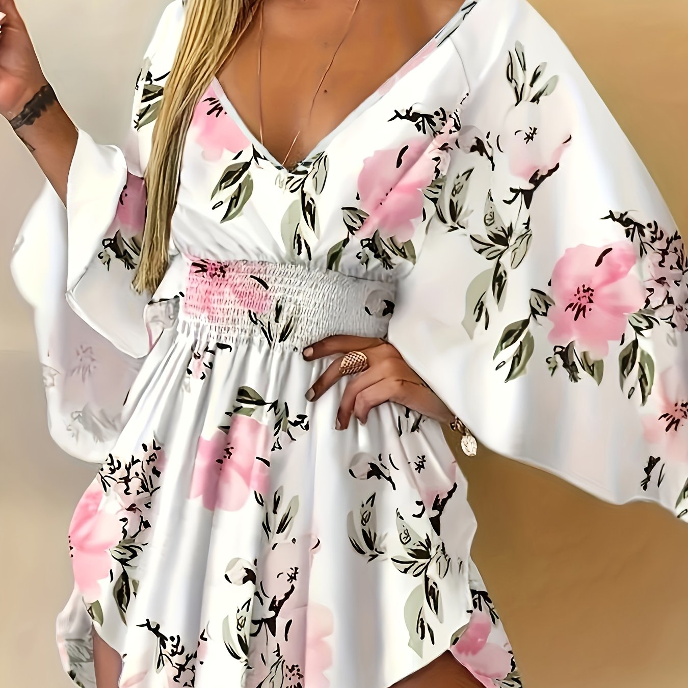 Bahor va yoz uchun bog‘dorchilik naqshli V-yuqori ko‘ylak, bog‘ichli bel va keng yenglar bilan.
