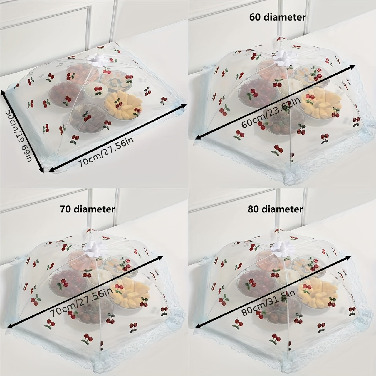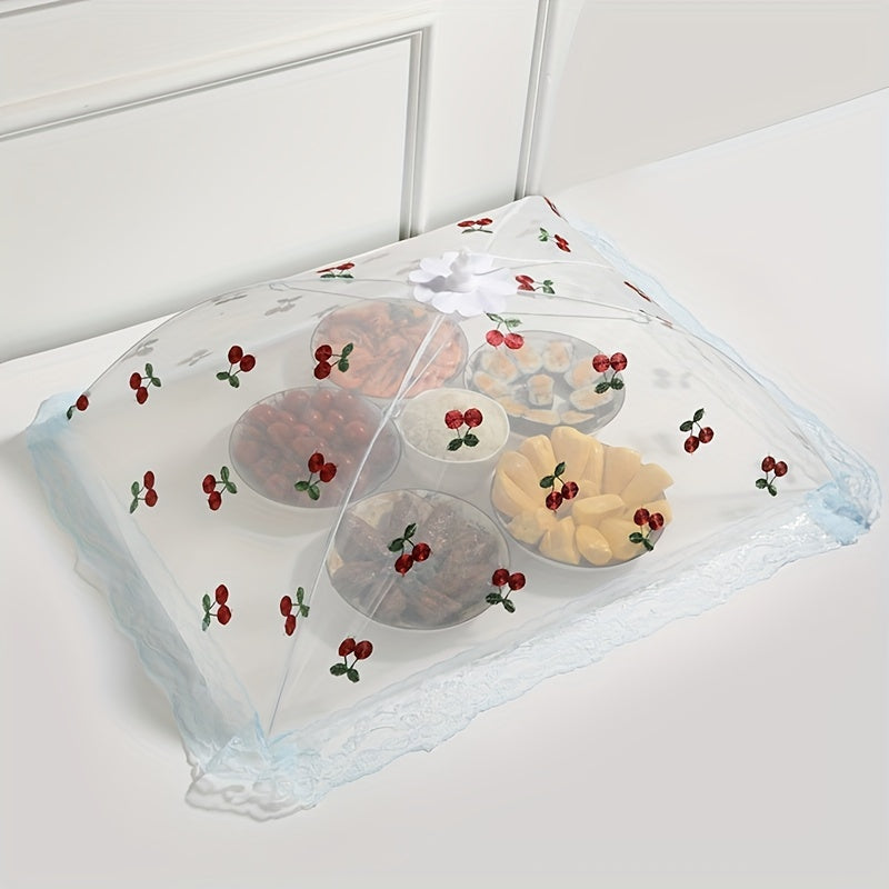 Cherries dizayni, dantel qirralari va bog'ich bilan egiluvchan oziq-ovqat qopqog'i, chivinlar va changdan himoya qiladi, oshxona va ovqatlanish uchun ideal.