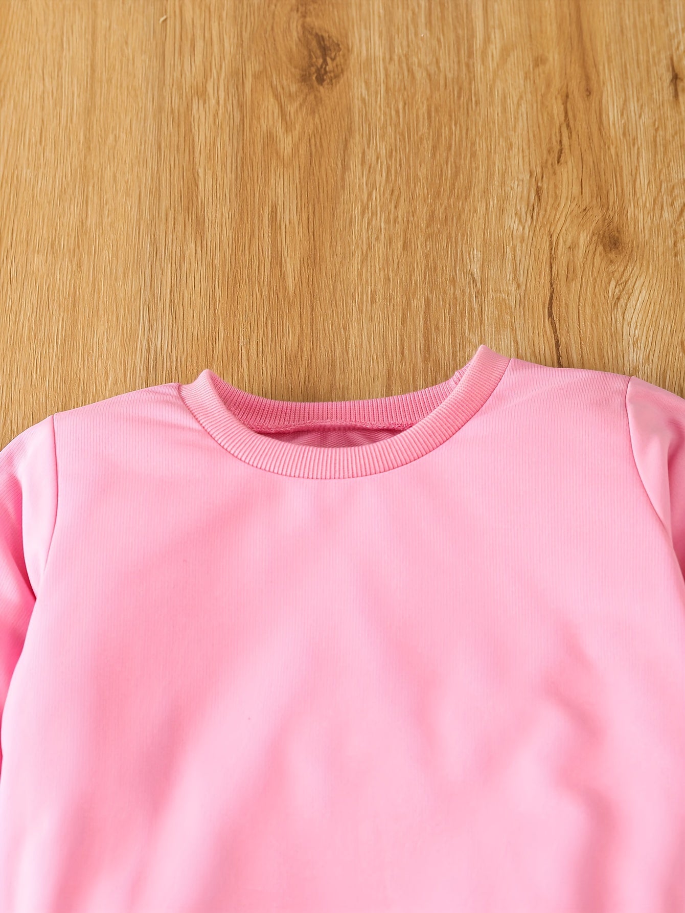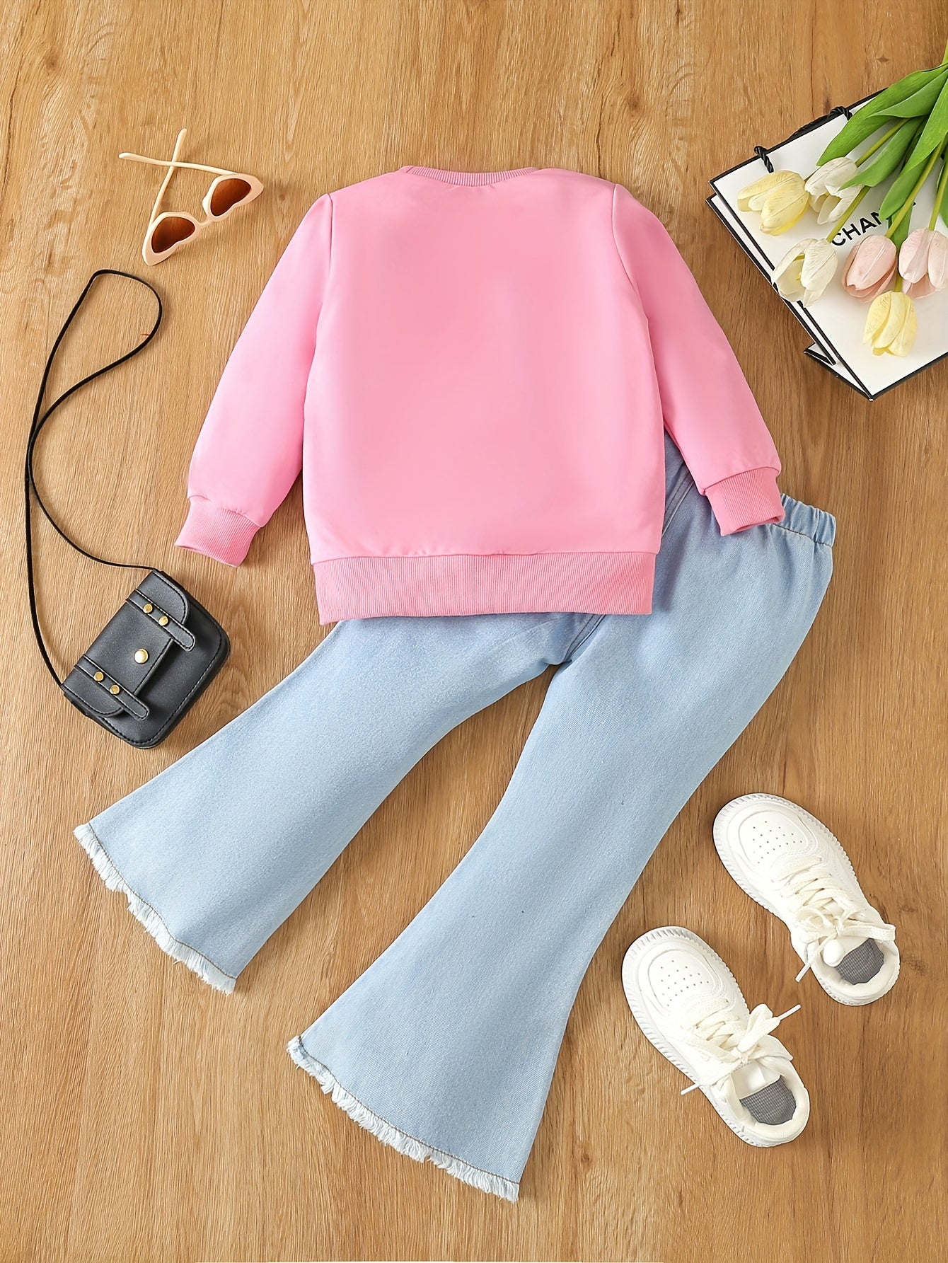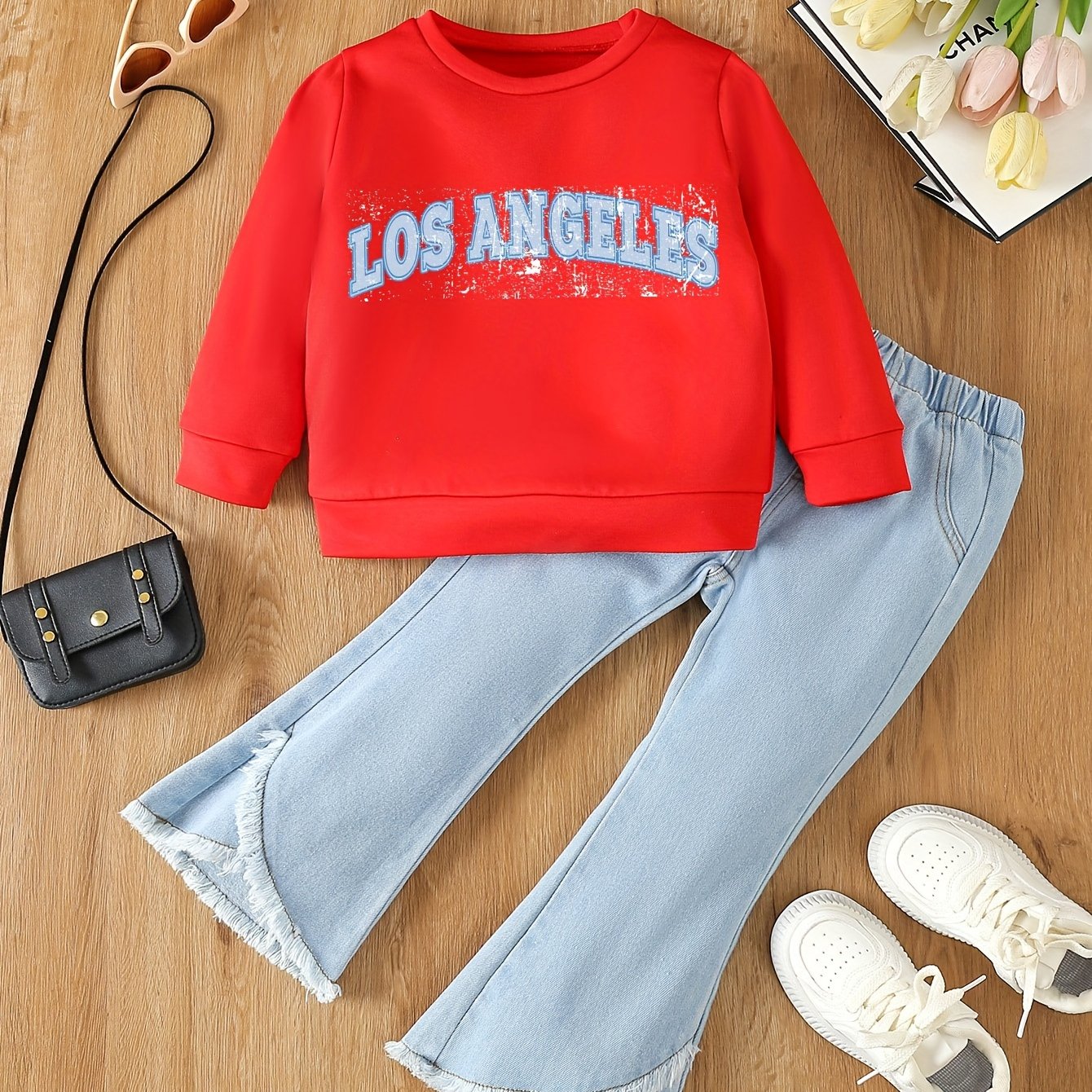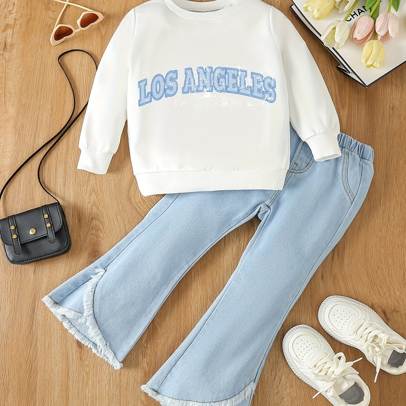 Qizlar uchun tasodifiy uslubdagi sviter, harf bosma va denim bell-bottom fringe shimlar to'plami bahor va kuz uchun