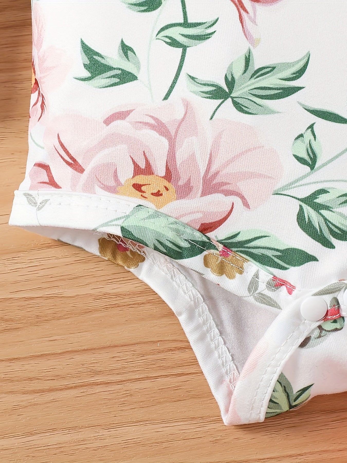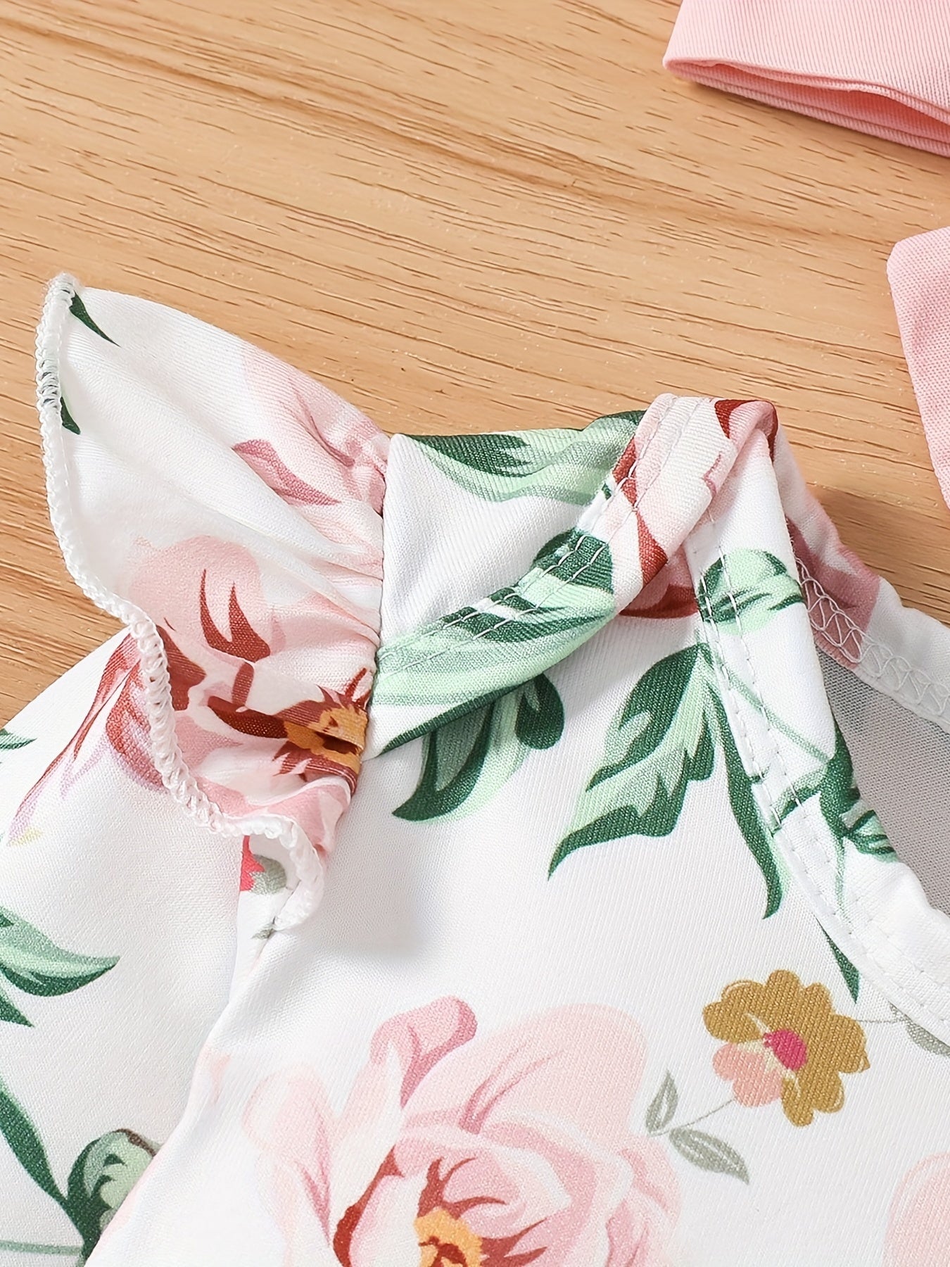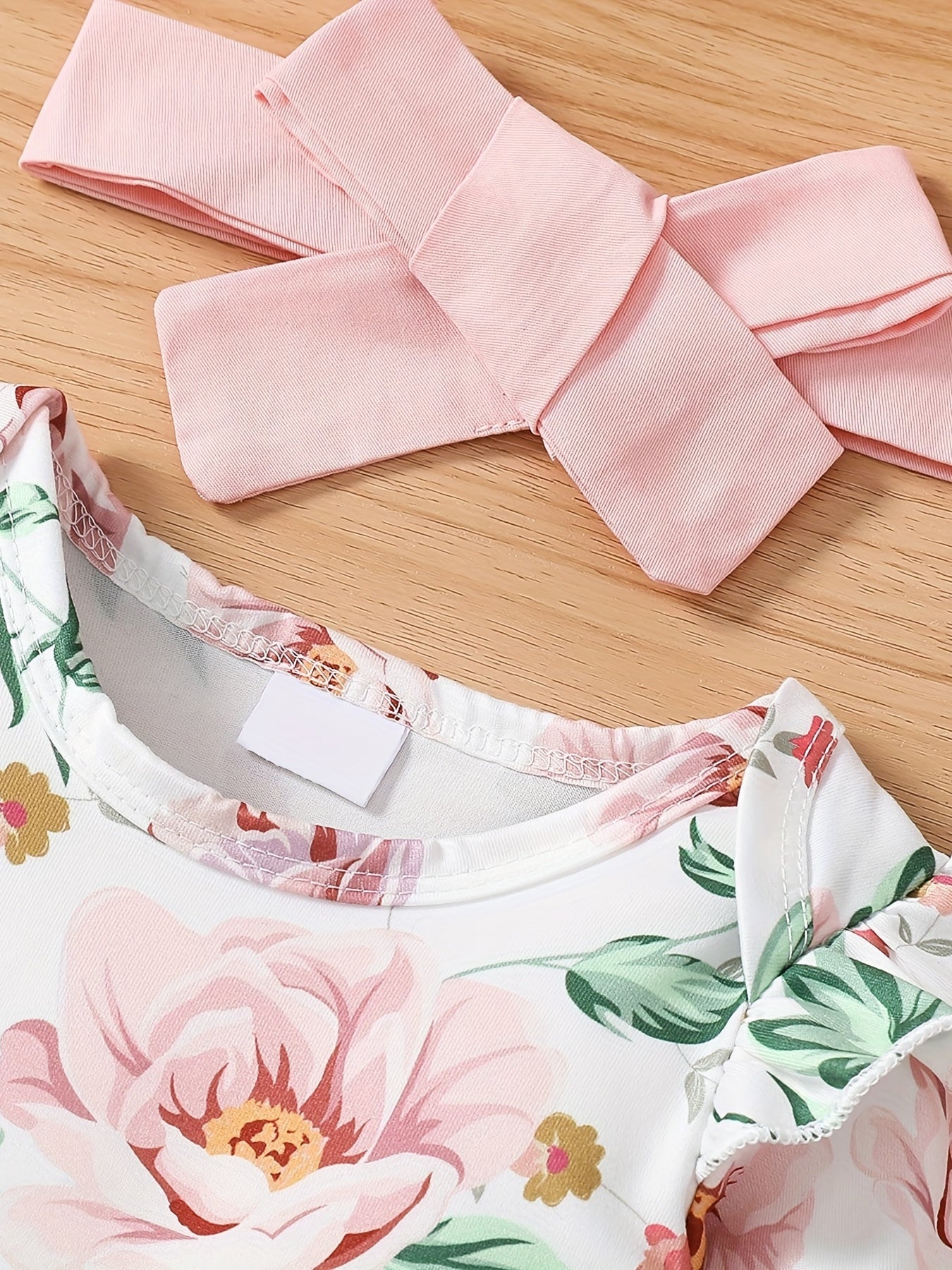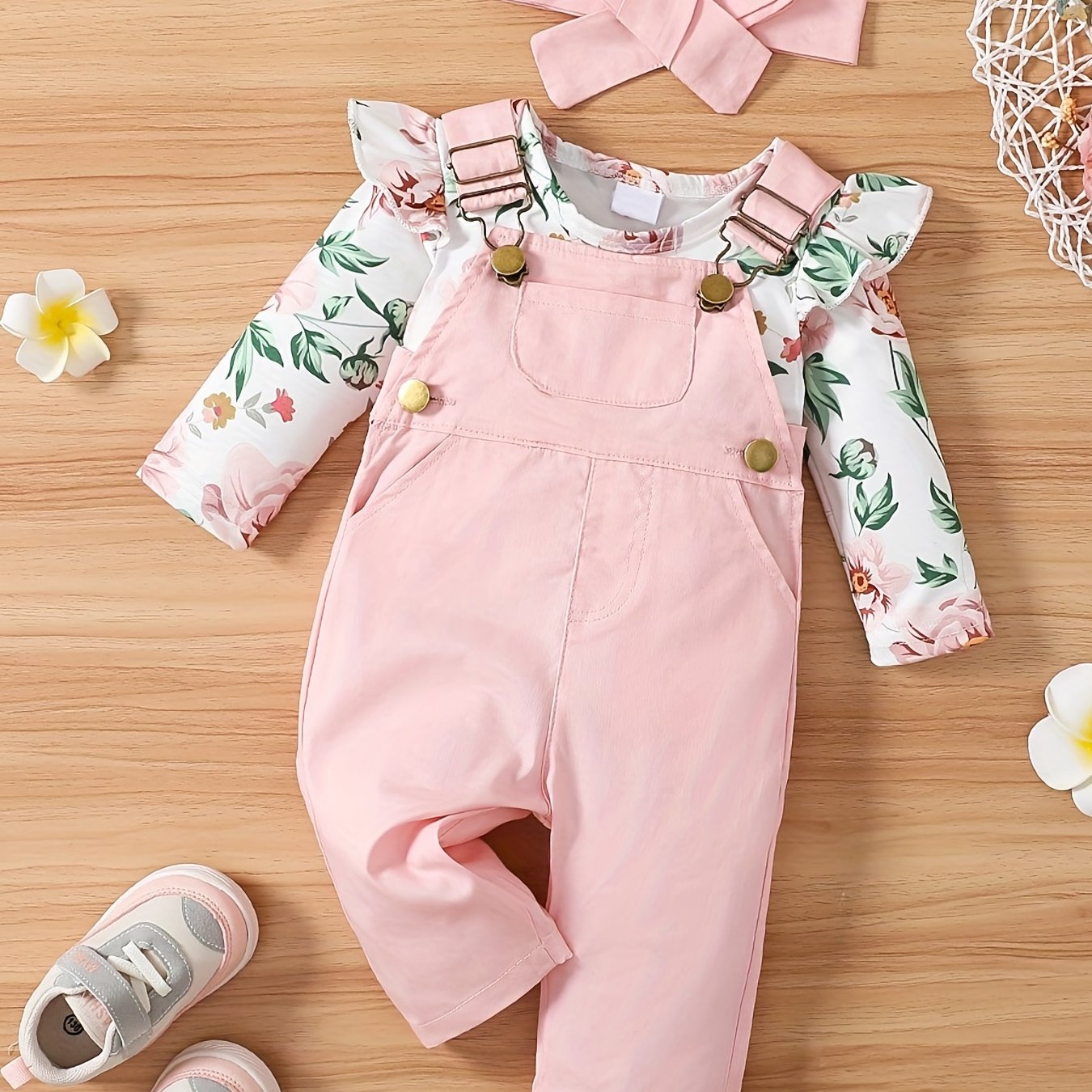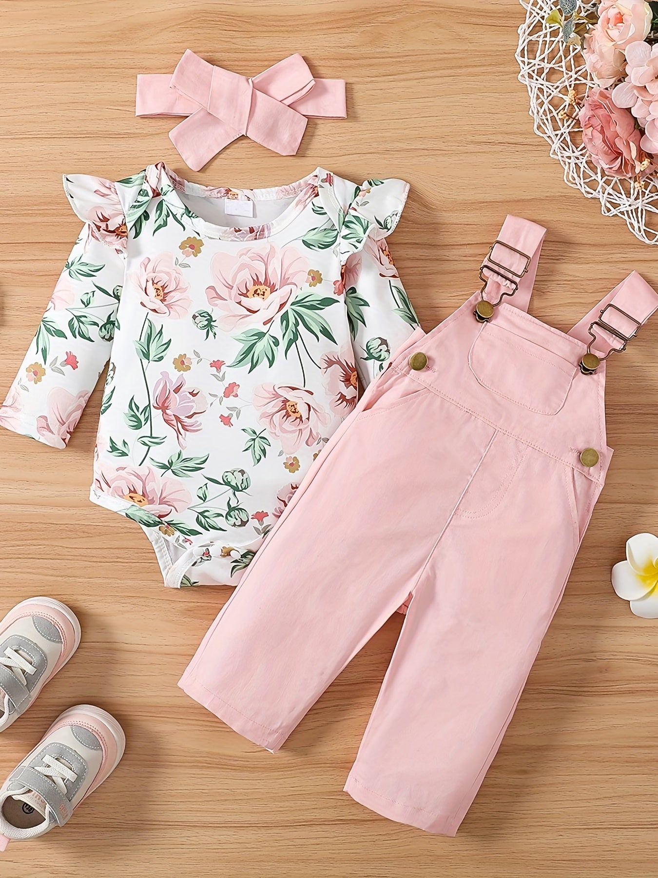 Qizlar uchun 3-qismli paxta to'plami, cho'ziladigan kamarli cho'ntakli shimlar, ruffle yelkalari bilan gullar naqshidagi uzun qo'lqonli romper va kamonli boshbandni o'z ichiga oladi. Bahor/kovakda ochiq havoda kiyish uchun mukammal.