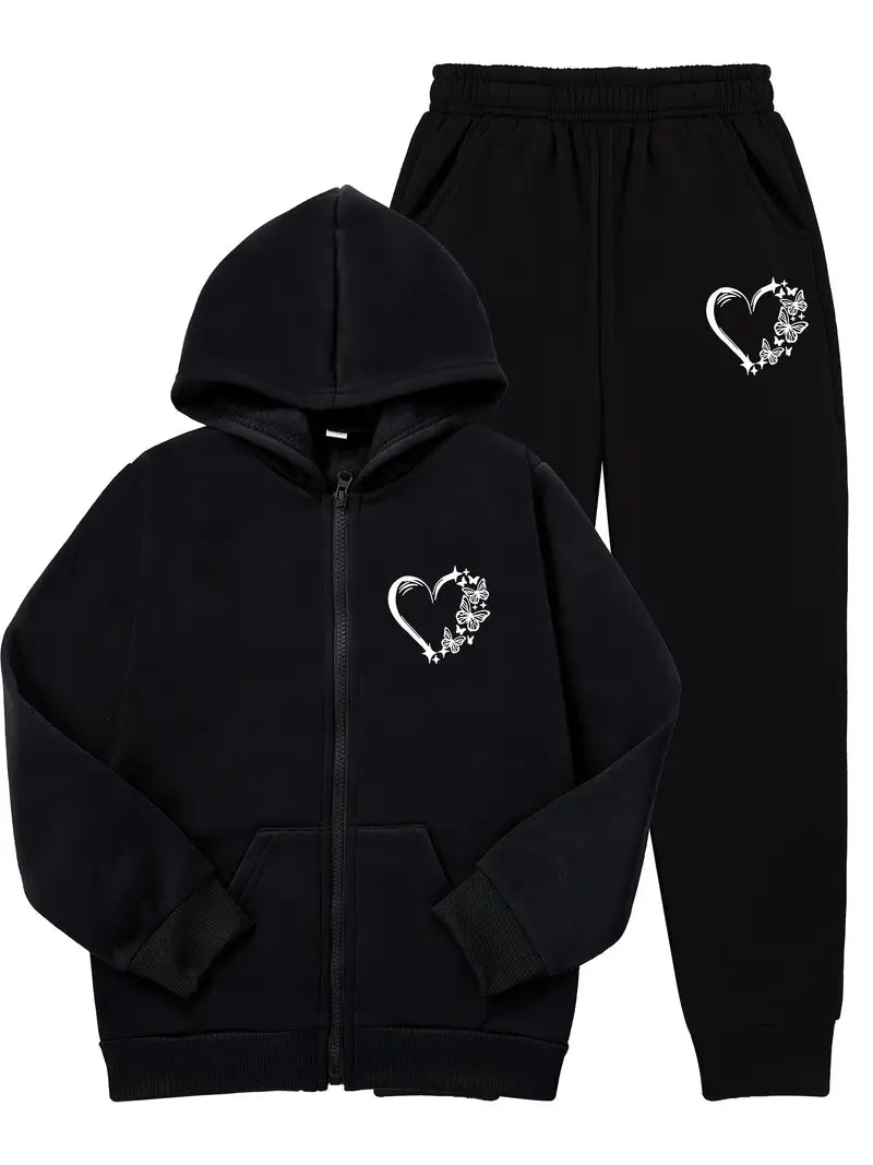 Qizlar uchun tasodifiy kapalak va yurak naqshli kapüşonli kurtka va sport shimlari to'plami, polyester to'qima matodan tayyorlangan, biroz cho'ziluvchan. Bahor/kovakda har kuni kiyish uchun uzun qo'lqonli odatdagi sport kiyimi.